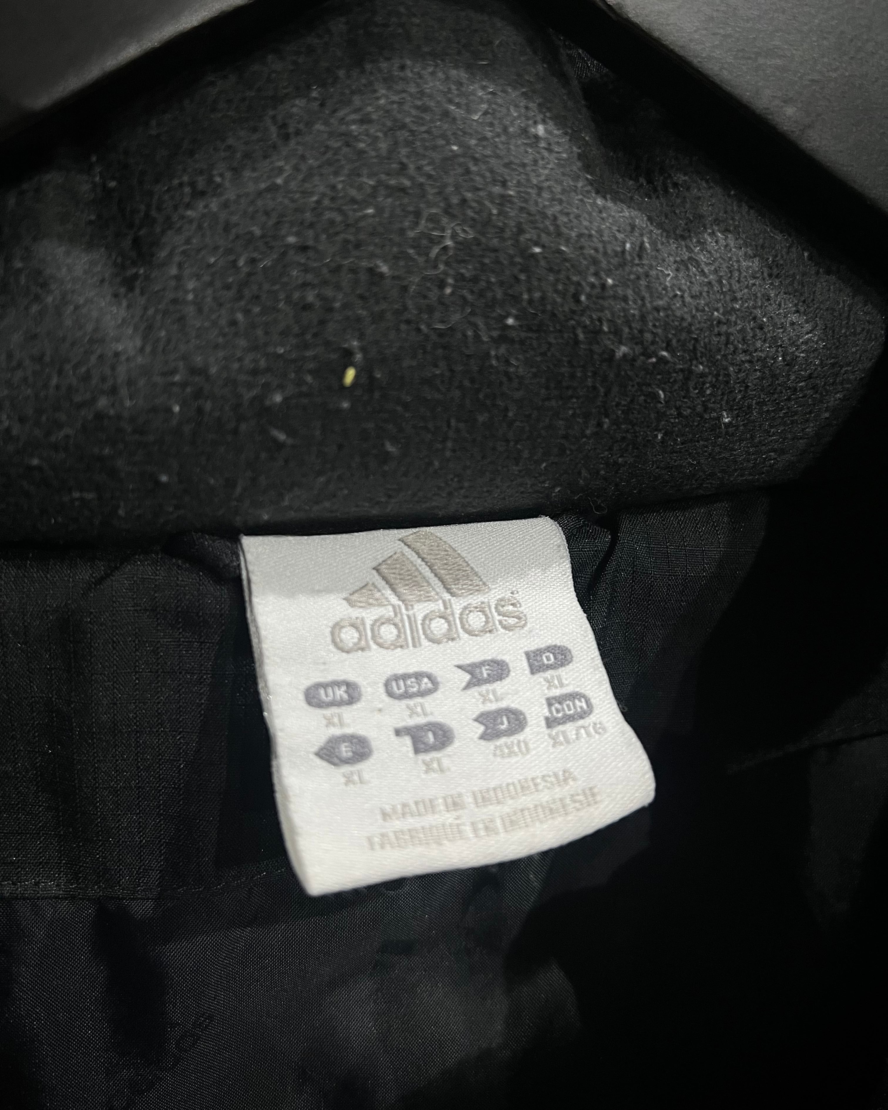 フロントはシンプルなジップ仕様、胸元にはホワイトのadidasロゴを配置。両袖に走るスリーストライプスが、モノトーンの中でしっかりとブランドアイデンティティを主張しつつ、全体のバランスを引き締めています。