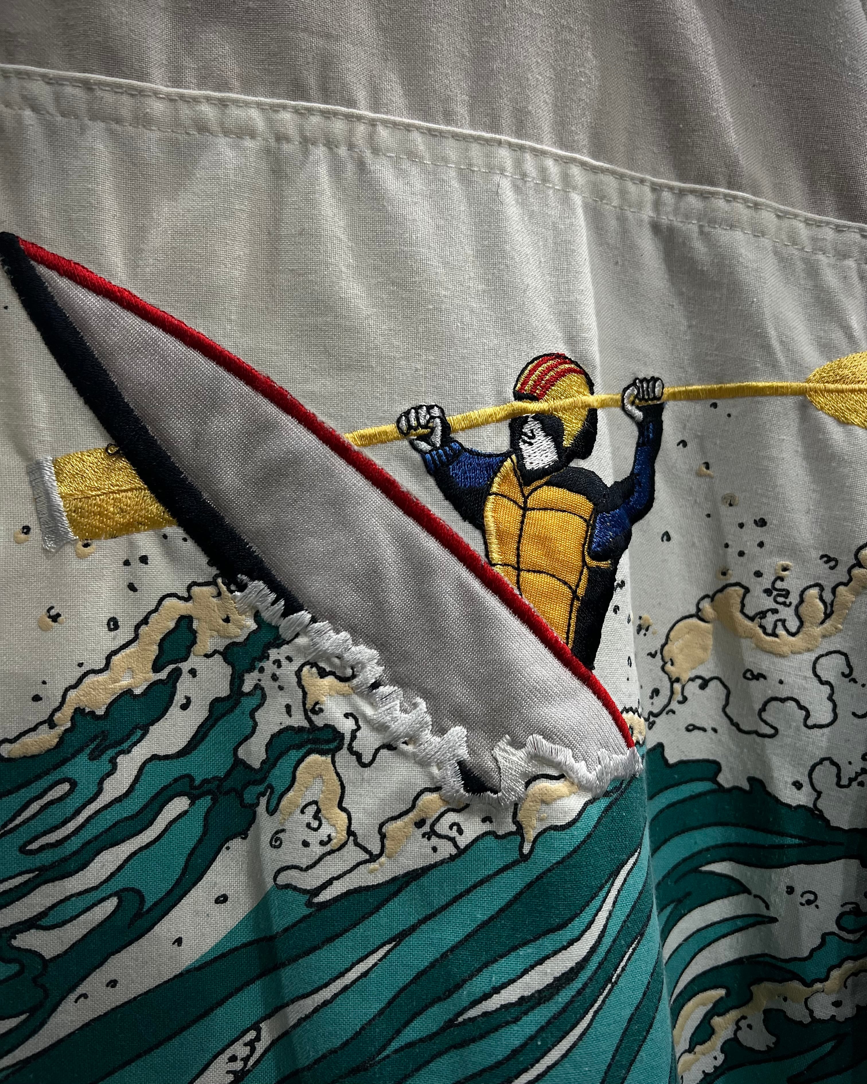 ホワイトをベースに、グリーン、ターコイズの切り替え、そしてそのキャンバスいっぱいに描かれているのは、荒波を乗りこなすカヤッカーのグラフィック。水しぶきが立ち上がる波の動きや、パドルを掲げる人物の躍動感まで細かく描写されており、プロダクトのクオリティの高さを感じられます。