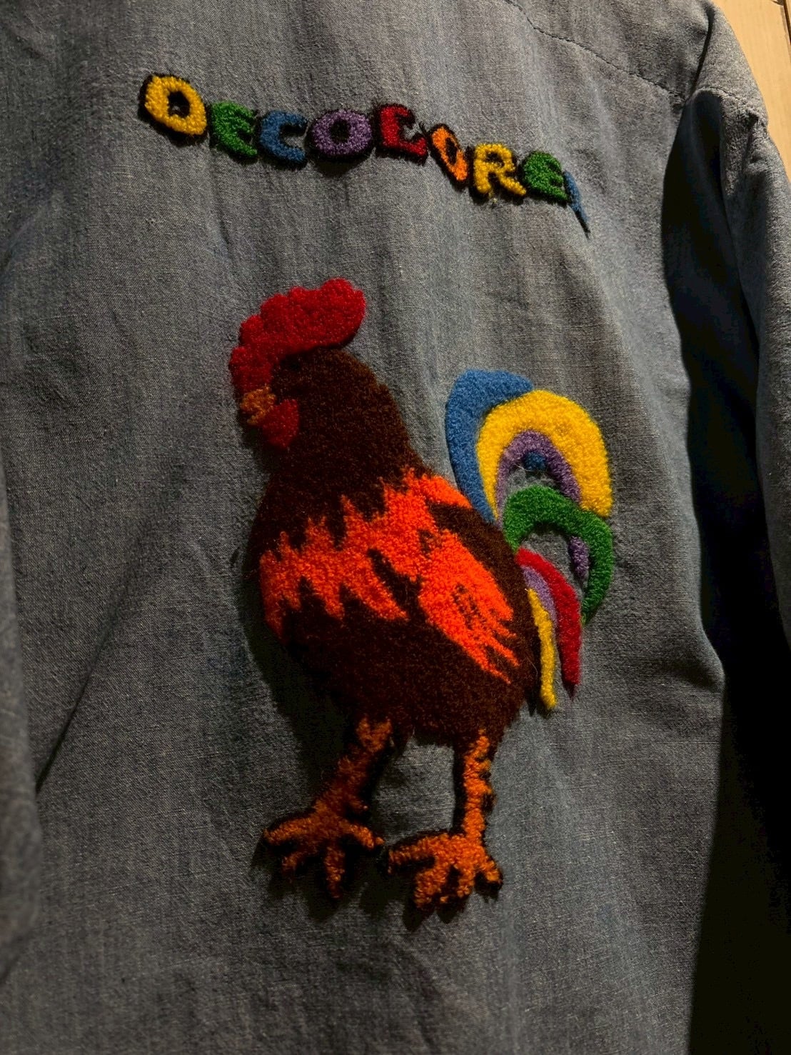 最大のポイントは背面に施されたワッペンのカスタムで、カラフルな配色で表現された鶏のモチーフが、ベーシックなボディに強烈な個性をプラス。