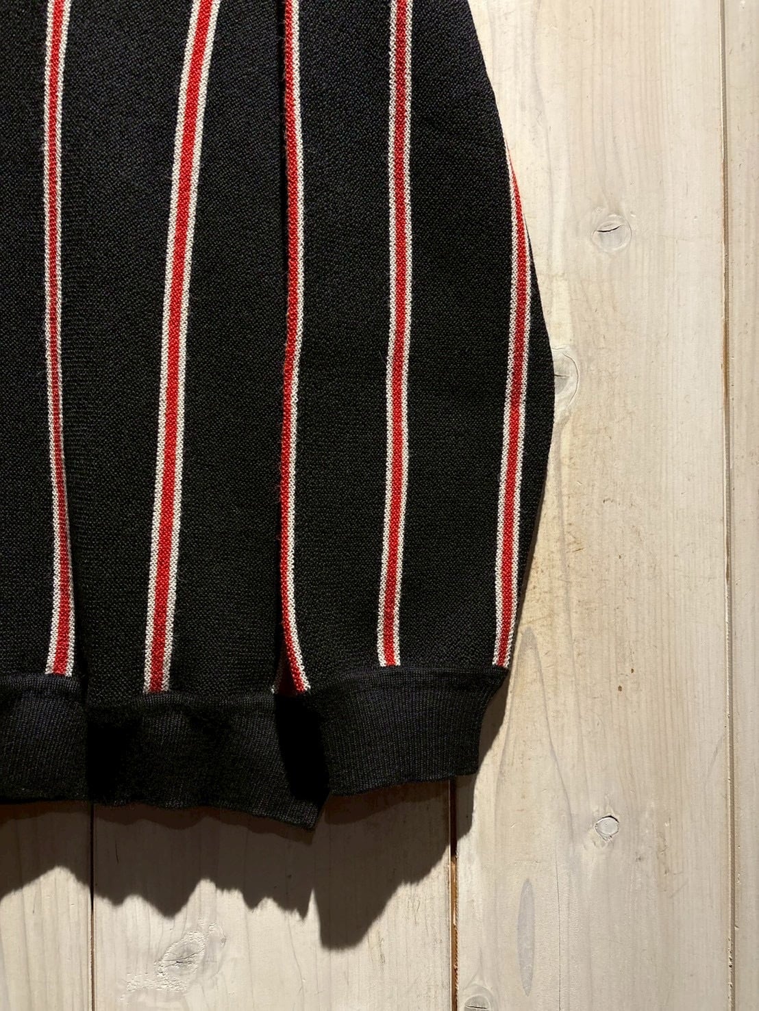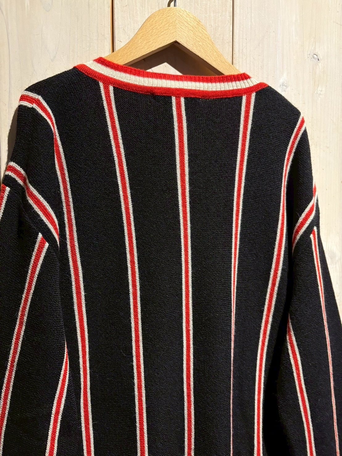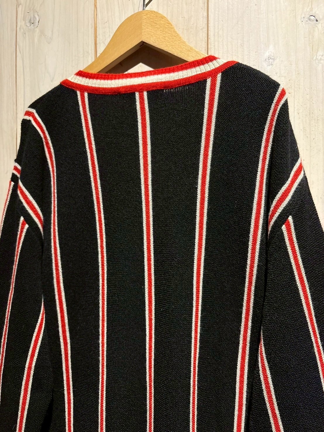 ブラックボディをベースに、レッド×ホワイトのストライプを効かせたVネック仕様のニット。スポーティーでありながら、品のある配色バランスが秀逸ですね。