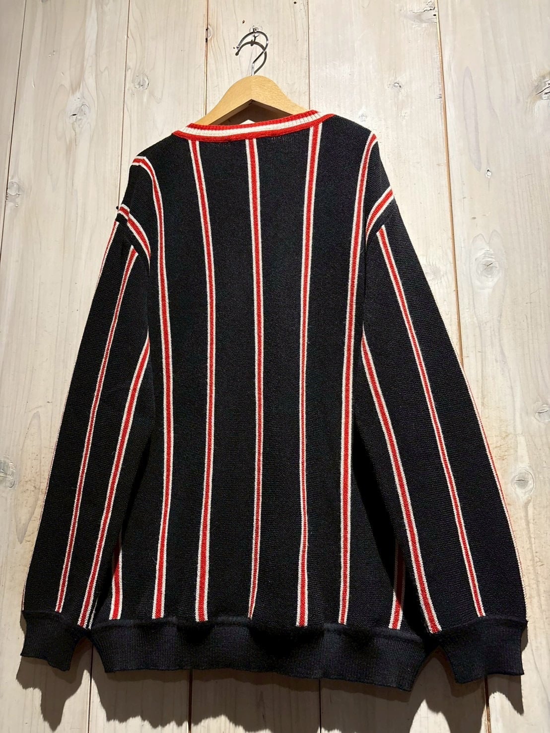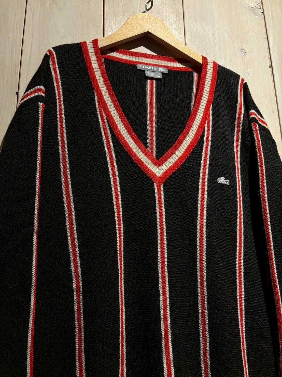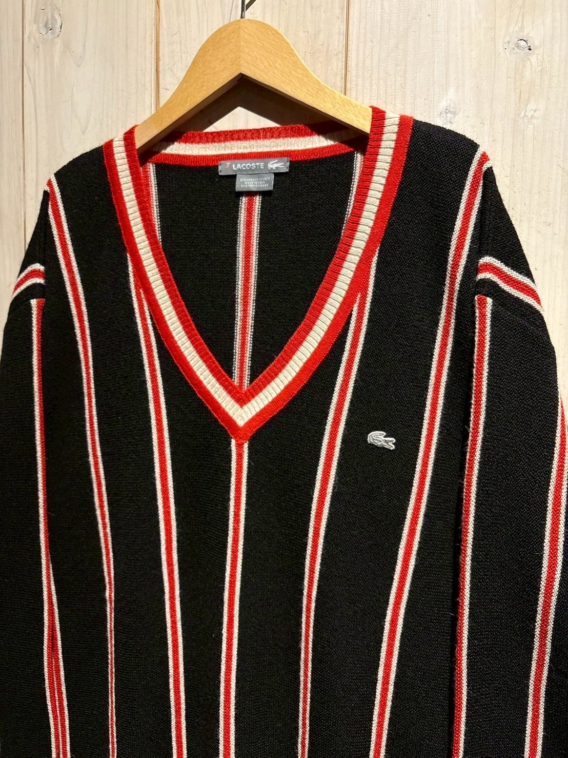 ブラックボディをベースに、レッド×ホワイトのストライプを効かせたVネック仕様のニット。スポーティーでありながら、品のある配色バランスが秀逸ですね。