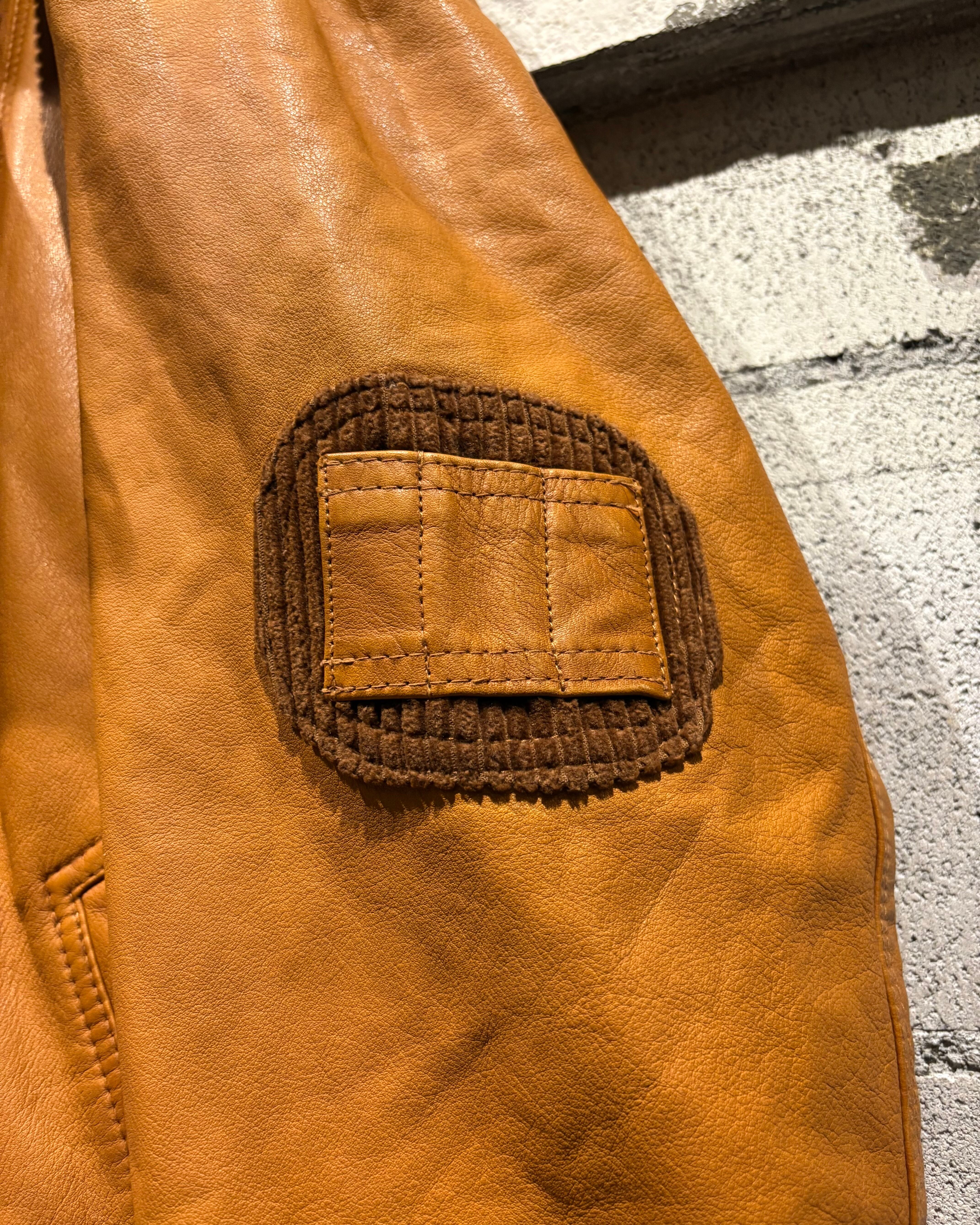 武骨なムードを感じさせるパターンに、しなやかでコシのあるオレンジレザーを用いることで、ハードになりすぎないファッショナブルなバランスに仕上げられています。