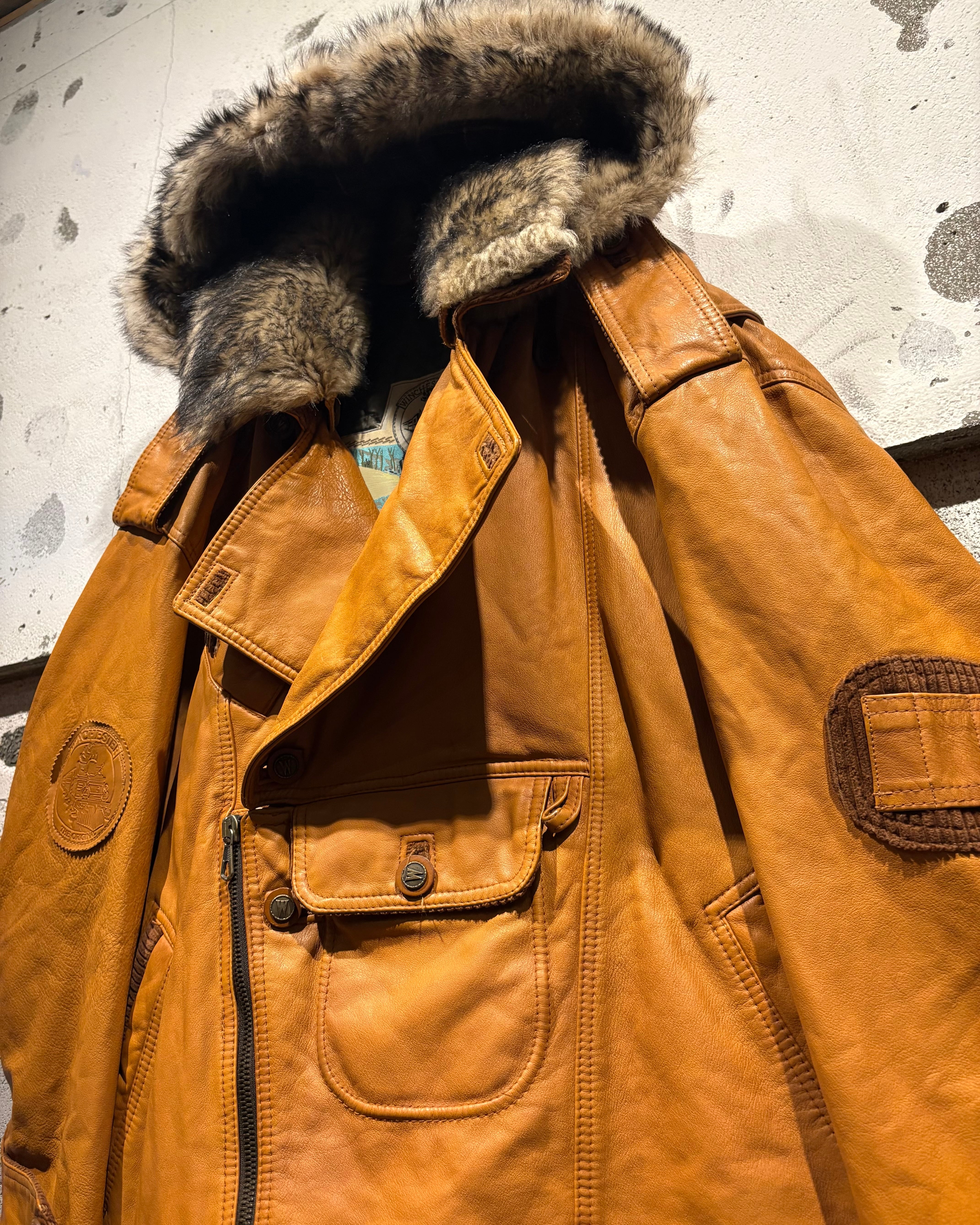 ボリューム感のあるファー付き襟とフードがそれぞれ取り外し可能な仕様になっており、フル装備で着用すればヘビーアウターとしての迫力を存分に楽しめ、ファーやフードを外せばよりミニマルで洗練されたレザージャケットとしても着用可能。