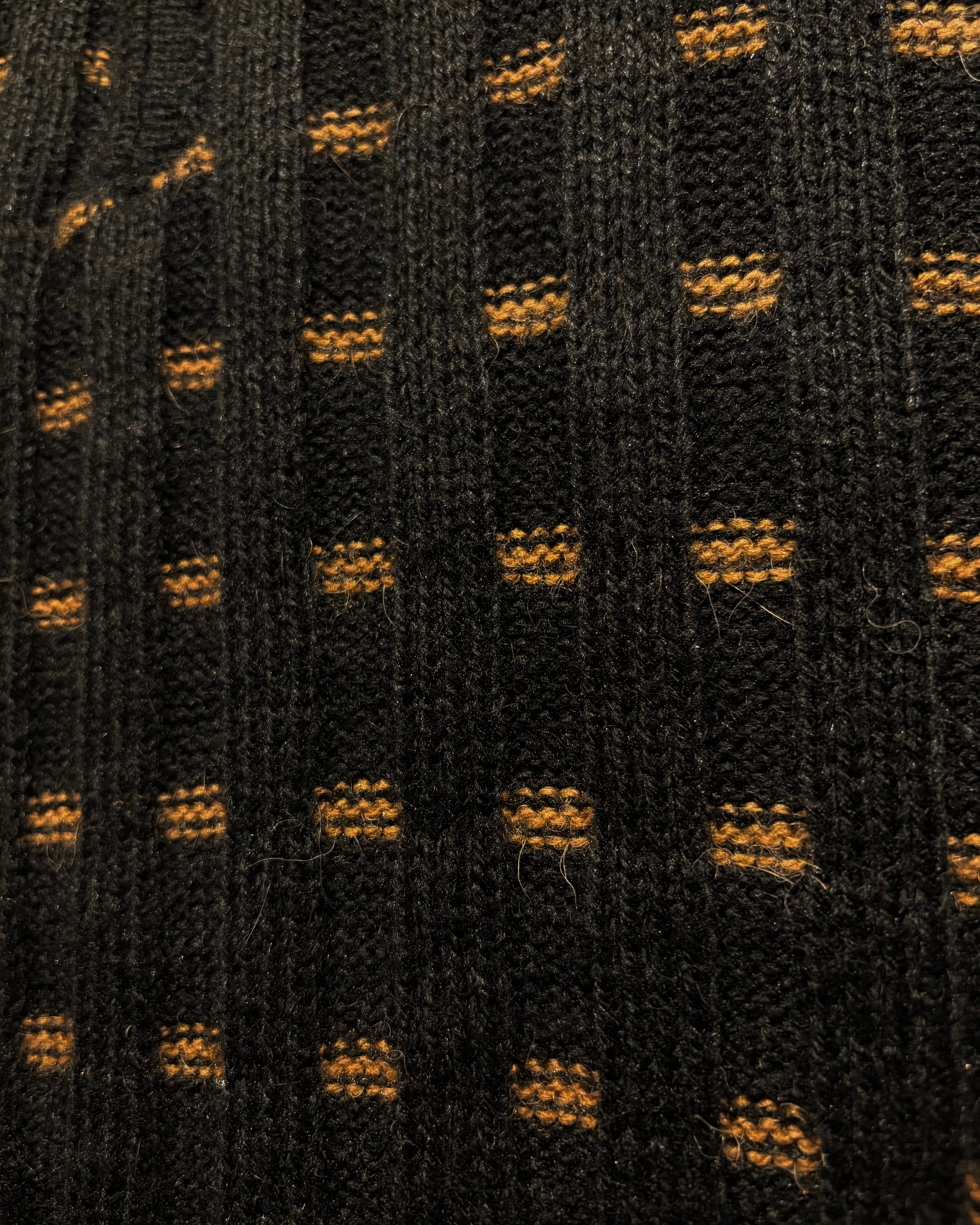 ボディ全体には立体的なニッティングによって格子柄を表現。凹凸のある編地でデザインされているため、奥行きのある仕上がりとなっています。ブラック×ベージュの配色バランスも◎