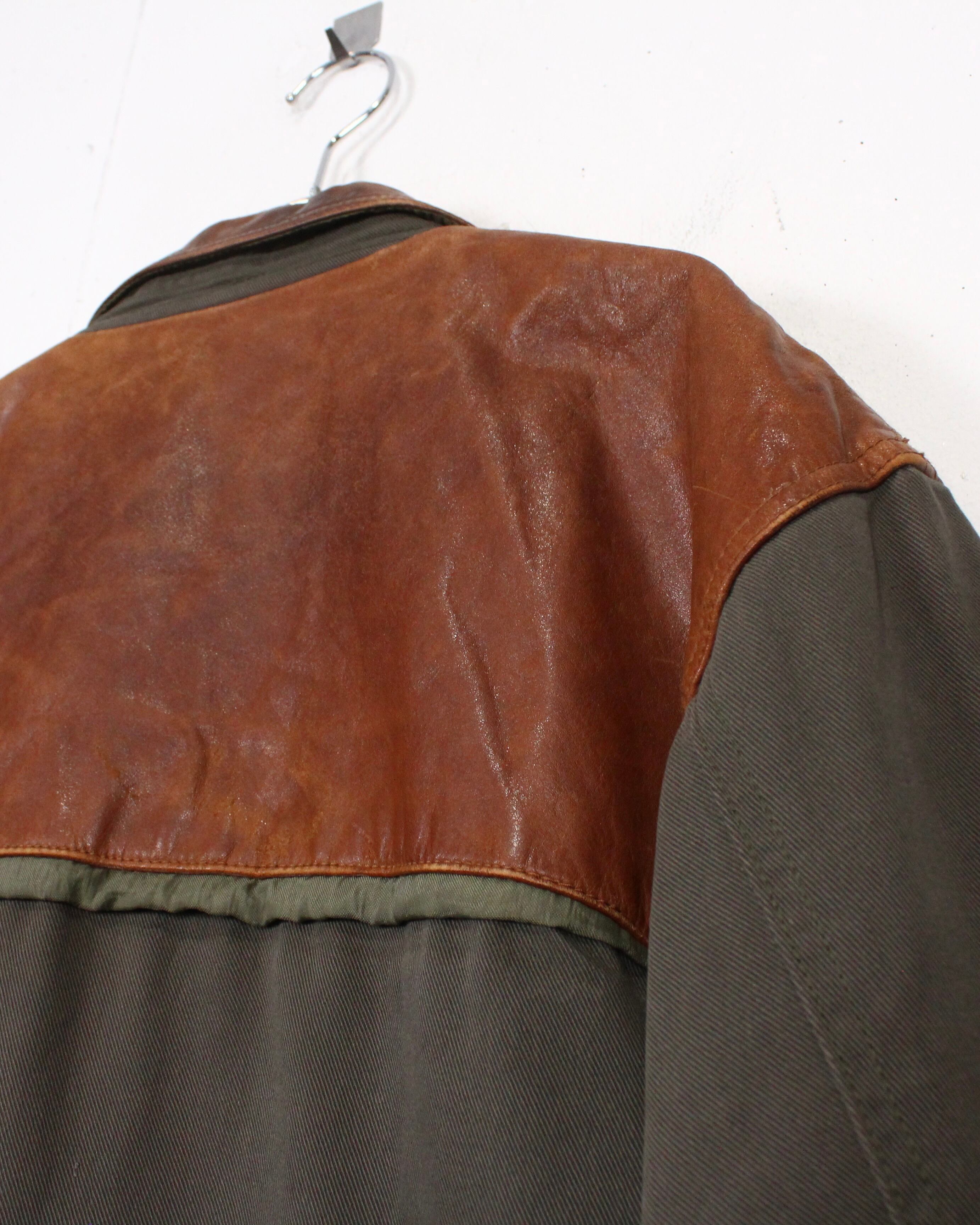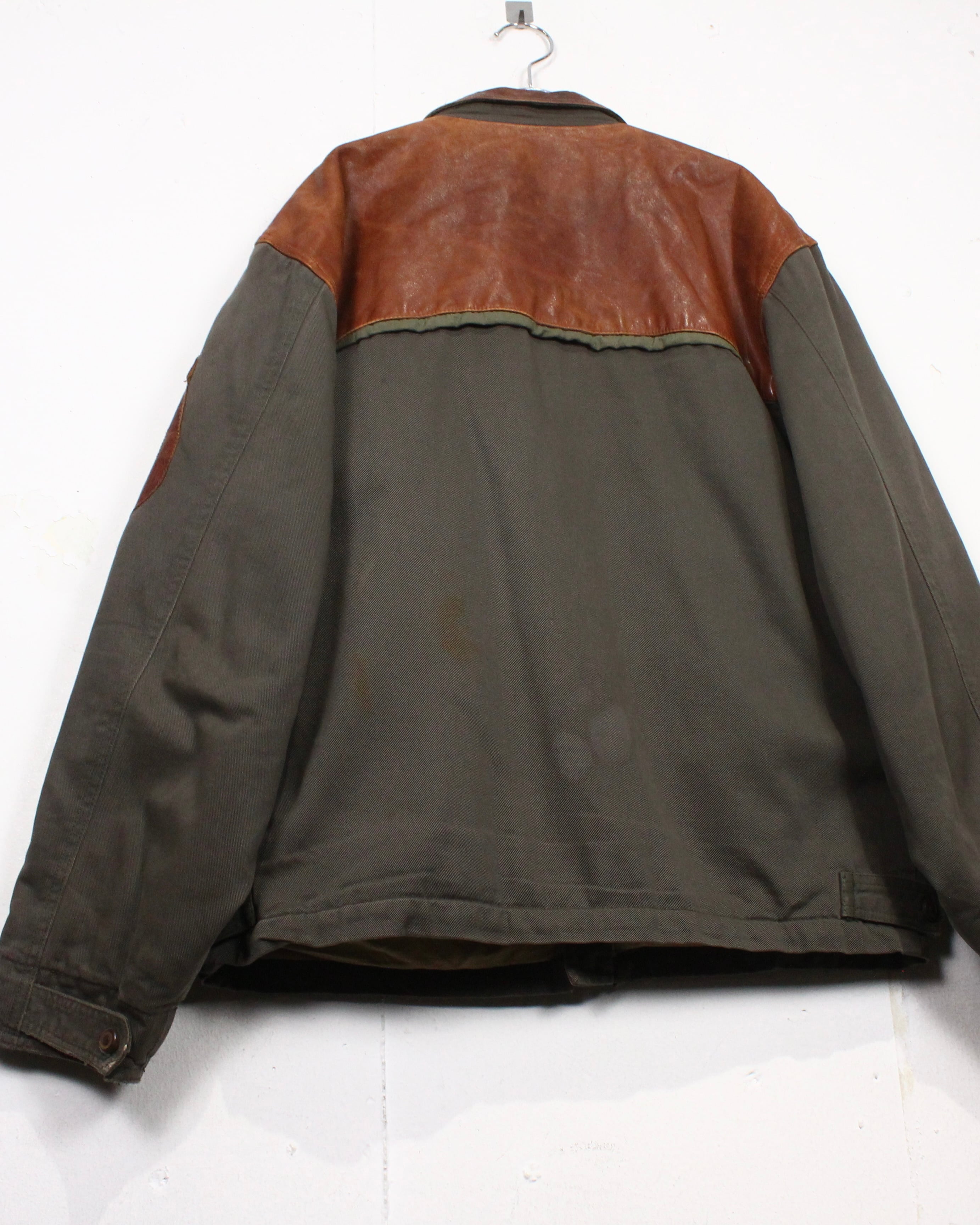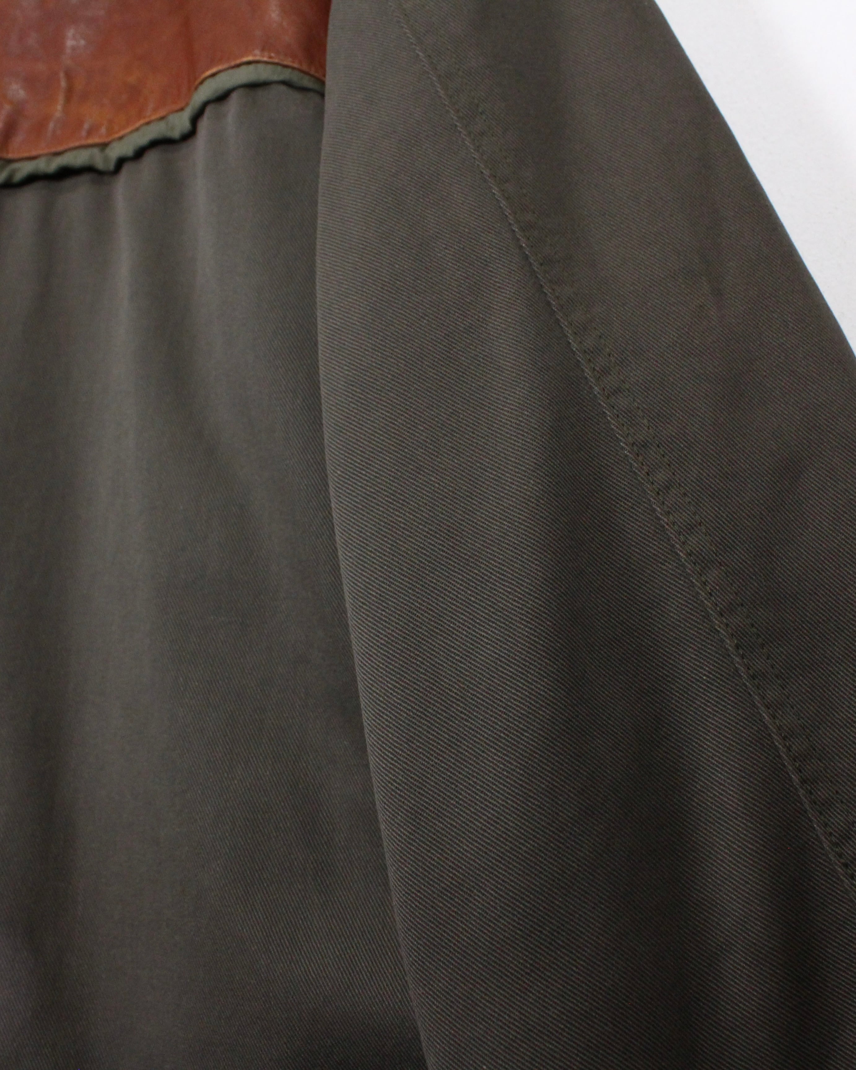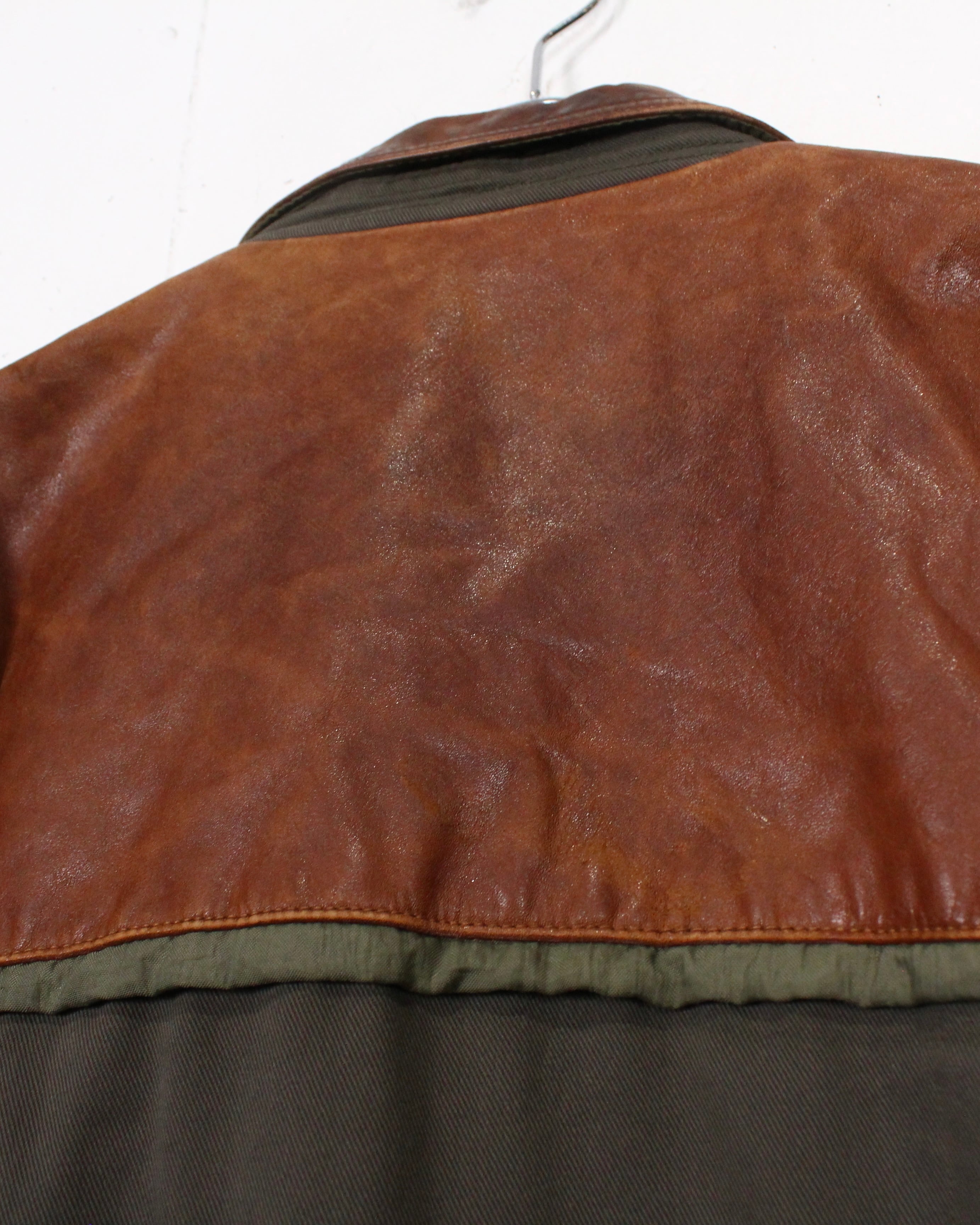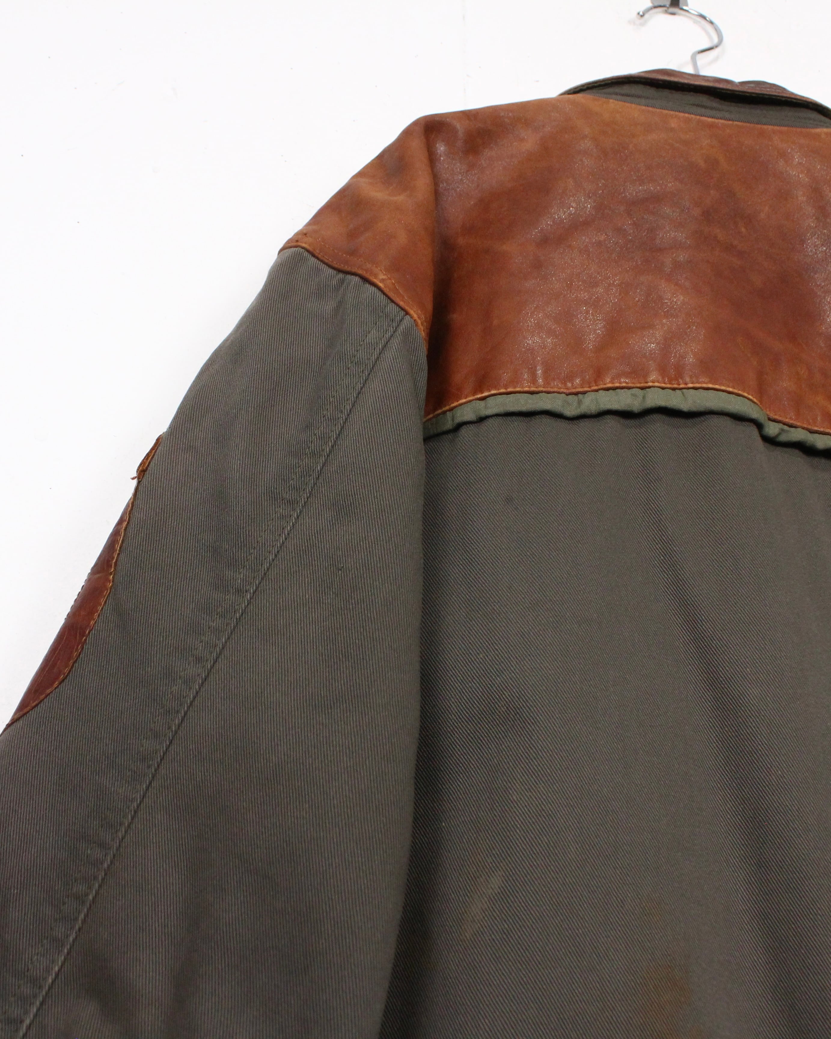 ボディにはタフで表情のあるツイル生地を採用し、肩やヨークに配されたレザーが、無骨さと奥行きをプラス。着用を重ねたことで生まれたレザー特有のシワや色ムラがヴィンテージならではの雰囲気をしっかりと纏っています。