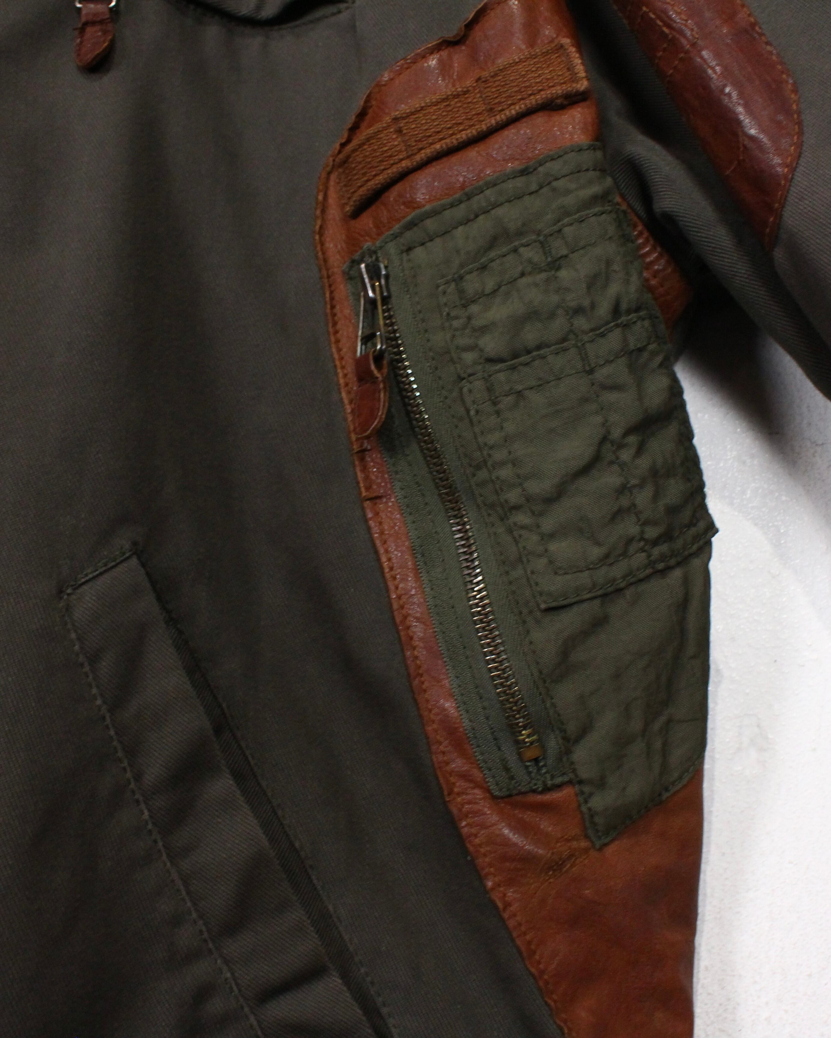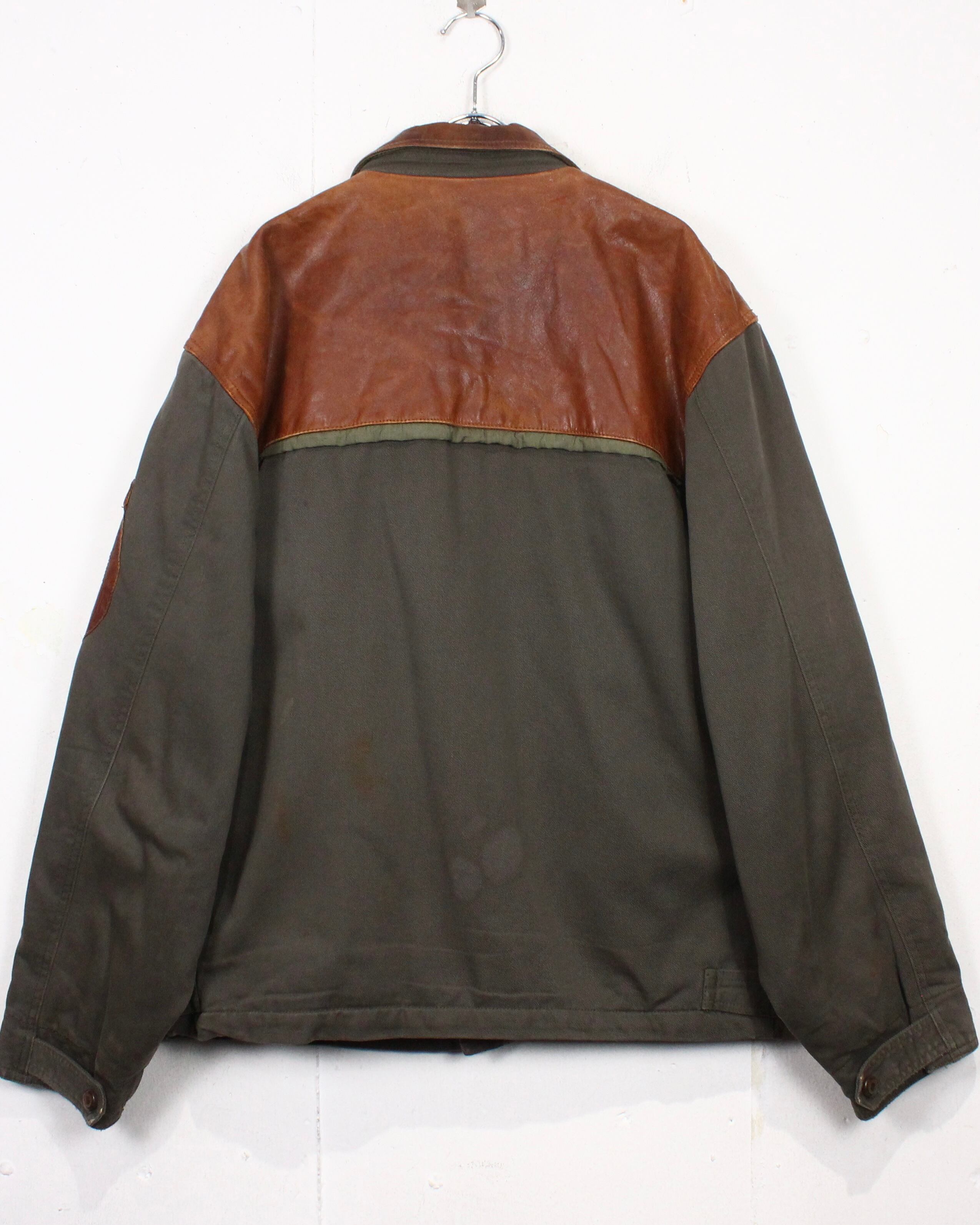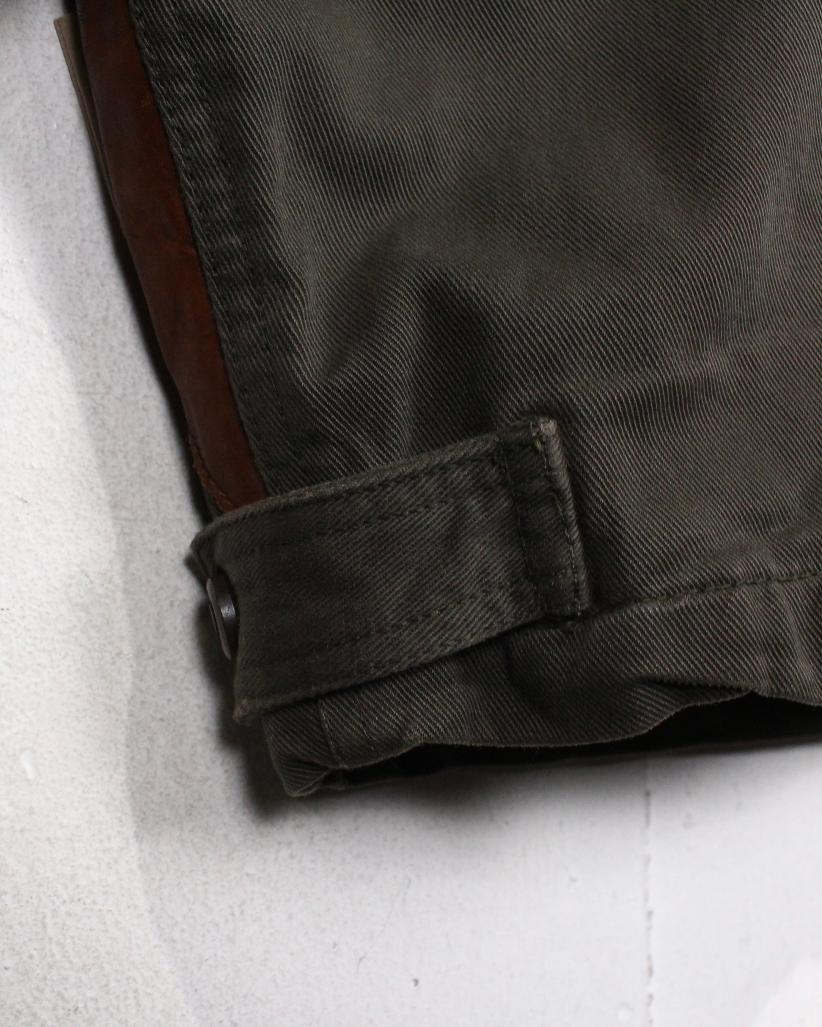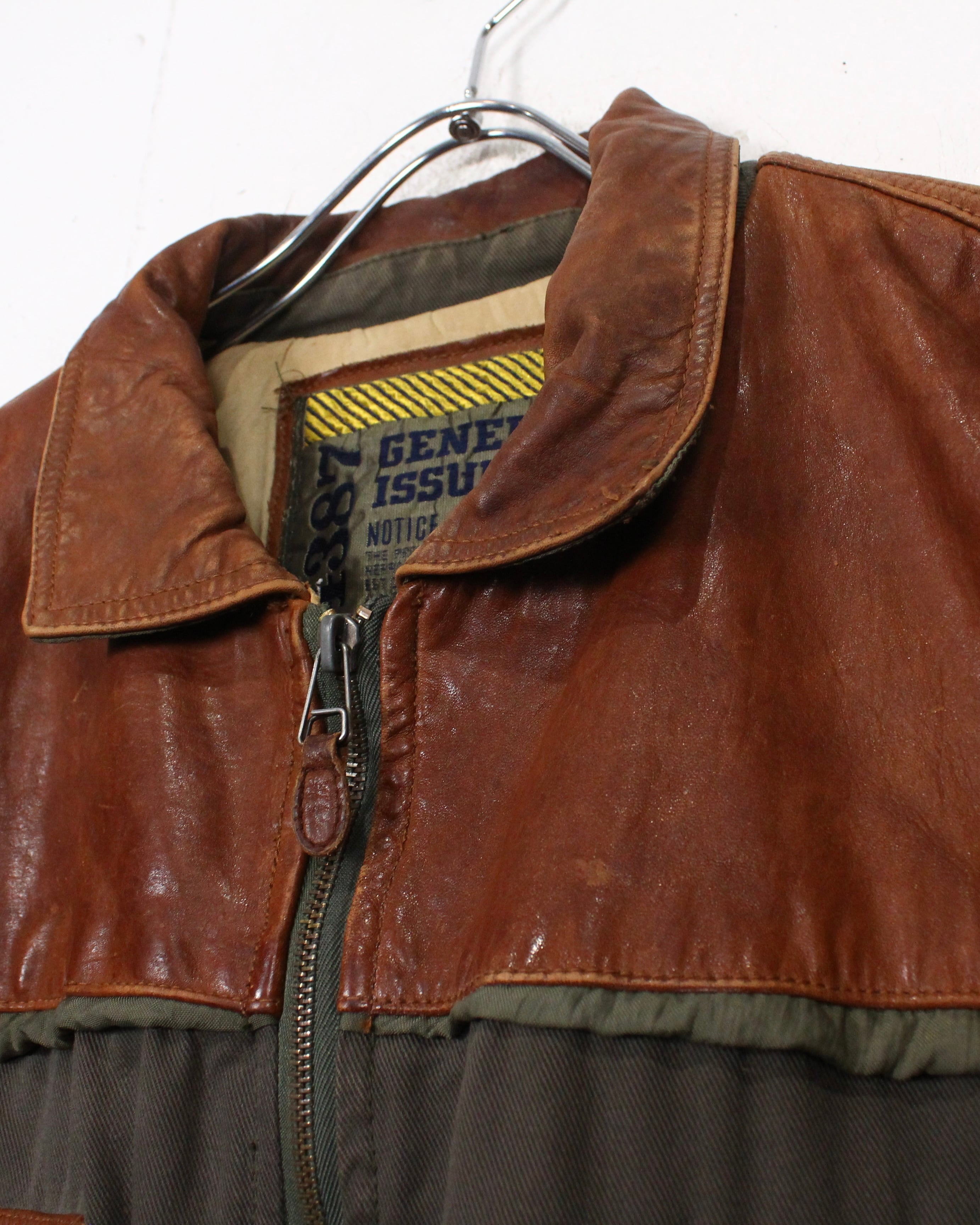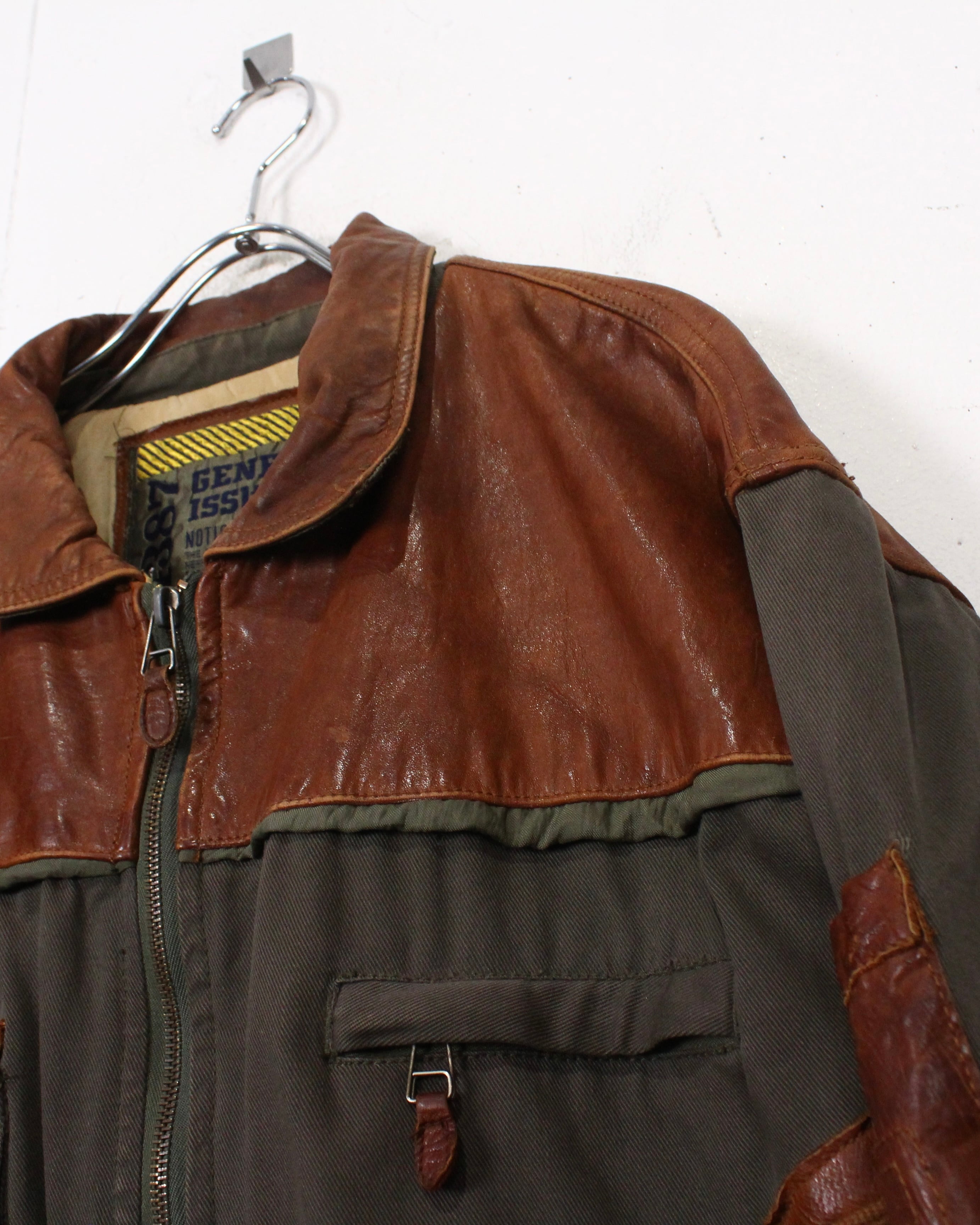 ボディにはタフで表情のあるツイル生地を採用し、肩やヨークに配されたレザーが、無骨さと奥行きをプラス。着用を重ねたことで生まれたレザー特有のシワや色ムラがヴィンテージならではの雰囲気をしっかりと纏っています。