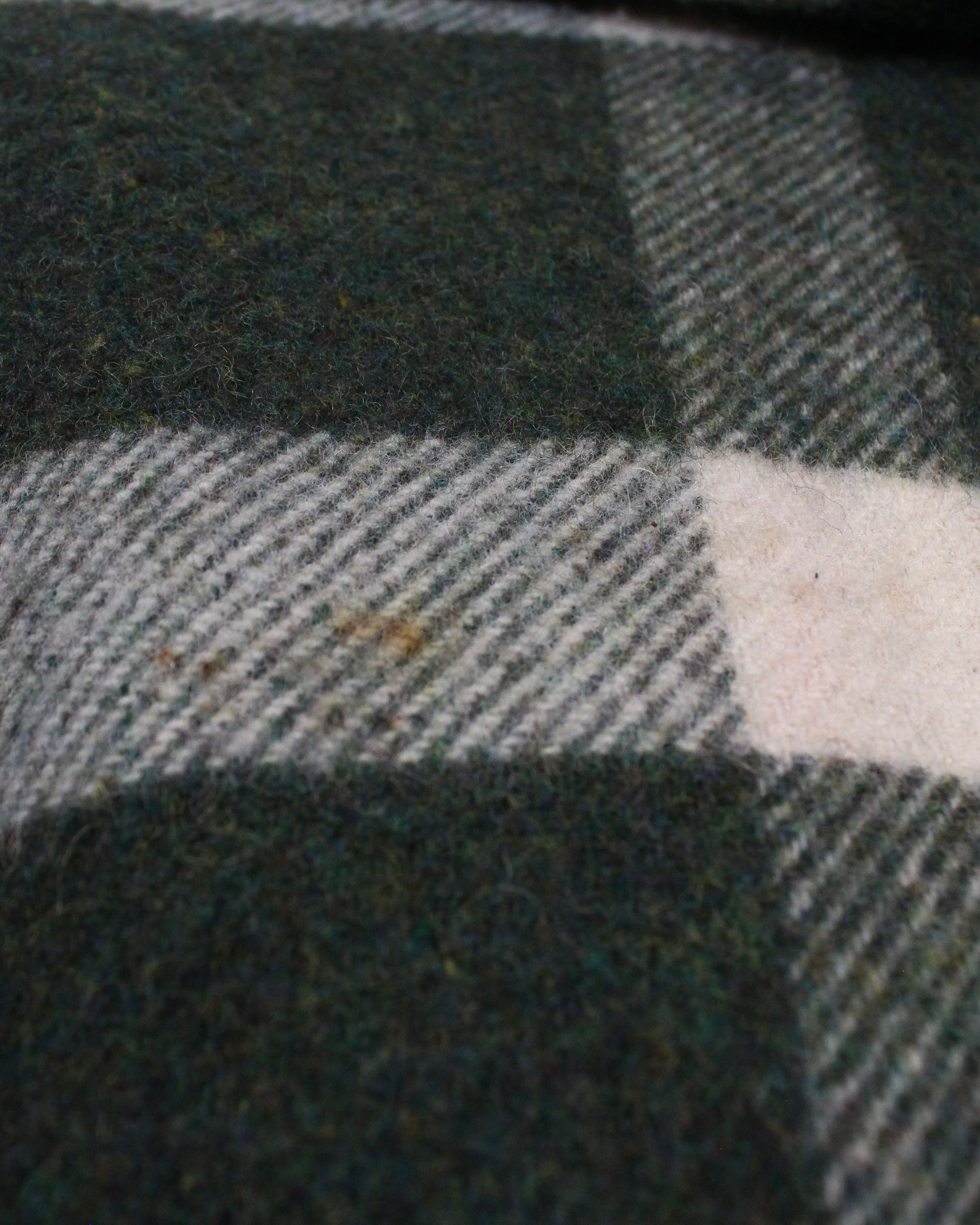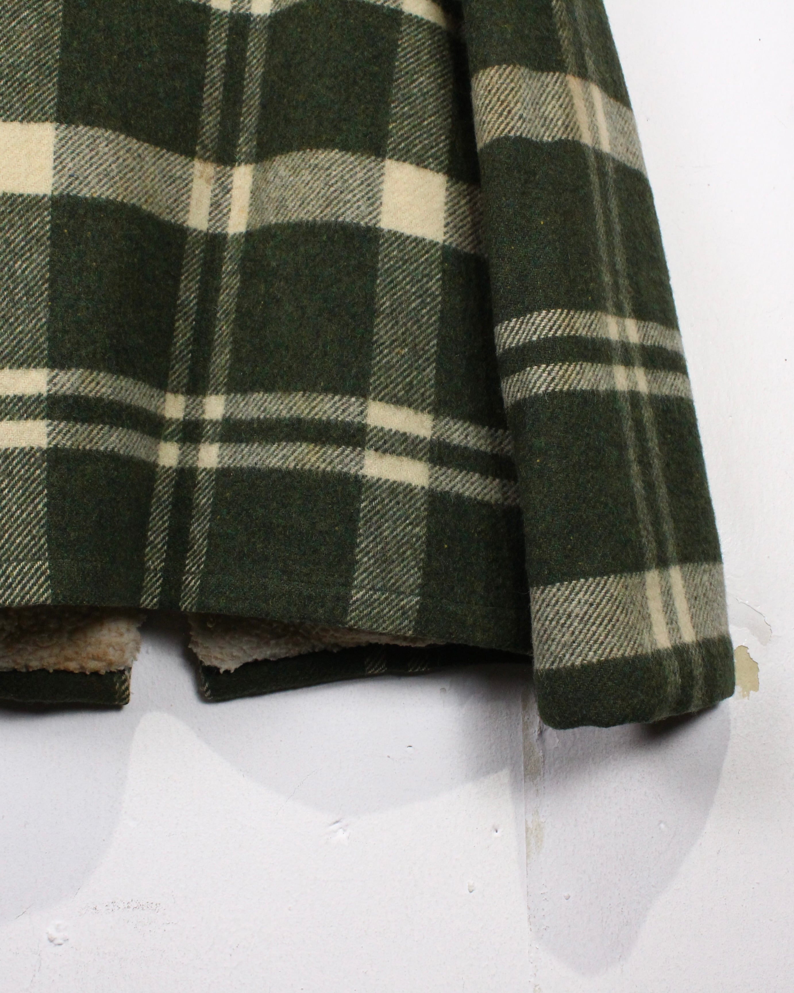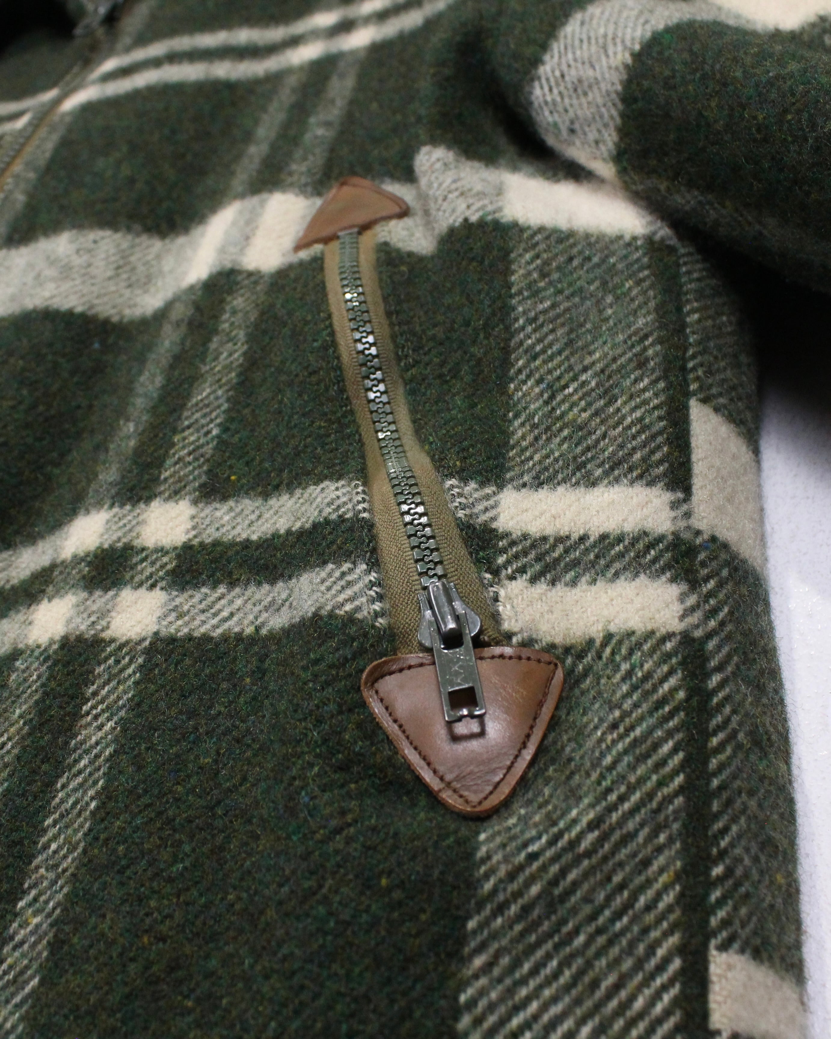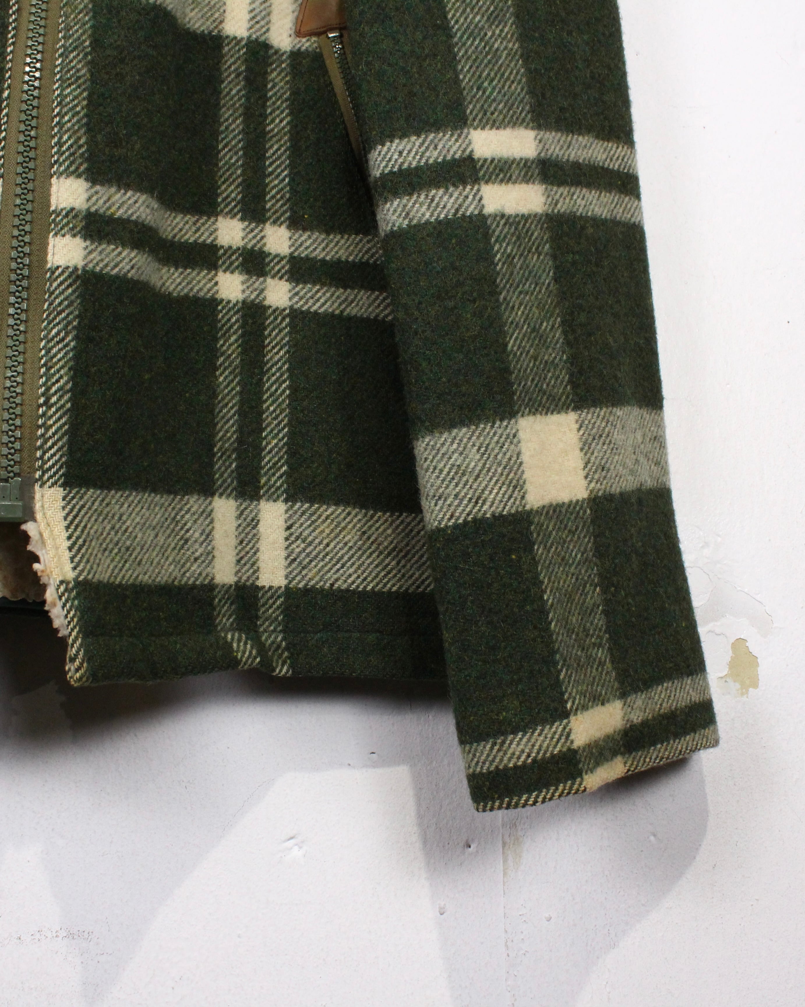 ボディにはしっかりとした肉感のあるウール素材を使用。起毛感のある表情と深みのあるグリーンベースのチェック柄が、ヴィンテージらしい温もりと落ち着いた存在感を演出します。