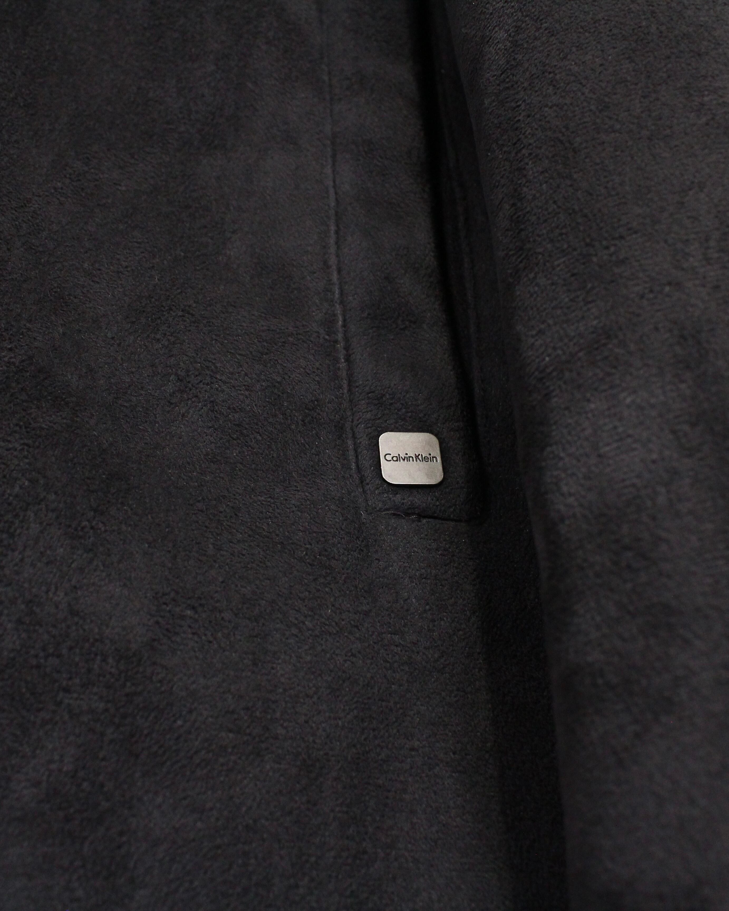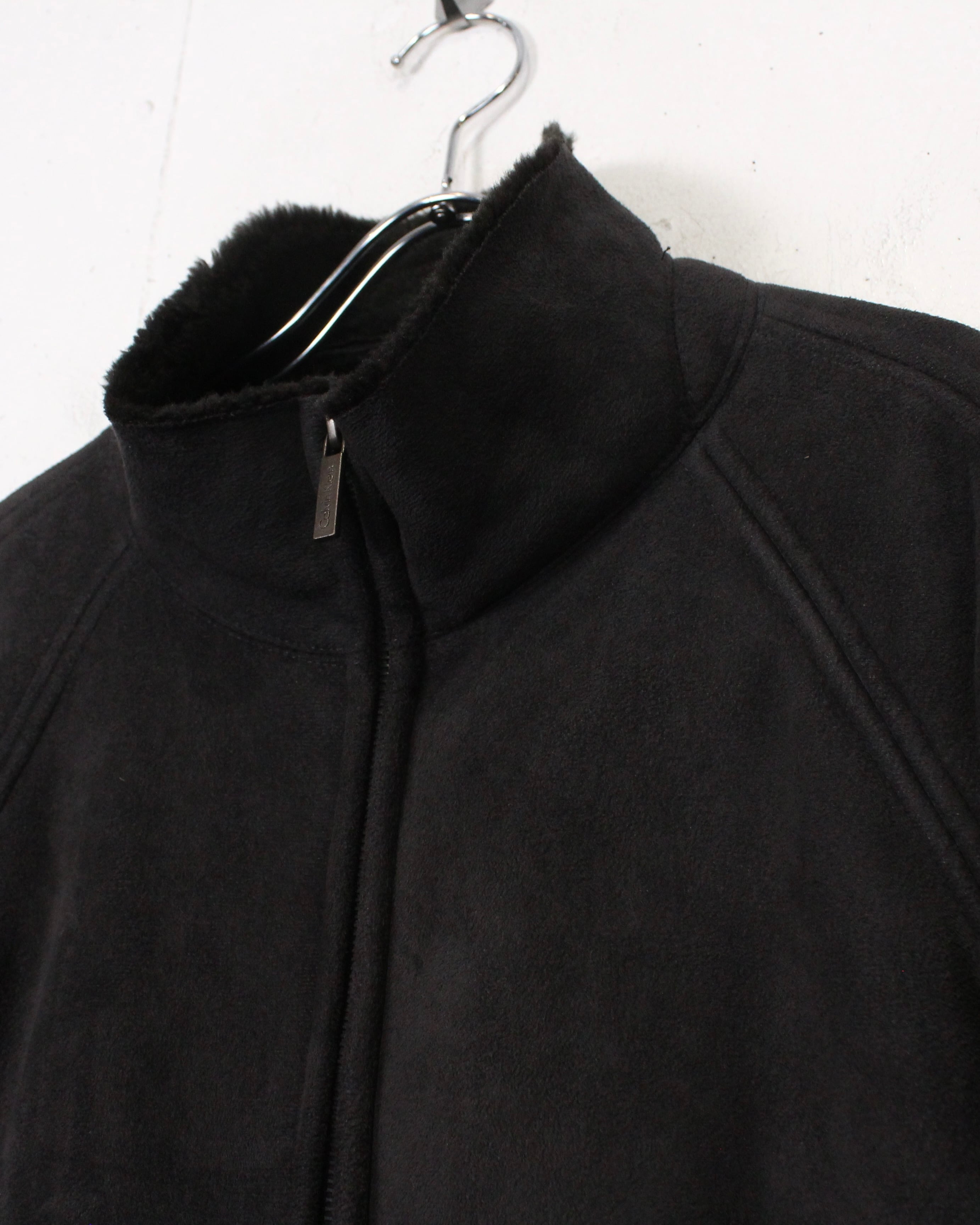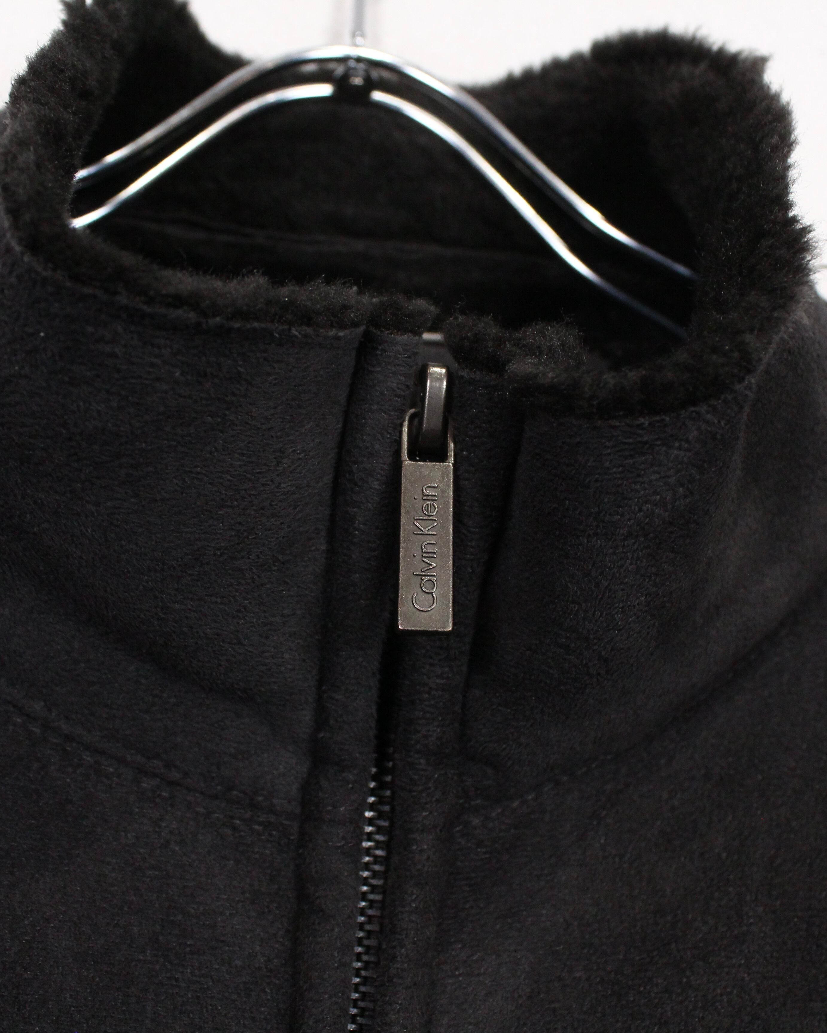 襟元から内側にかけて配されたボア仕様が、デザインとしてのアクセントと防寒性を両立。フロントはジップアップで、ポケット配置や切り替えラインも極めてミニマルにまとめられ、Calvin Kleinらしい引き算の美学が感じられます。