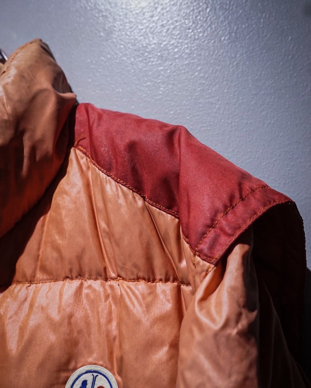 艶のあるオレンジのカラーリングをベースに、肩周りに赤色を切り替えた配色が印象的な1着。