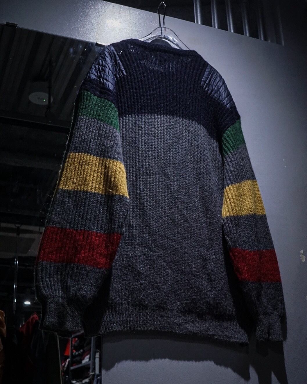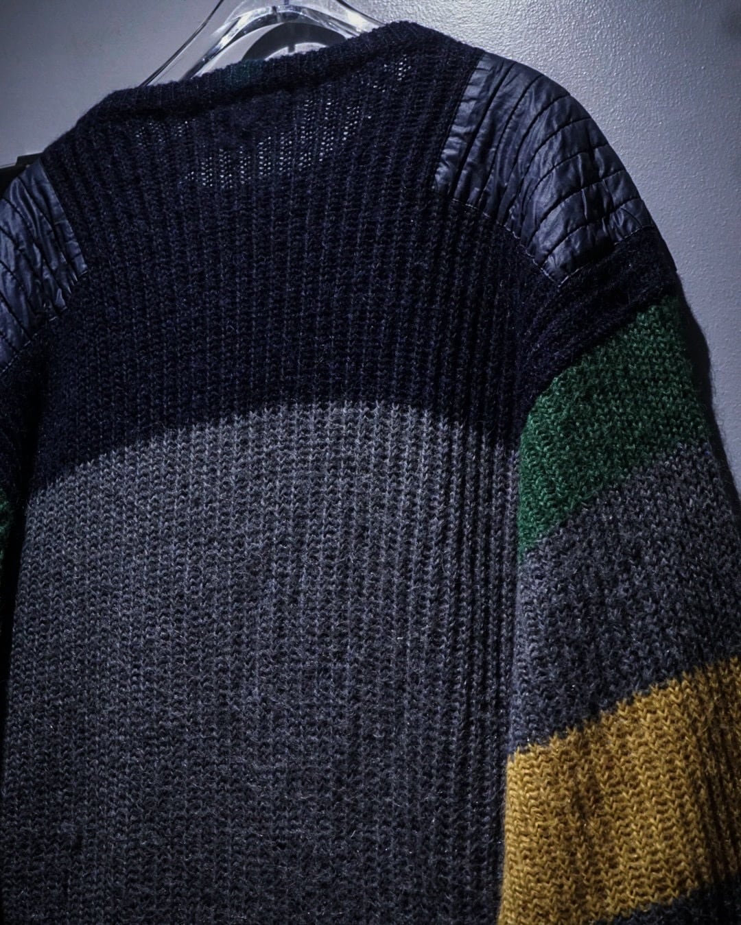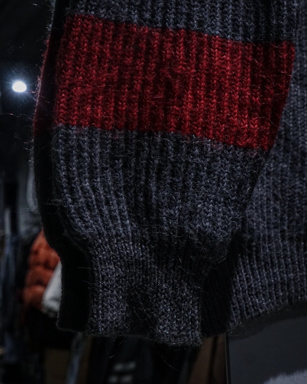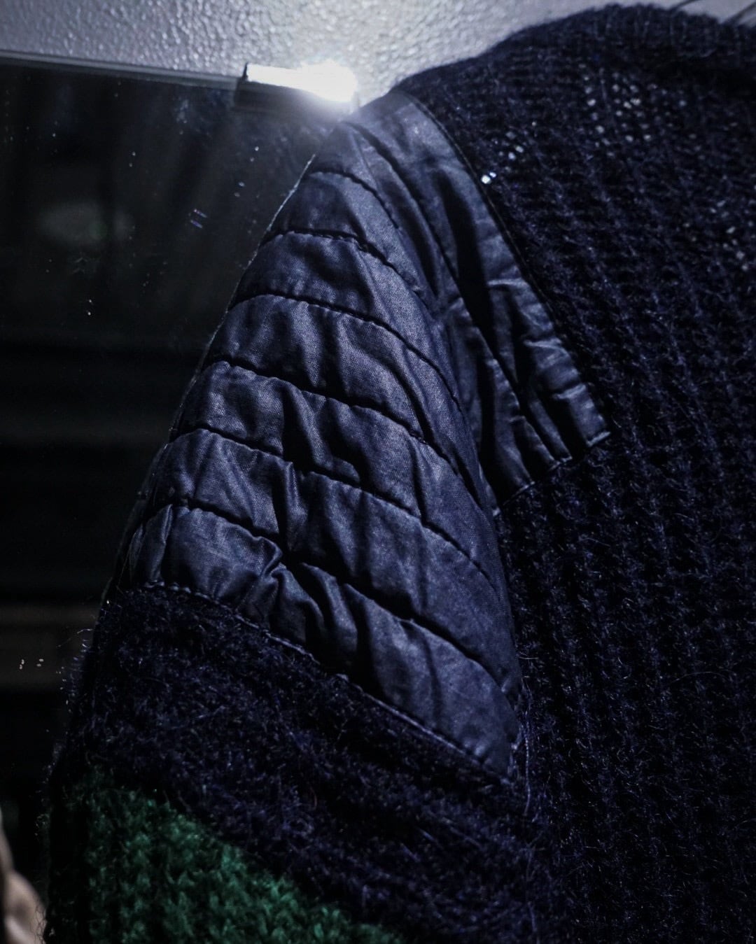 グレーをベースに、肩にはネイビー、アームにかけてグリーン・イエロー・レッドを切り替えたマルチカラー。さらに肩部分にはキルティングを配し、異素材のアクセントをプラス。アート性とプロダクトとしての完成度を両立させるICEBERGのニット技術が存分に発揮された仕上がりです。