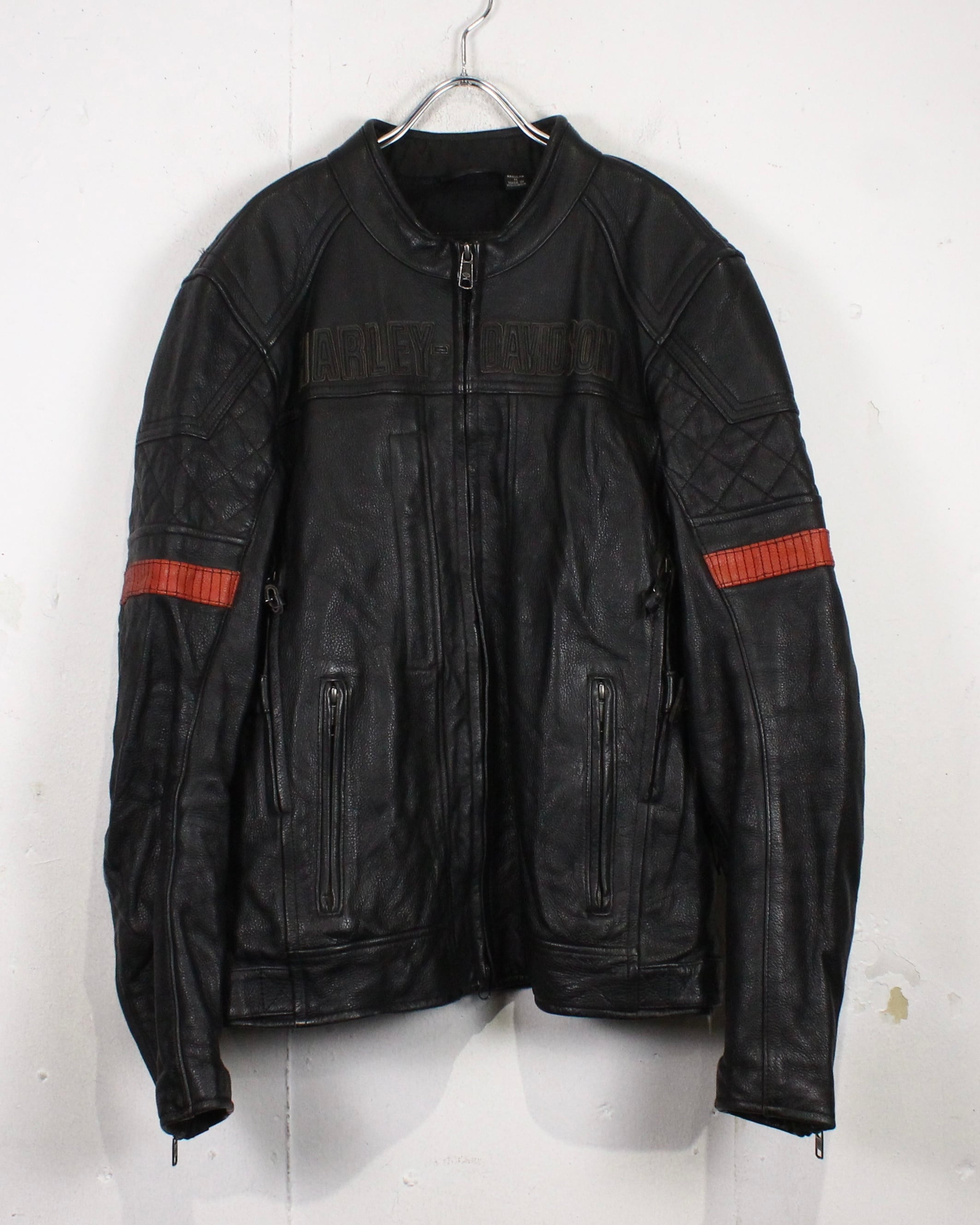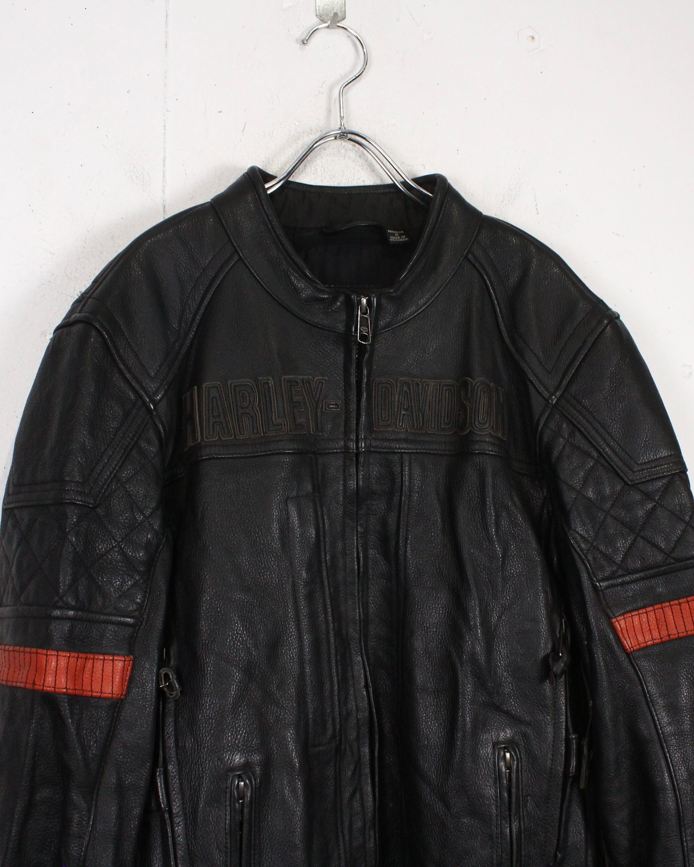 フロントには存在感のあるブランドネーム刺繍、アーム部分にはHARLEY-DAVIDSONを象徴するオレンジカラーの切り替えを配置。ダブルジップ仕様のフロントに加え、ボディサイドのジップポケットや、随所に施されたキルティングステッチと切り替えが、実用性とデザイン性の両立を実現しています。