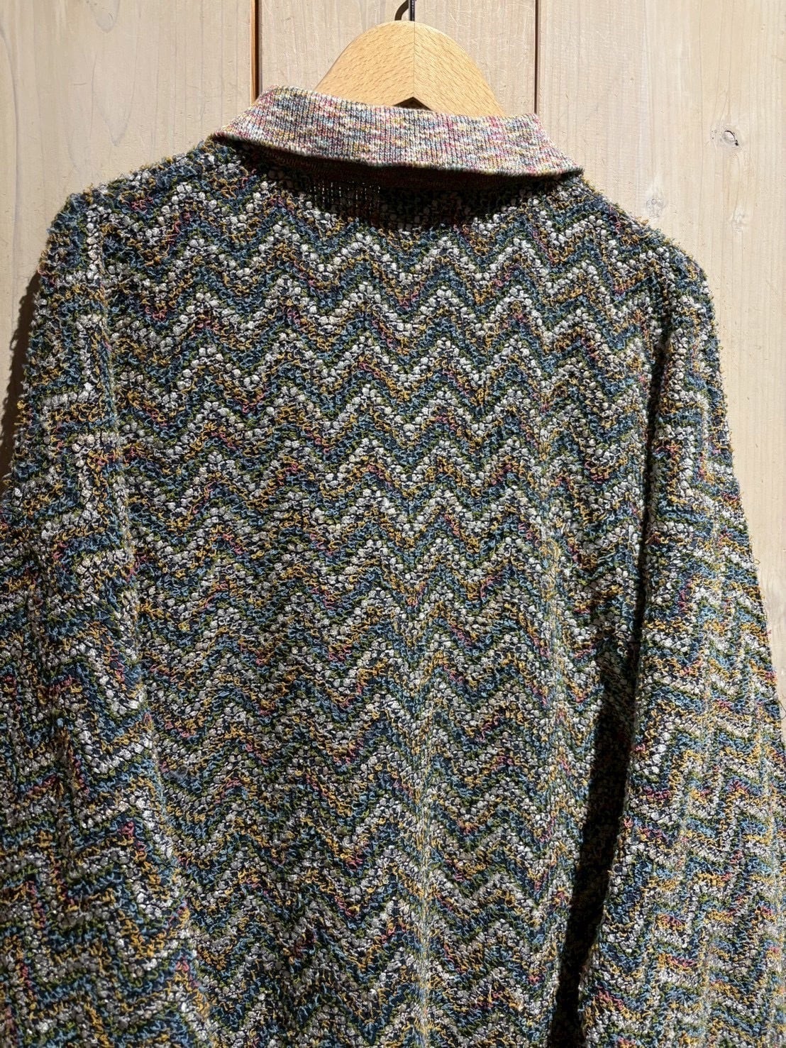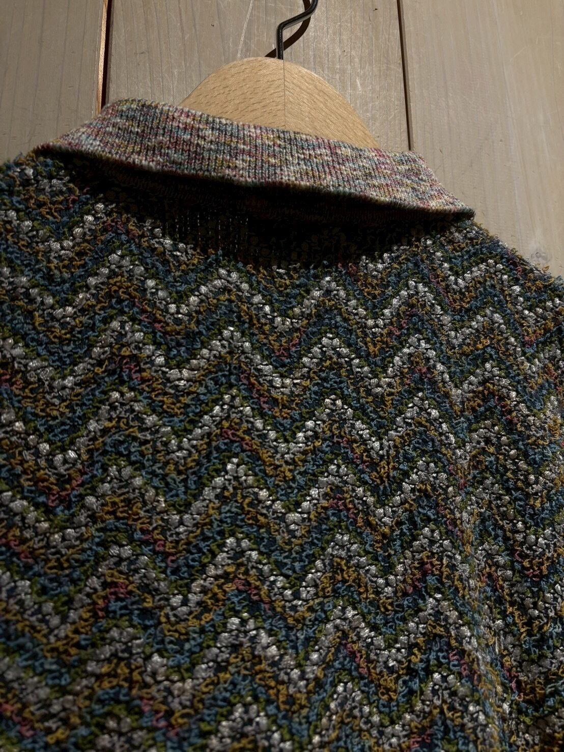 ブルー、グリーン、イエロー、ピンクといった色糸を織り交ぜた奥行きのあるカラーリングに、ジグザグ状の立体的なニッティングを組み合わせることで豊かな表情を演出しています。
