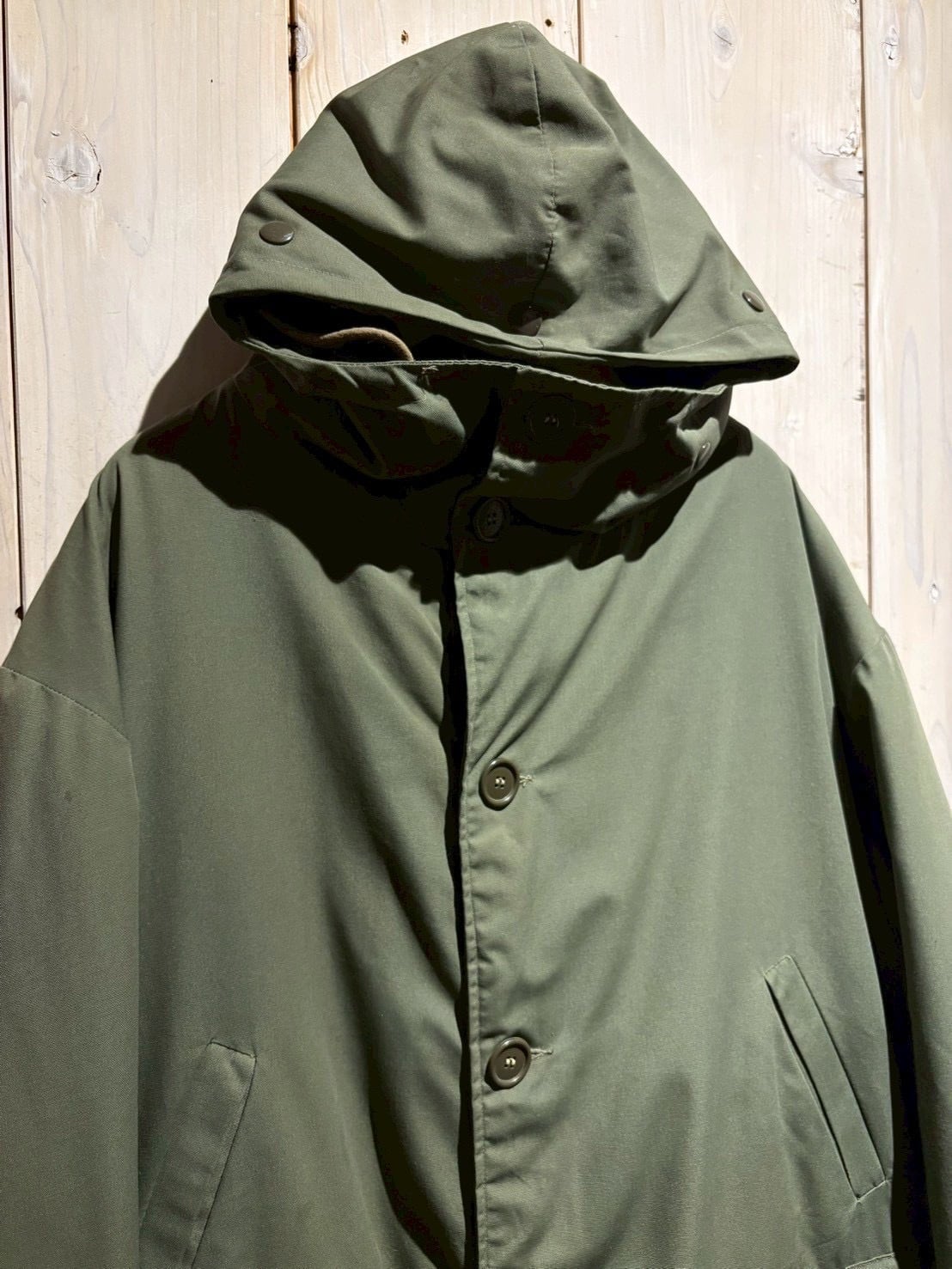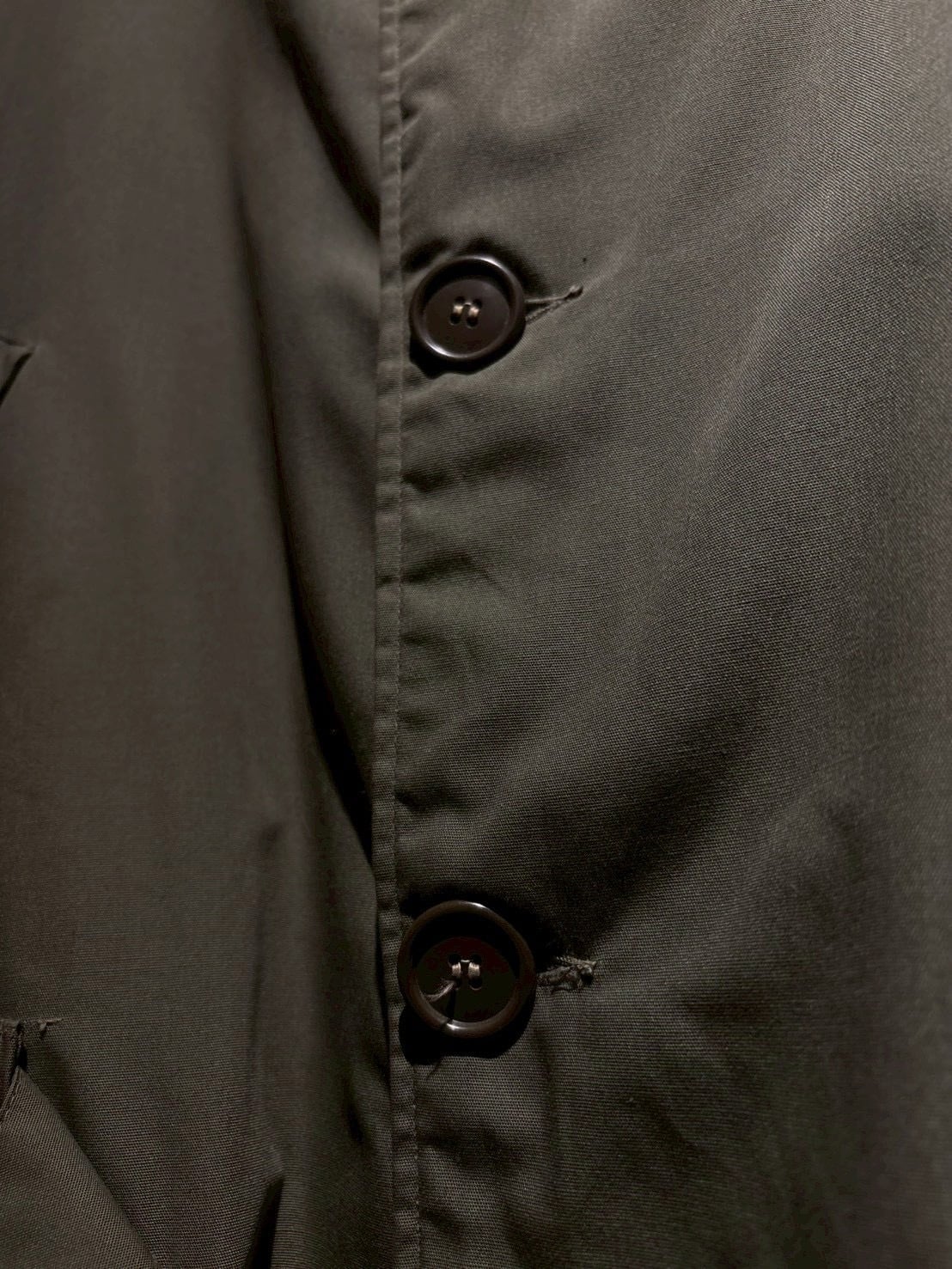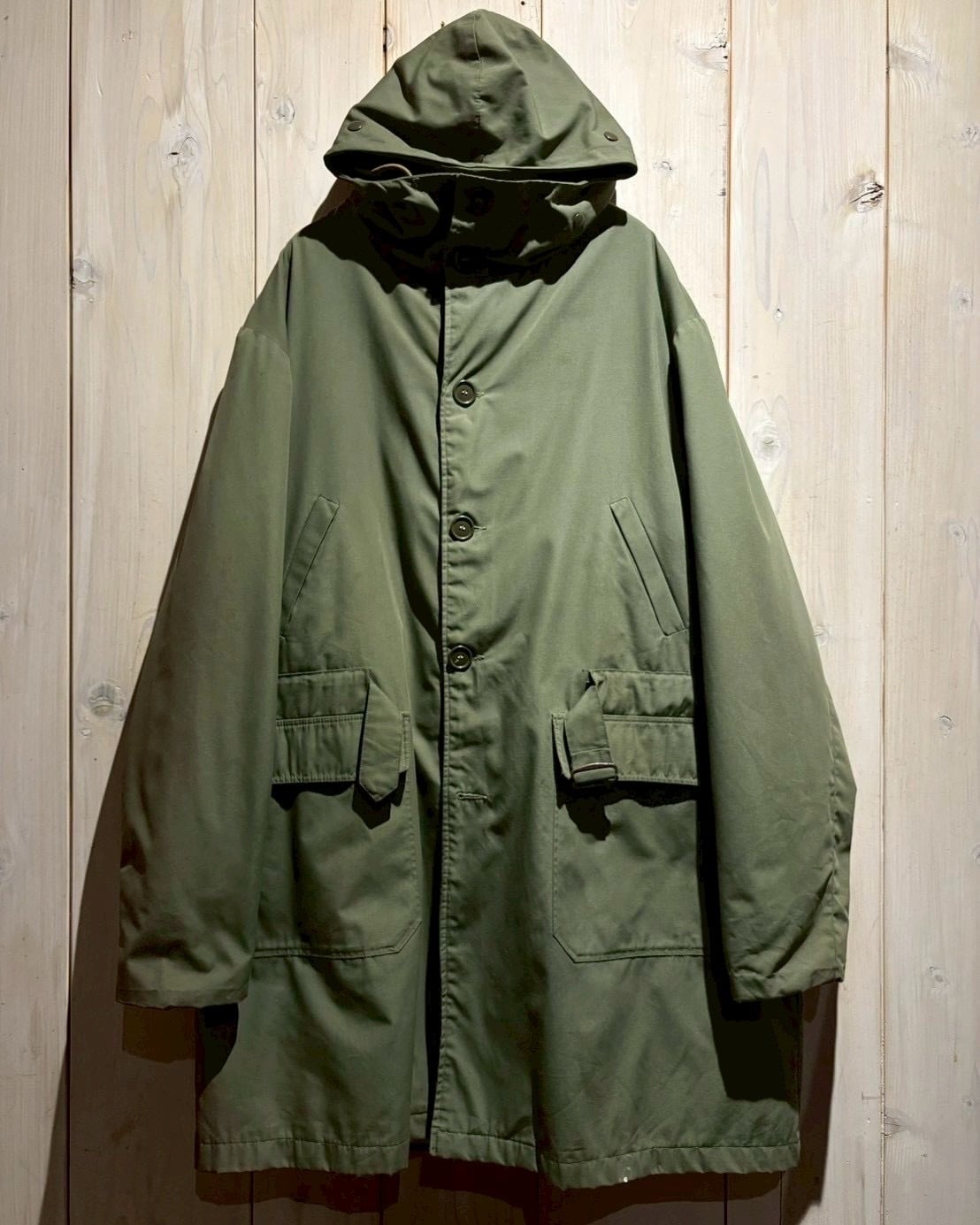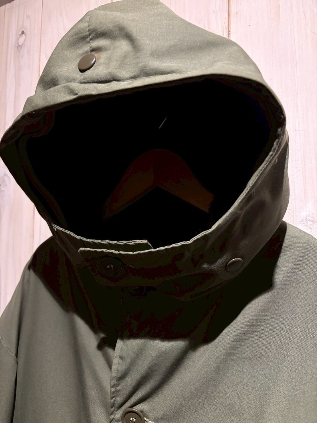 シェルにはオリーブカラーのコットン×ナイロンのファブリックを採用。ハリのある質感で風をしっかりと遮りつつ、着用を重ねることで柔らかさと表情が増していく素材感。内側にはウールライニングが配され、当時の寒冷地仕様らしい高い保温性を確保しています。