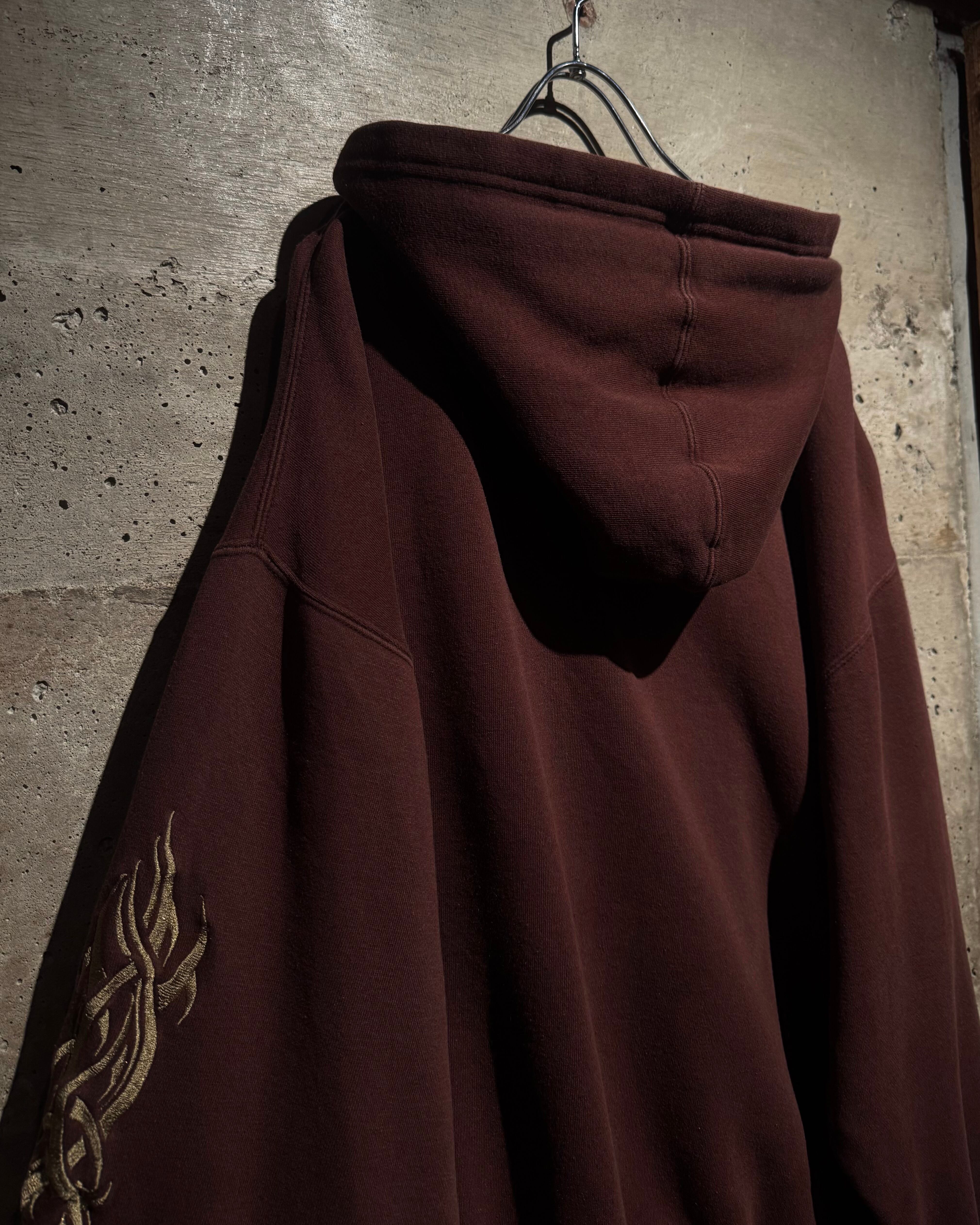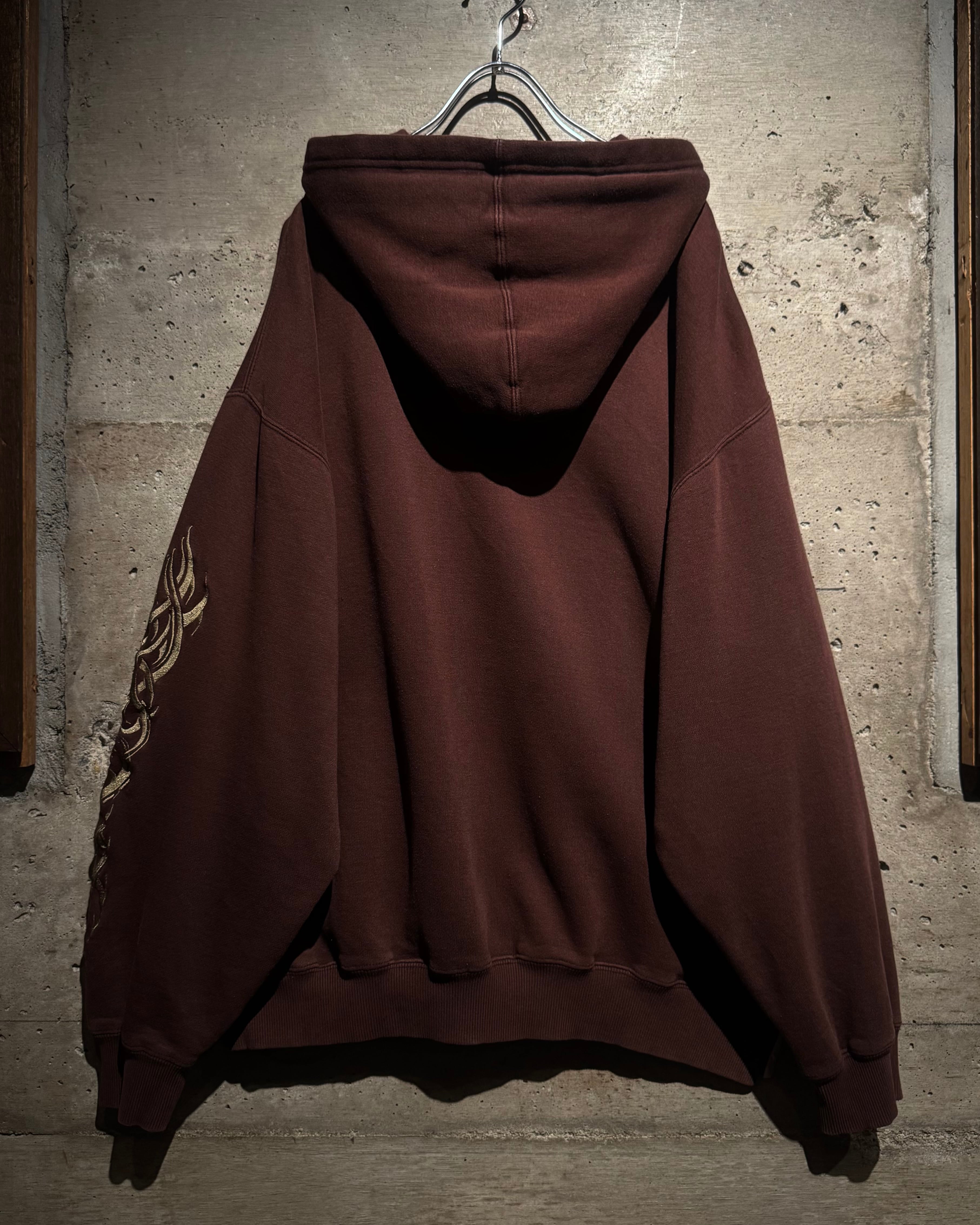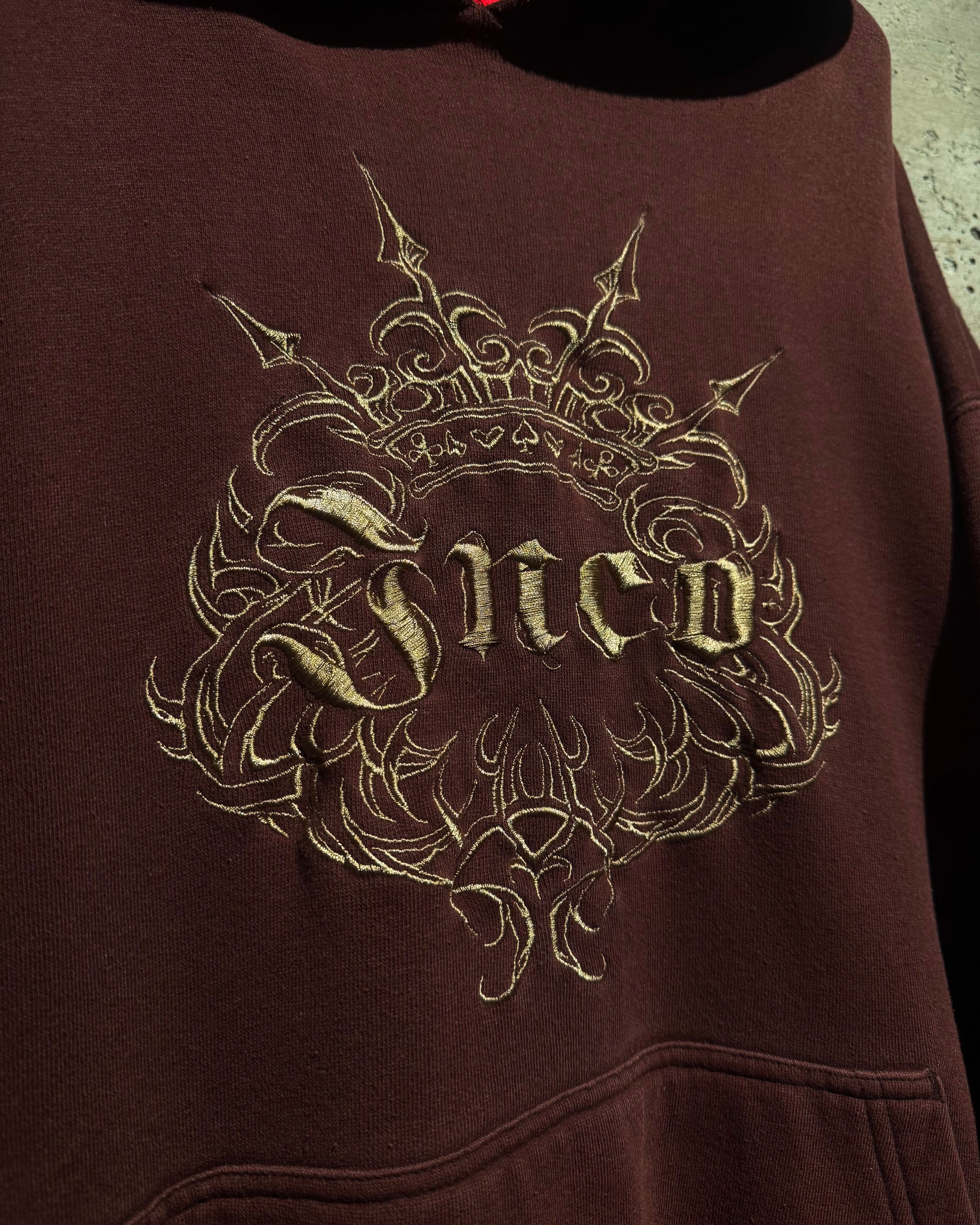 フェードしたブラウンのボディをベースに、アイコニックなクラウン、ブランドネーム、トライバル柄を立体感のある刺繍で刻んだフーディ。