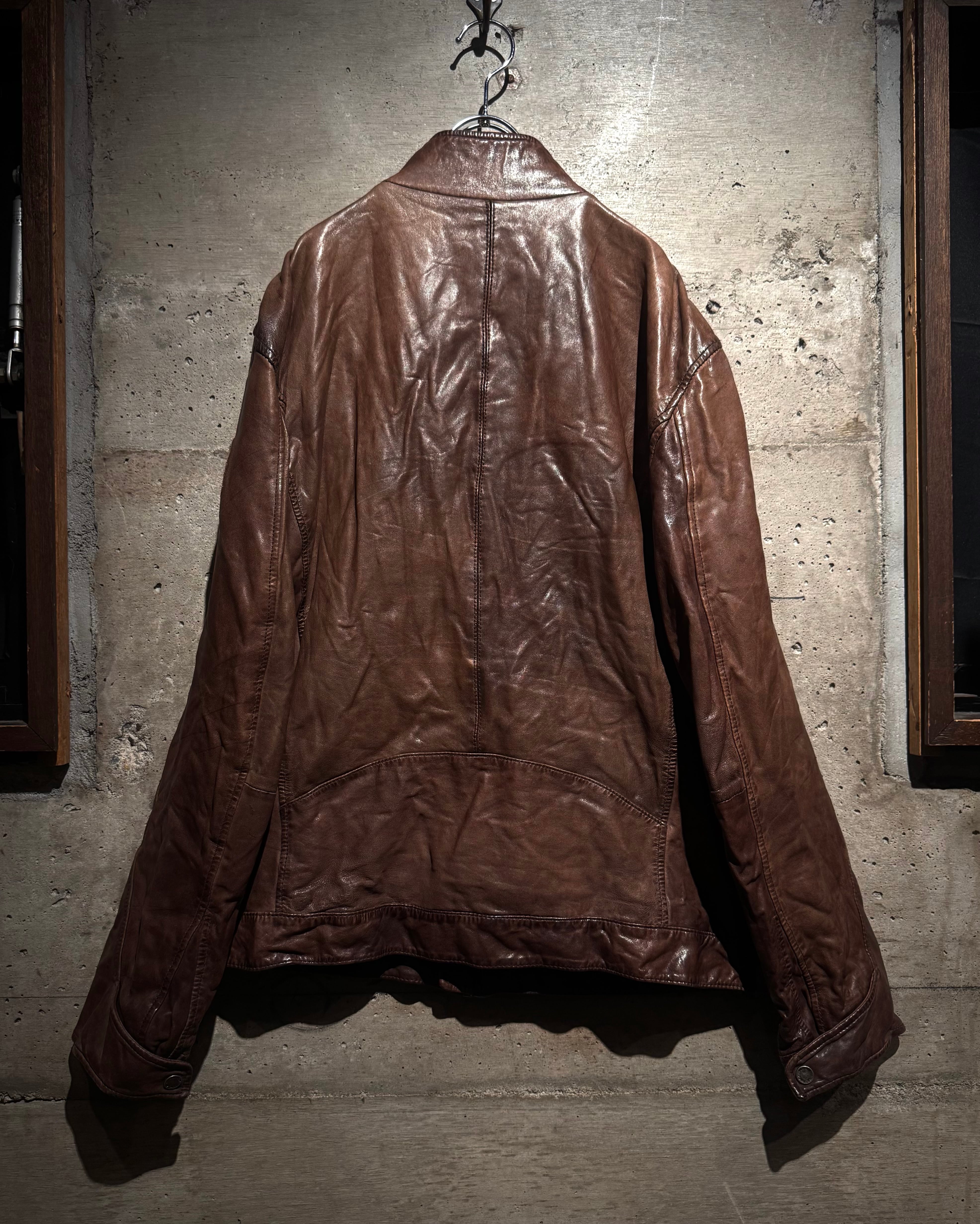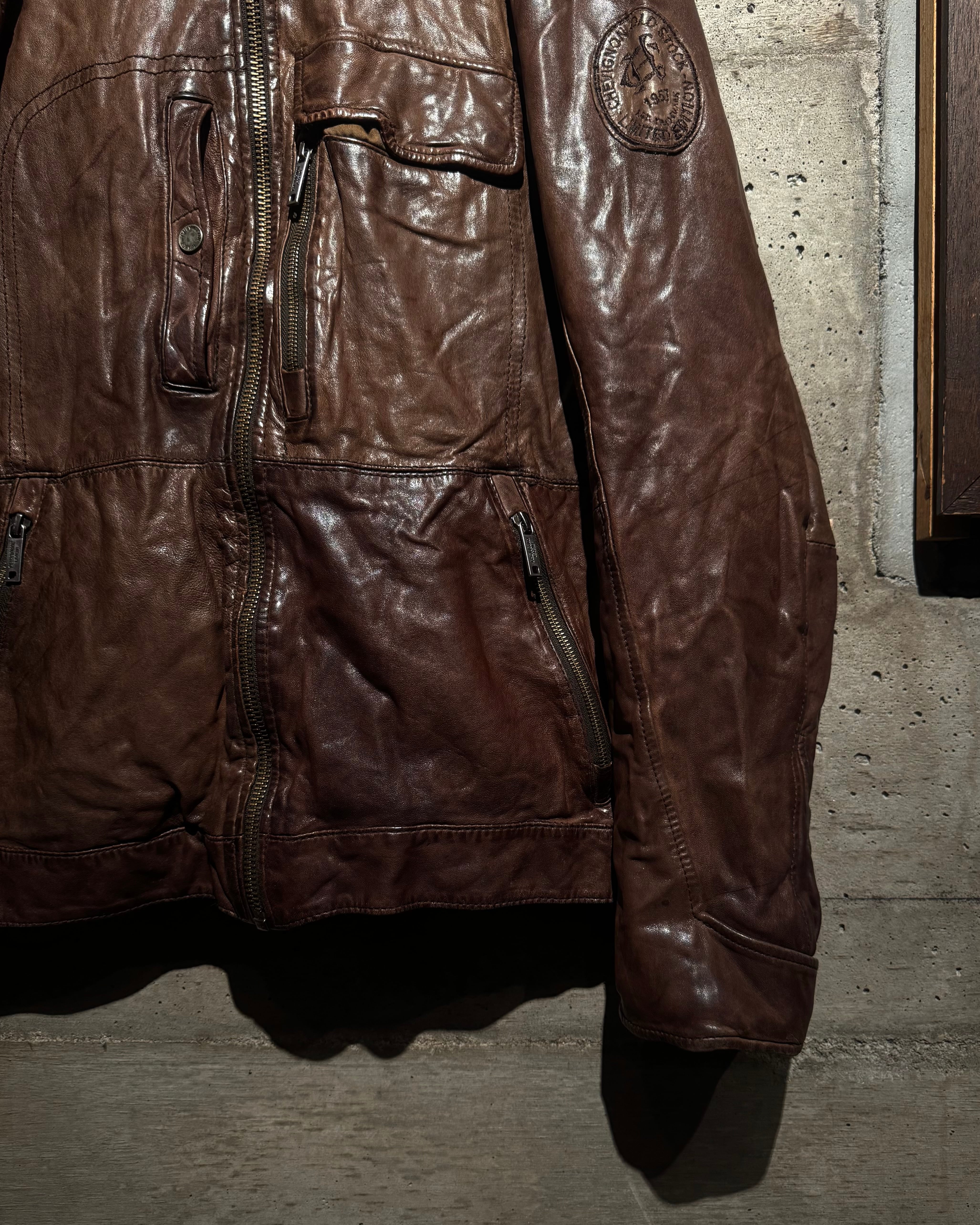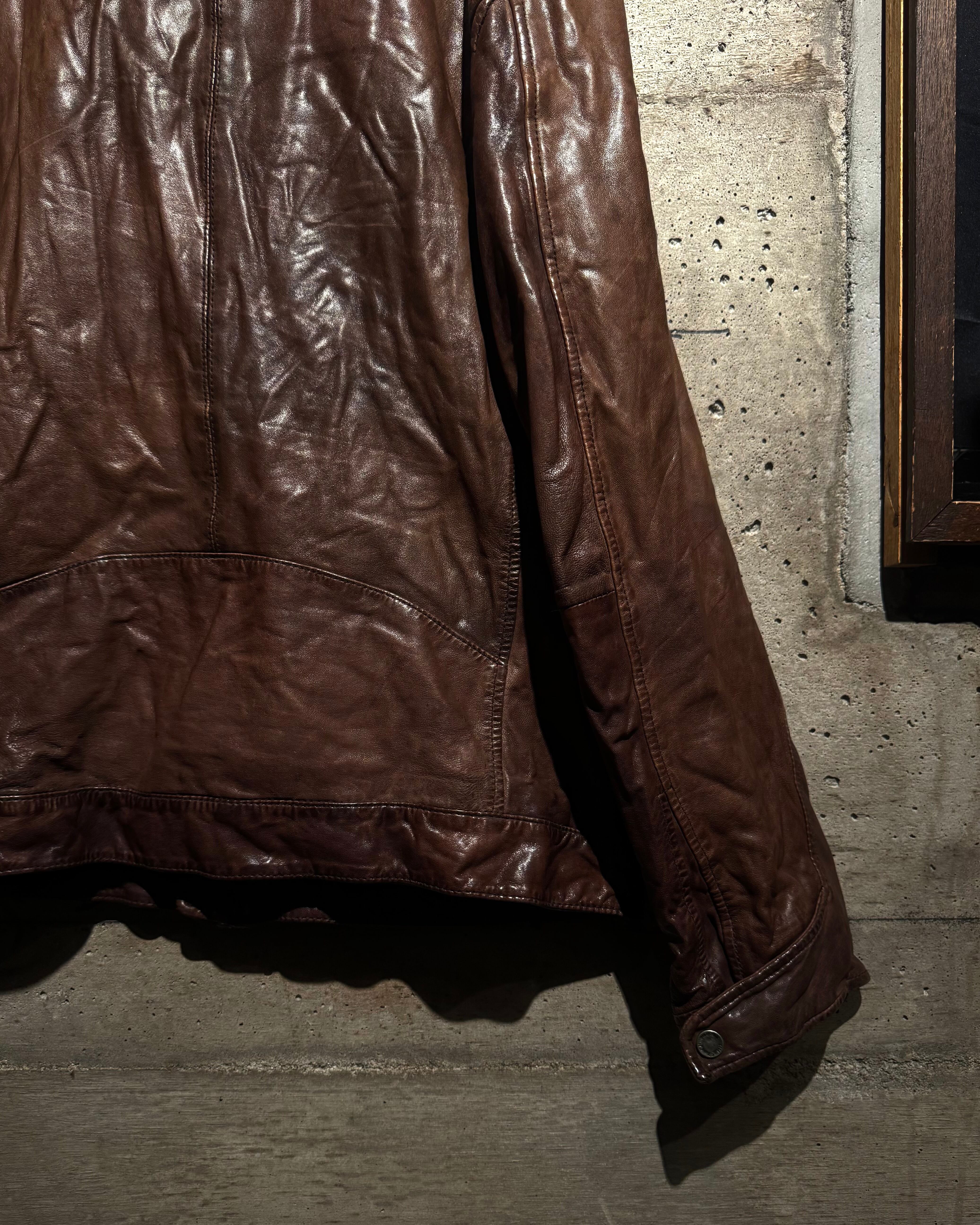 しっとりとしたブラウンレザーを用いたボディは、着用を重ねることで生まれた深いシワと艶が混ざり合い、非常に奥行きのある仕上がりに。