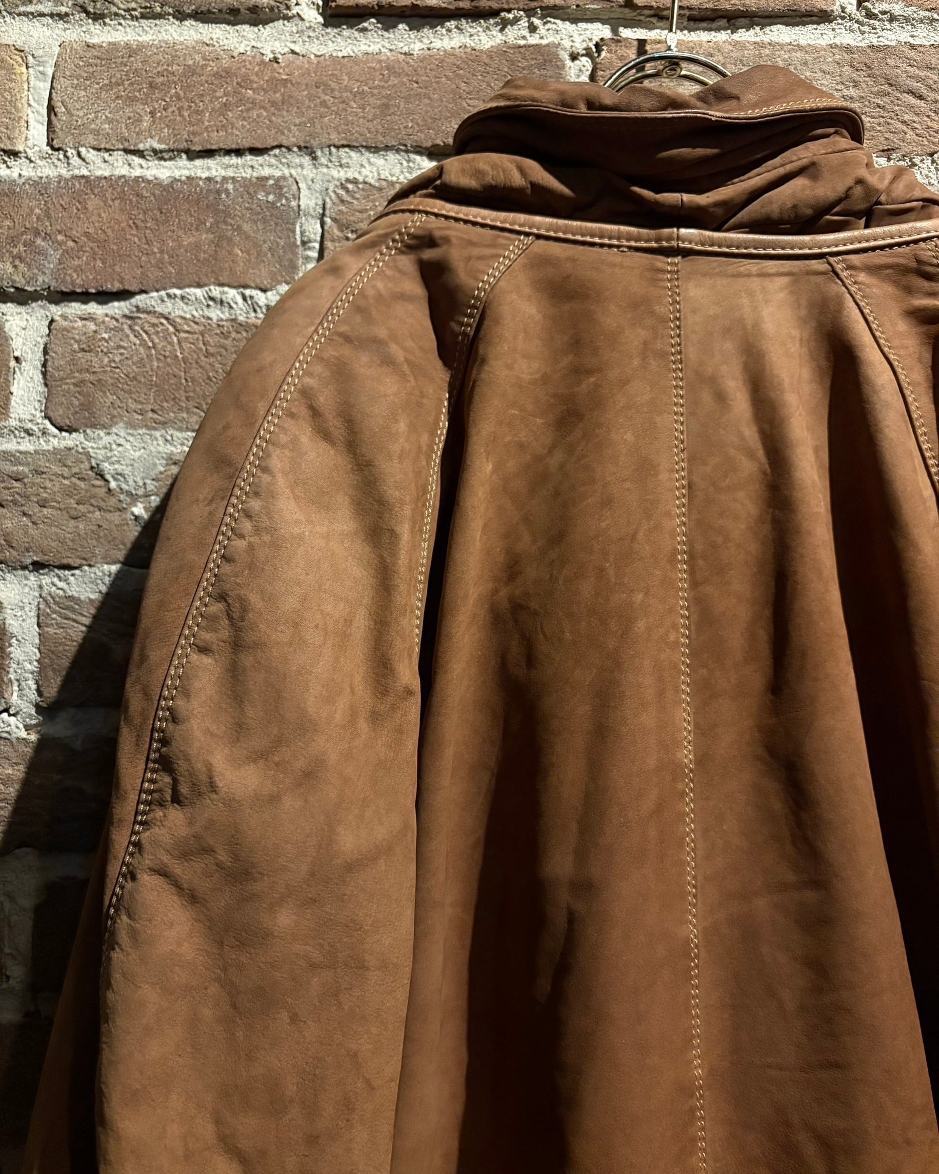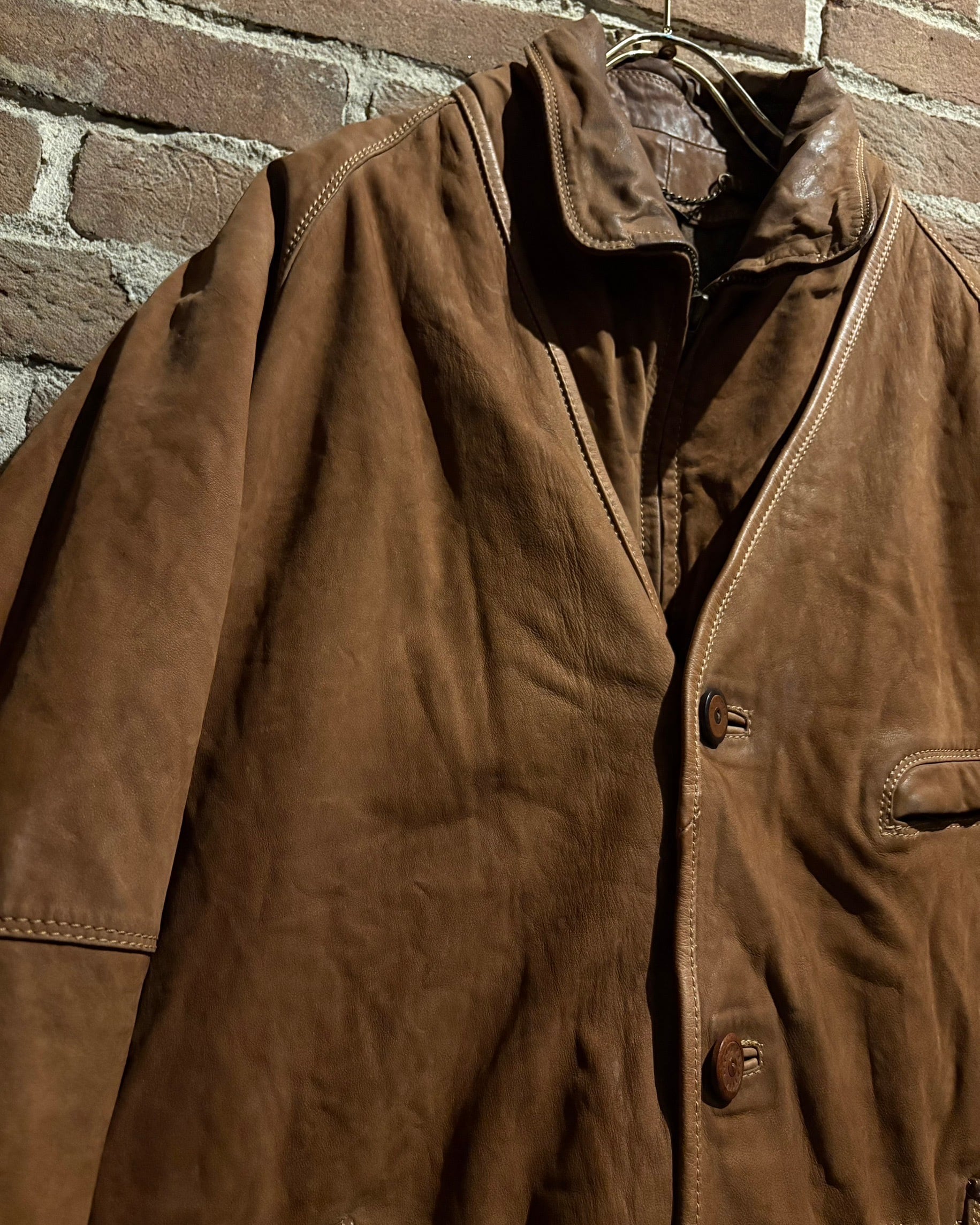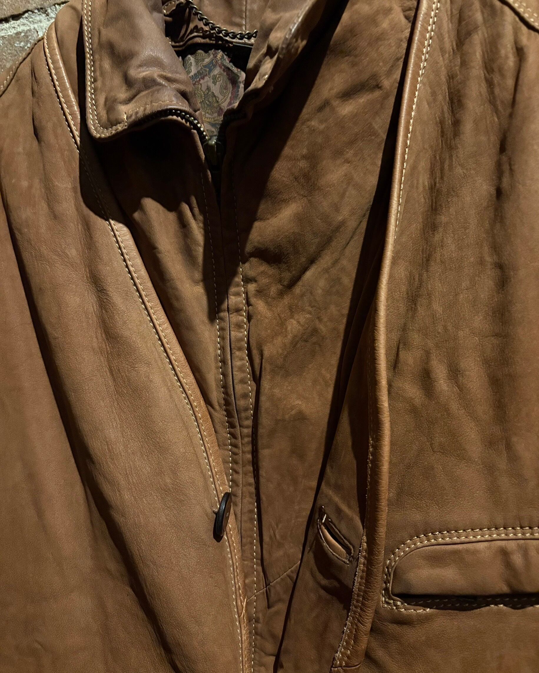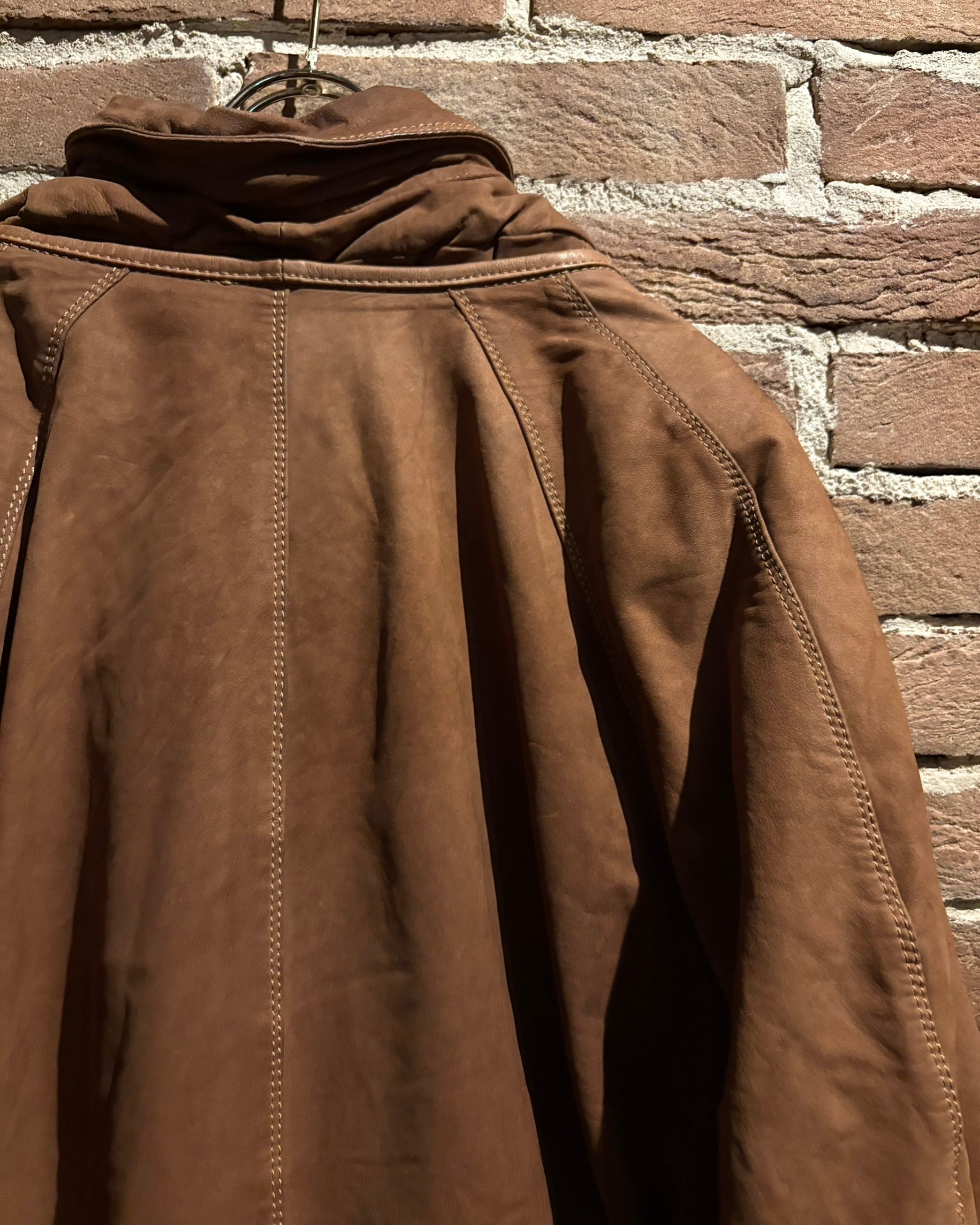 柔らかさと鈍い艶を併せ持つレザーに、立体的なパターンが重なり、非常に雰囲気のある仕上がり。薄手で着用しやすい点も魅力です。