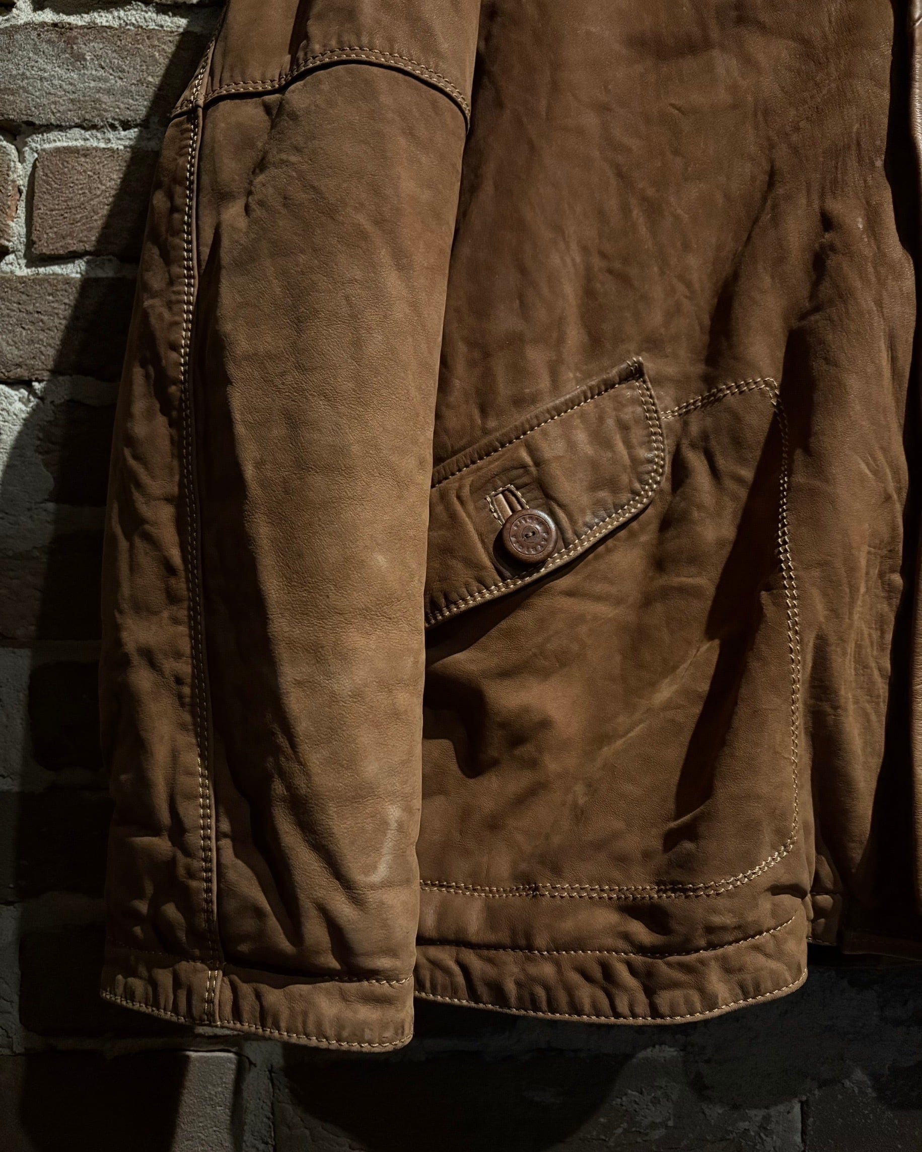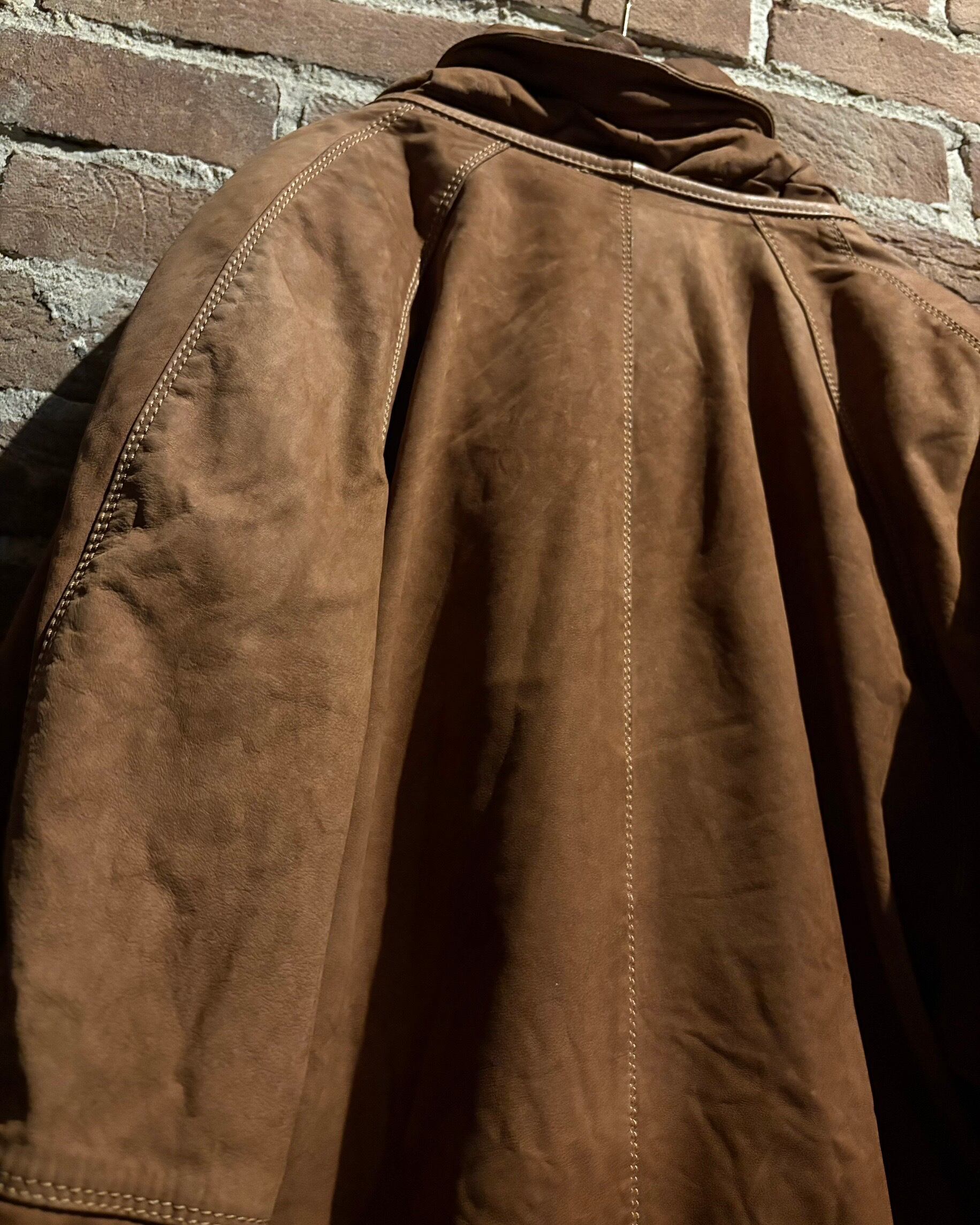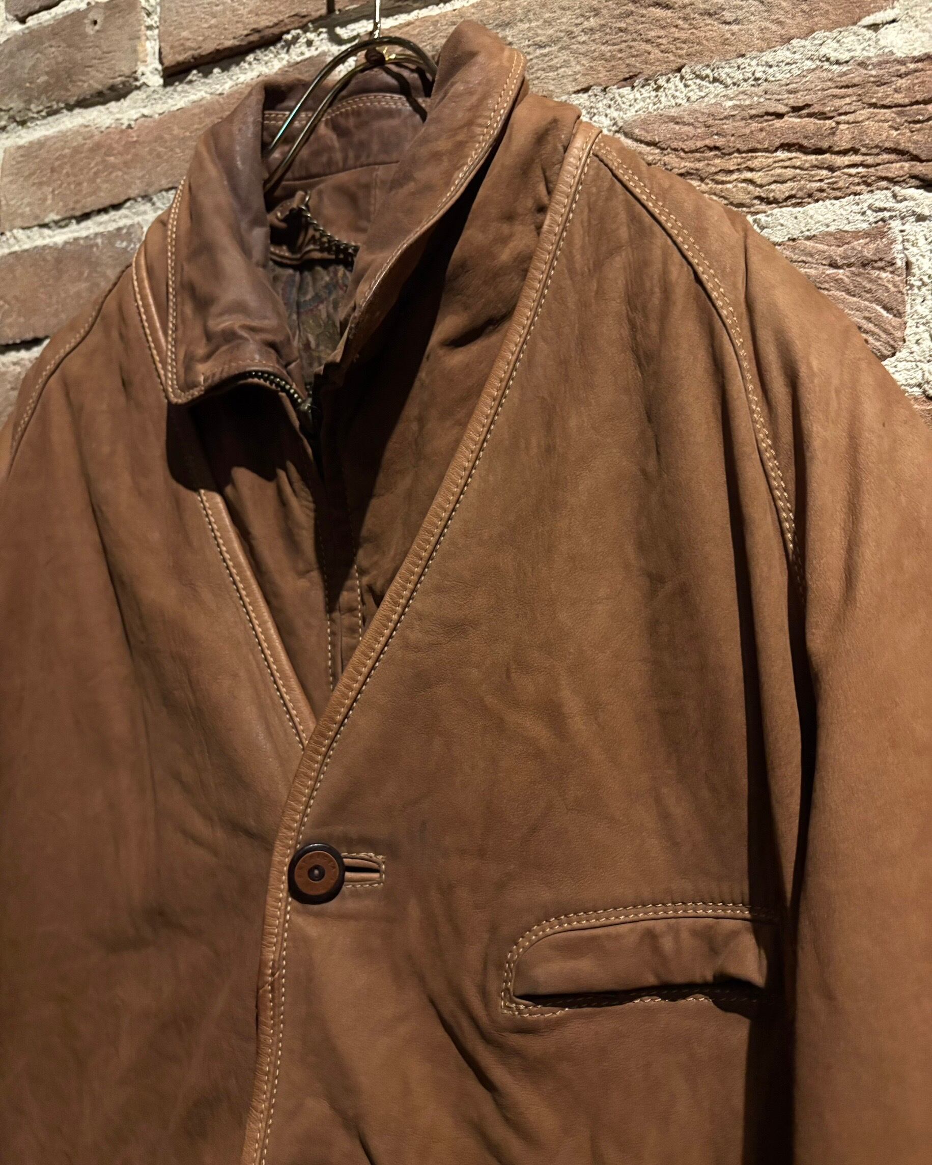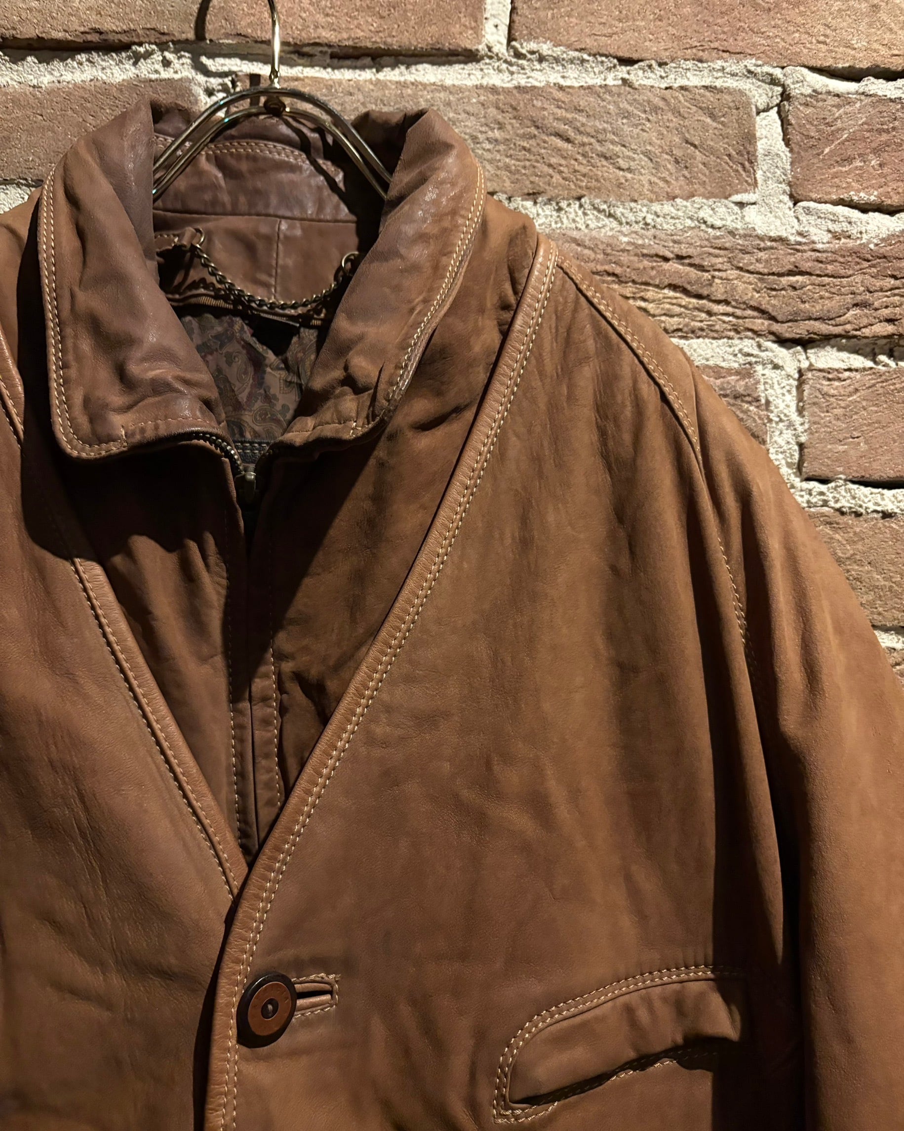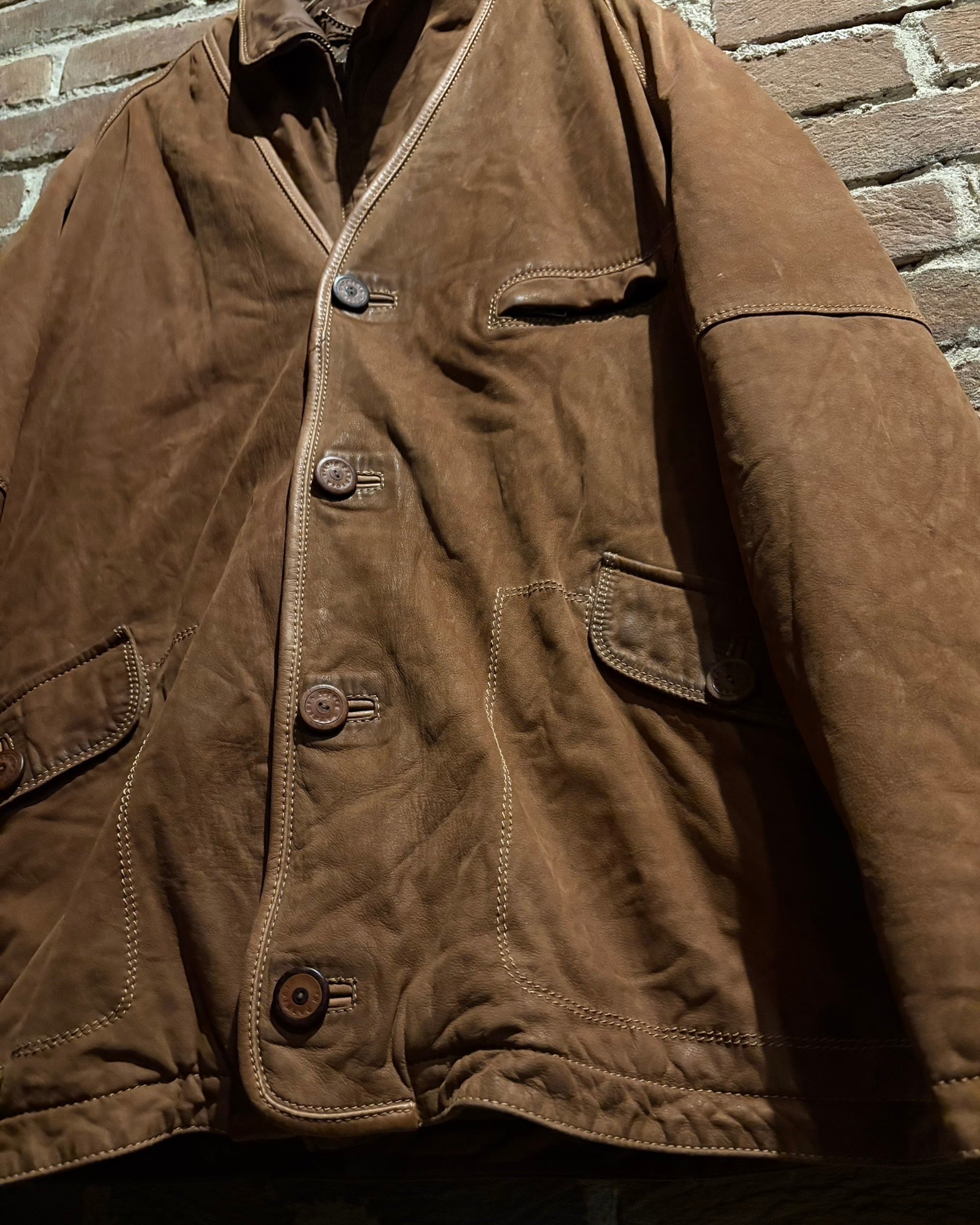 柔らかさと鈍い艶を併せ持つレザーに、立体的なパターンが重なり、非常に雰囲気のある仕上がり。薄手で着用しやすい点も魅力です。