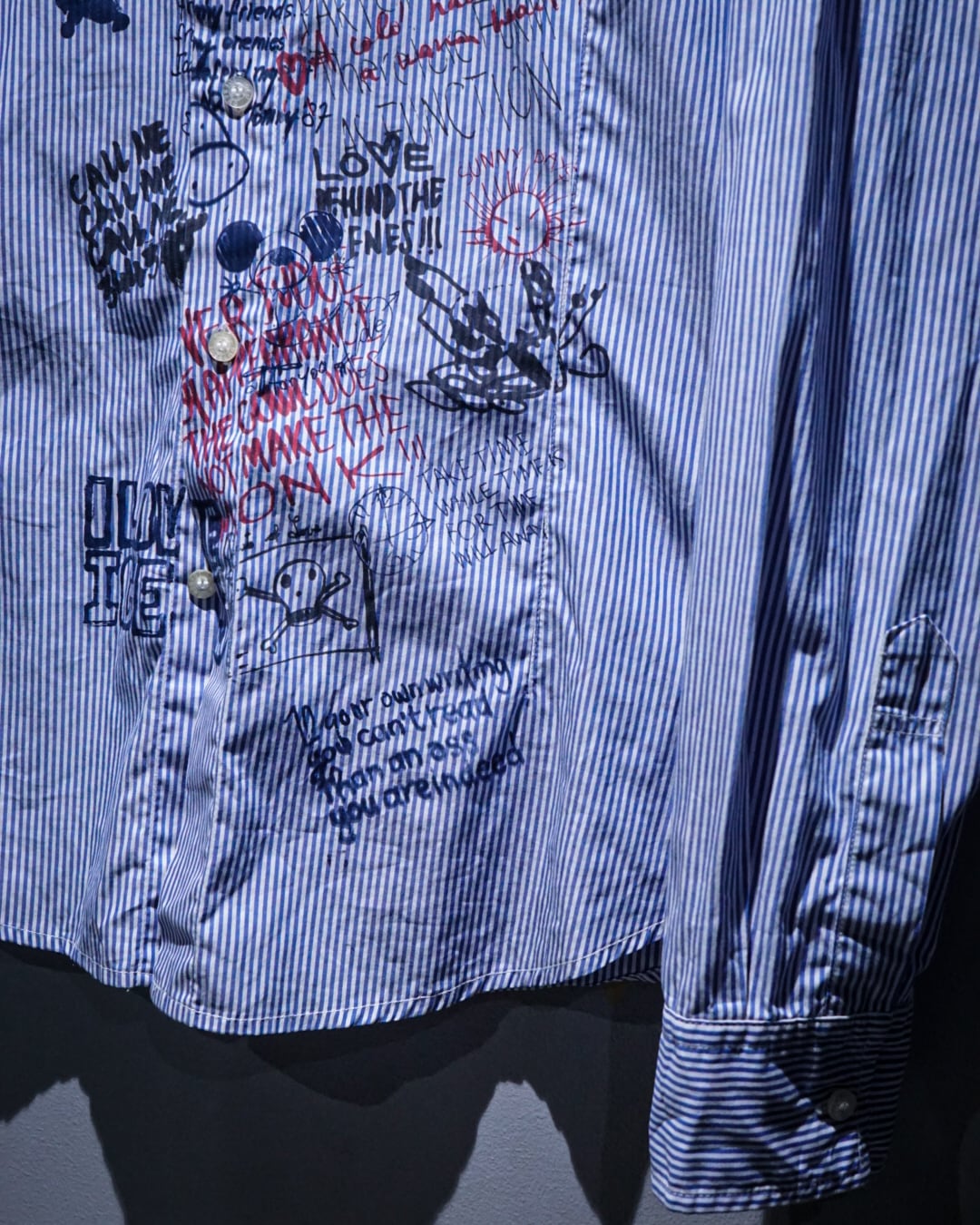 ベースにはブルー×ホワイトのストライプシャツを採用。クリーンで端正な印象の生地をキャンバスに、フロント全面へラフなタッチのグラフィックや文字、アイコンを散りばめたデザインが印象的。