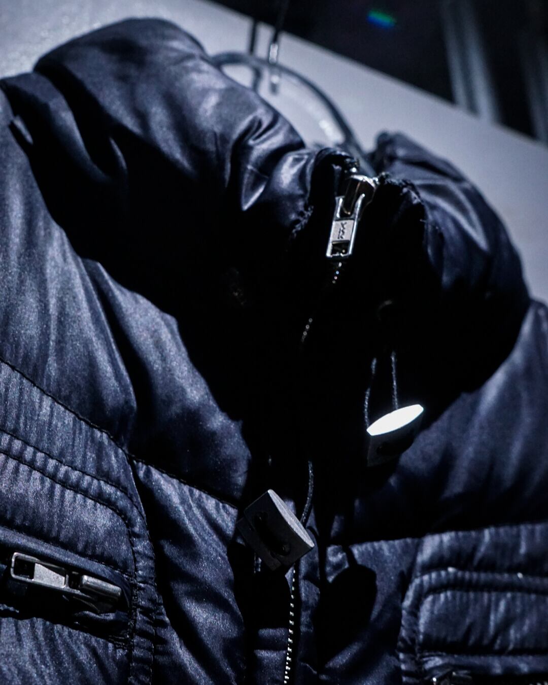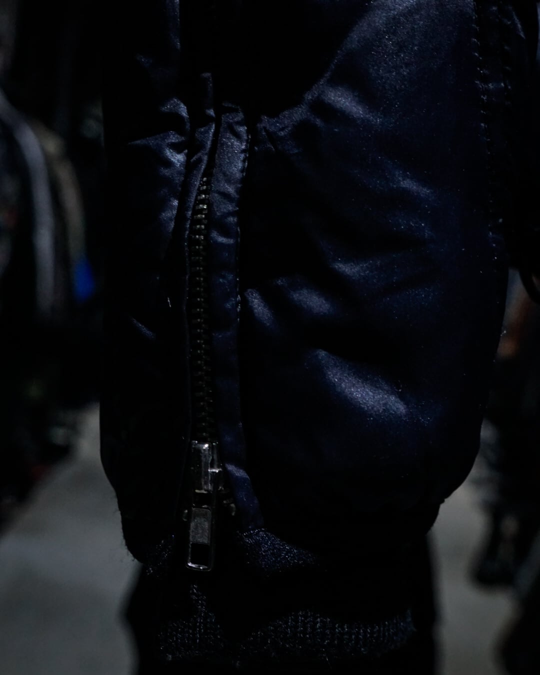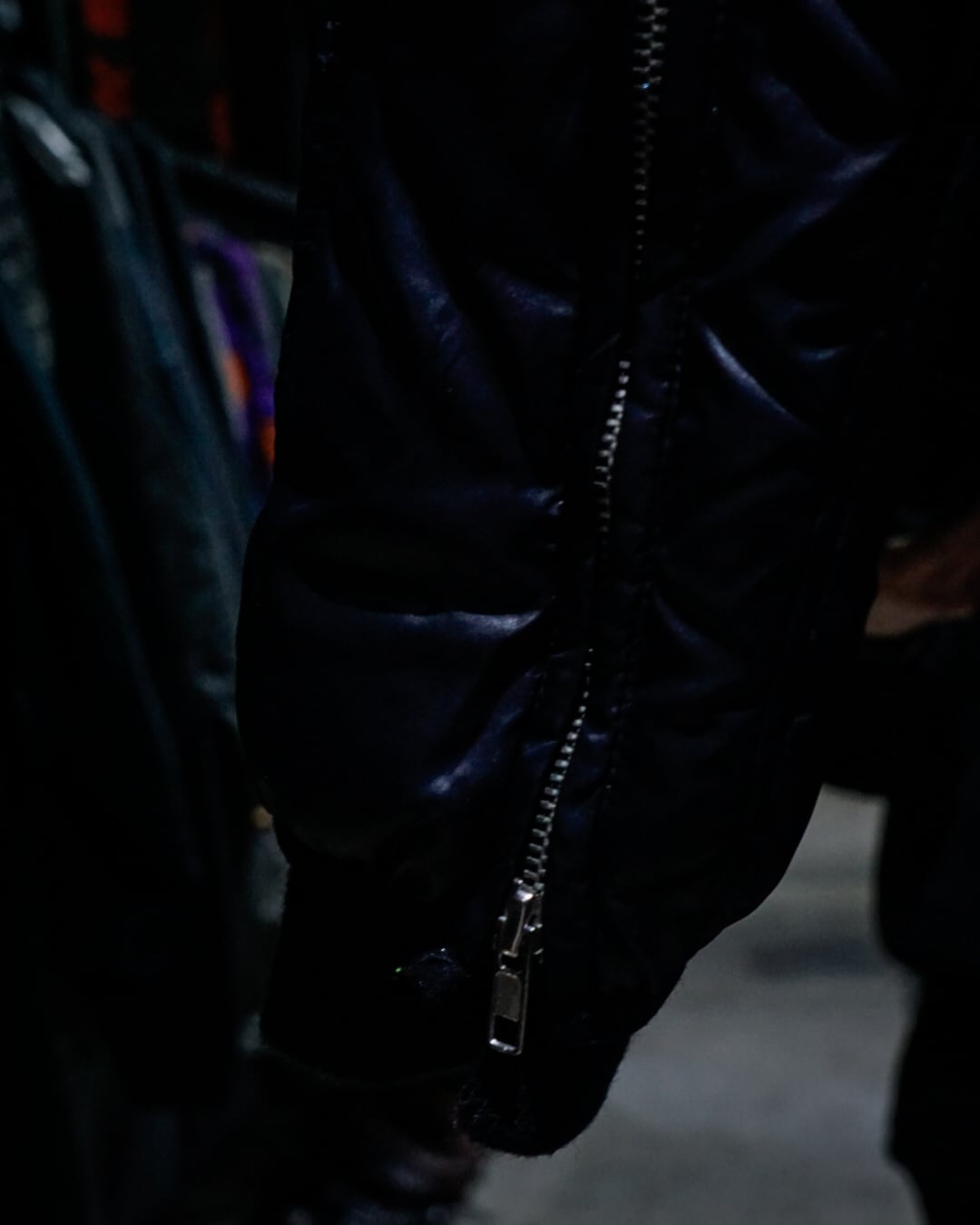 フロントには左右非対称に配置されたジップポケット。視覚的なアクセントであると同時に、収納性という実用面も確保。袖にはさりげなくブランドを主張するパッチを配し、主張しすぎないアイコニックさを演出しています。