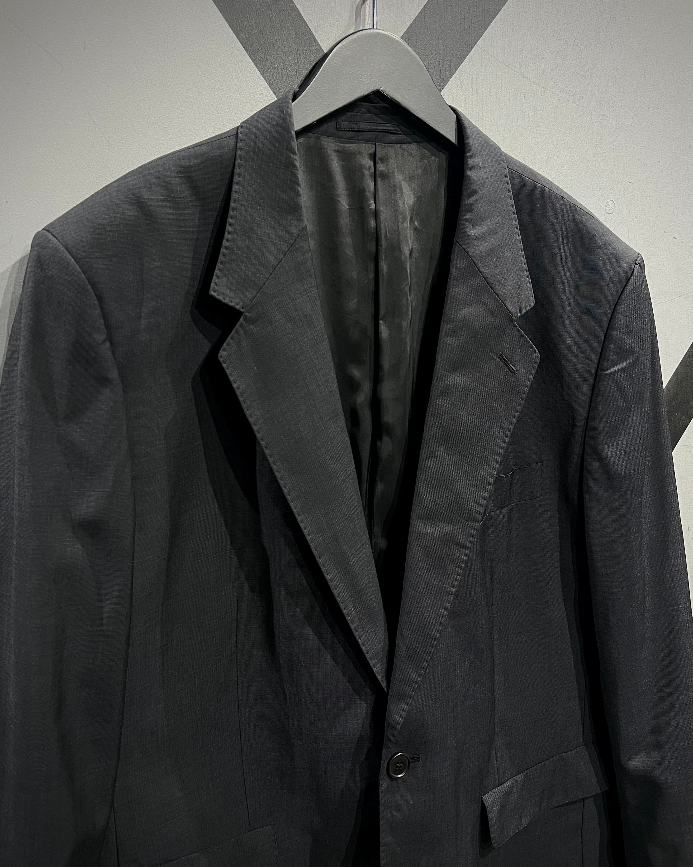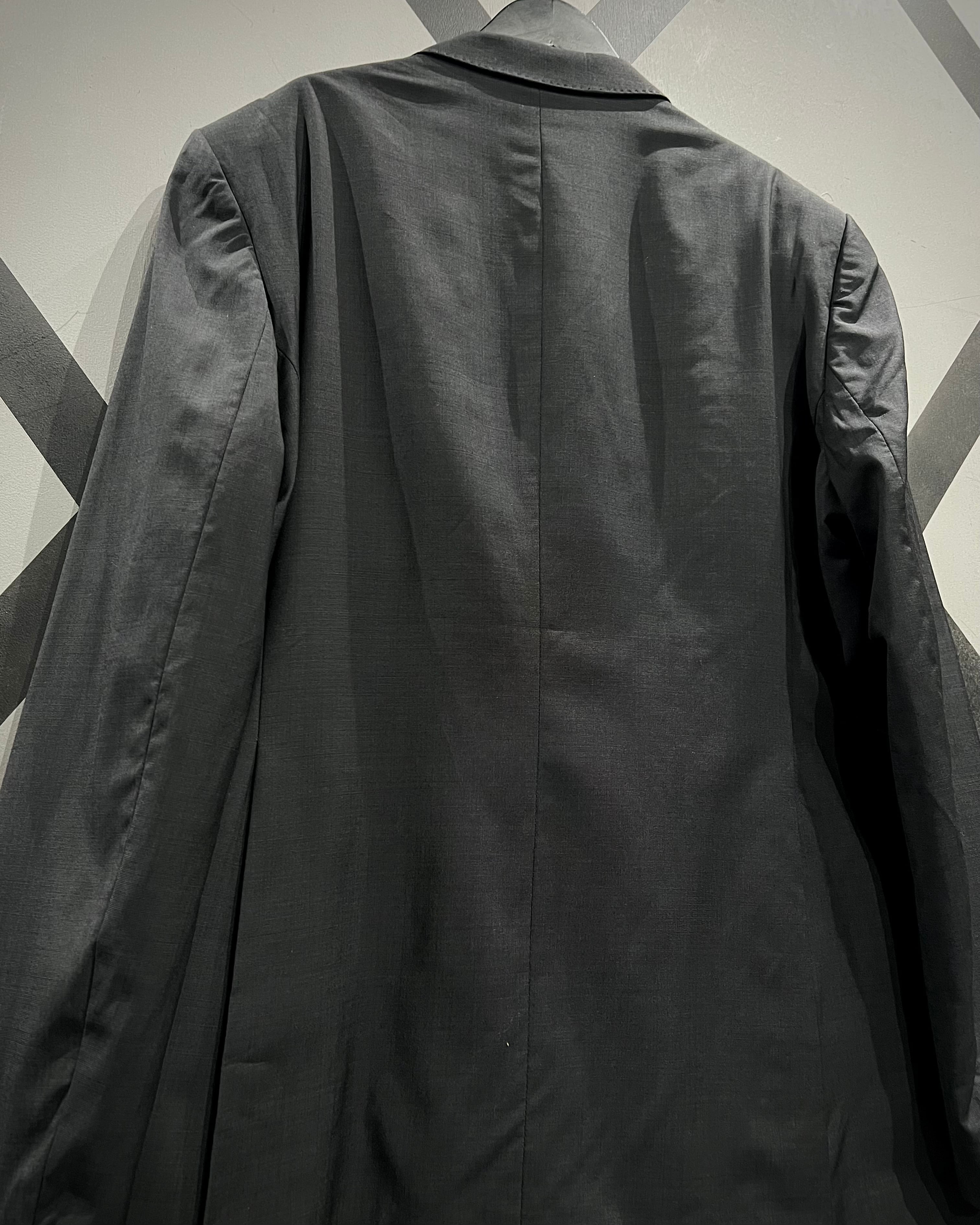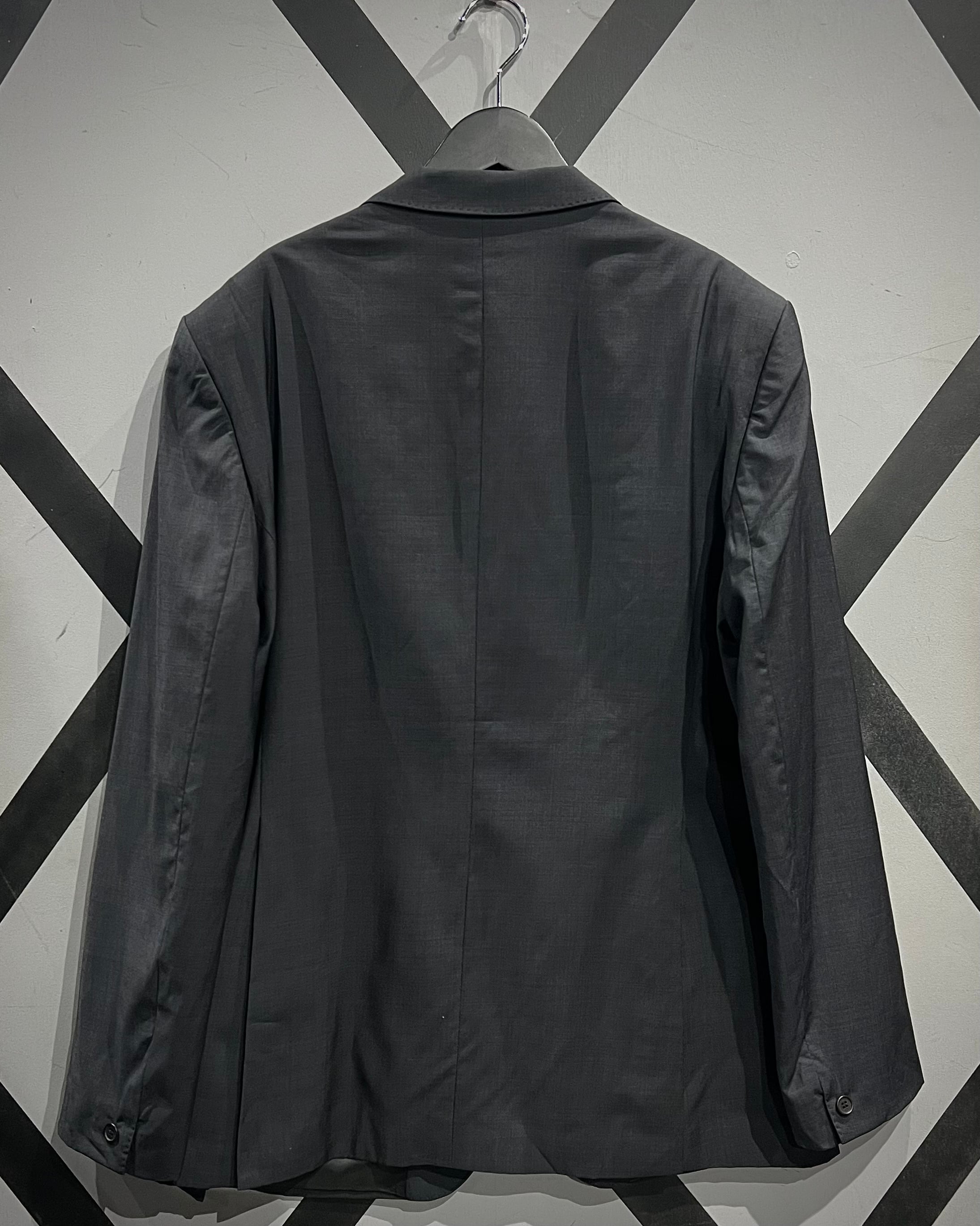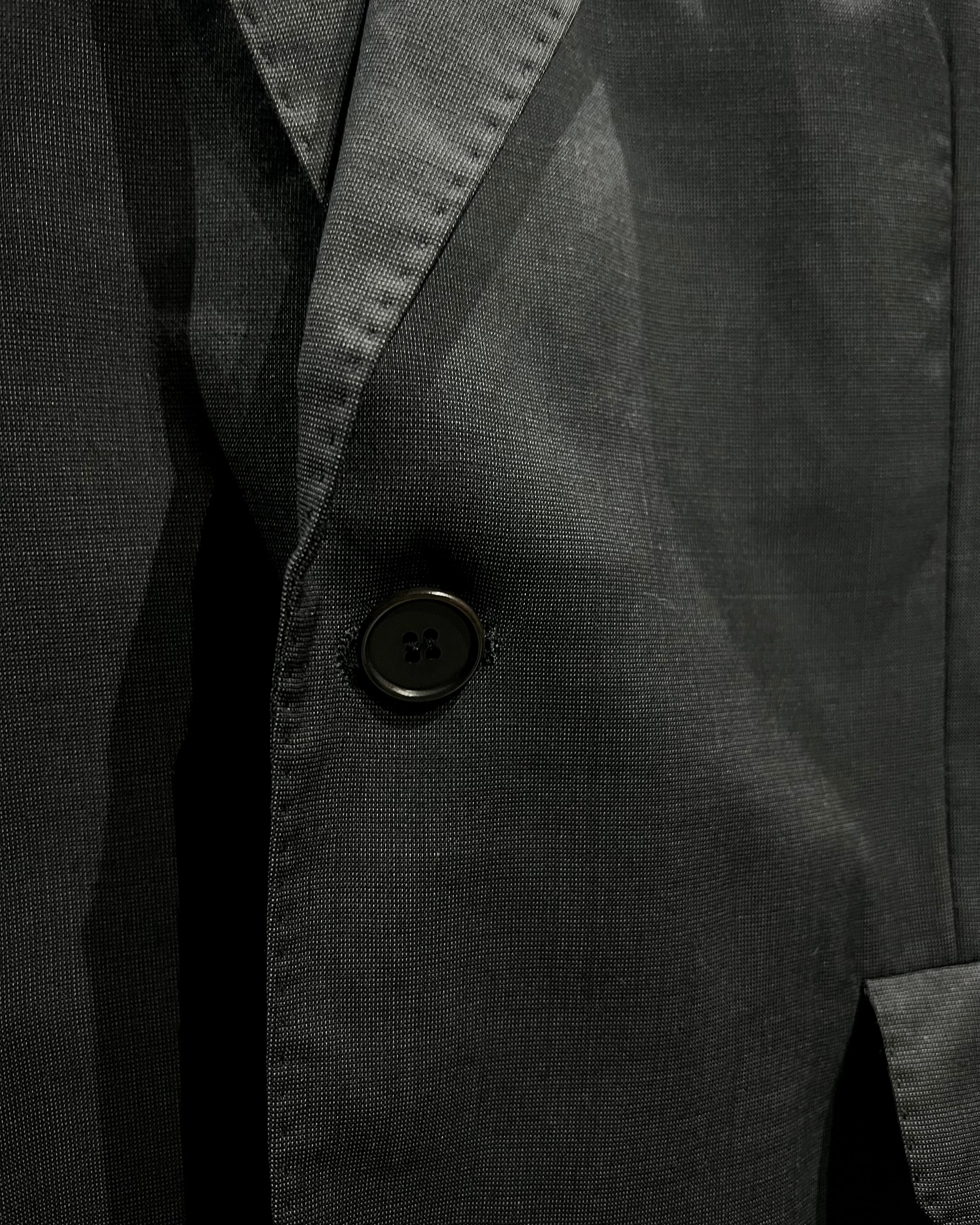 フロントはシングルブレスト仕様。無駄を削ぎ落としたラペルラインと端正なポケット配置により、パターンの美しさと縫製の丁寧さが際立ちます。