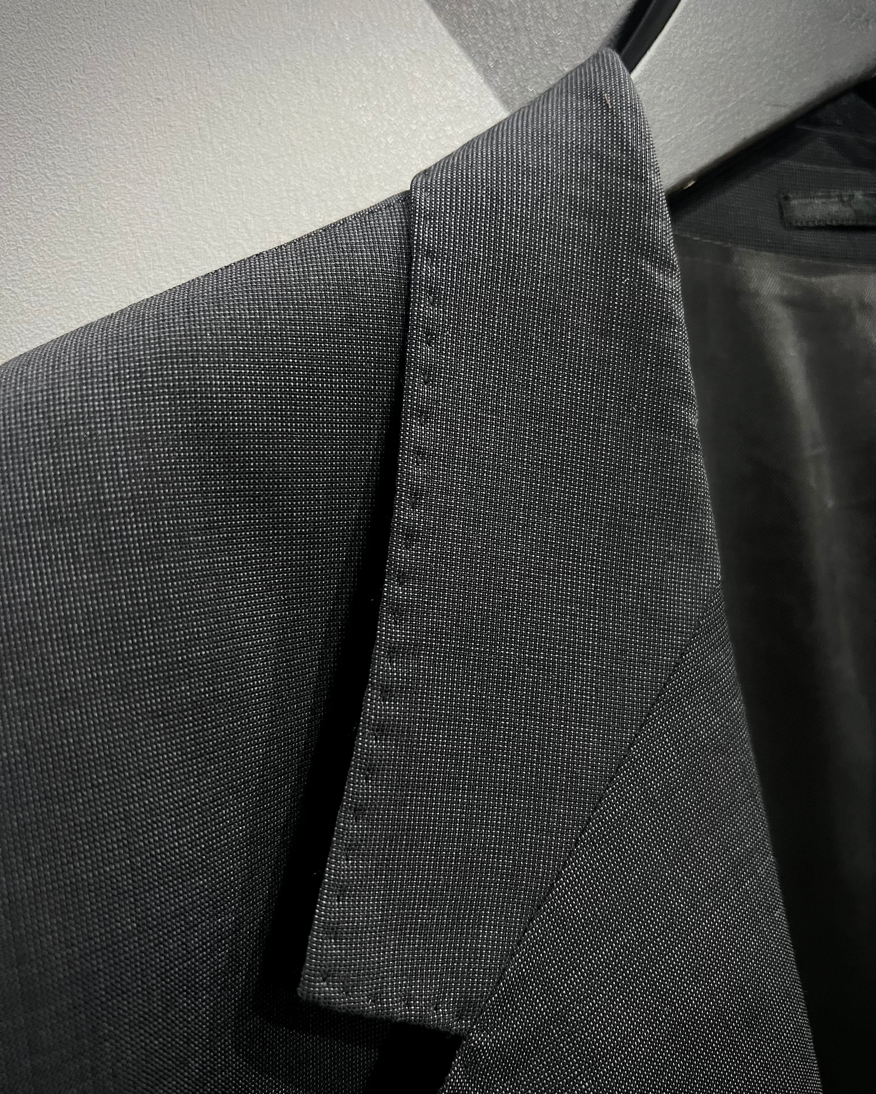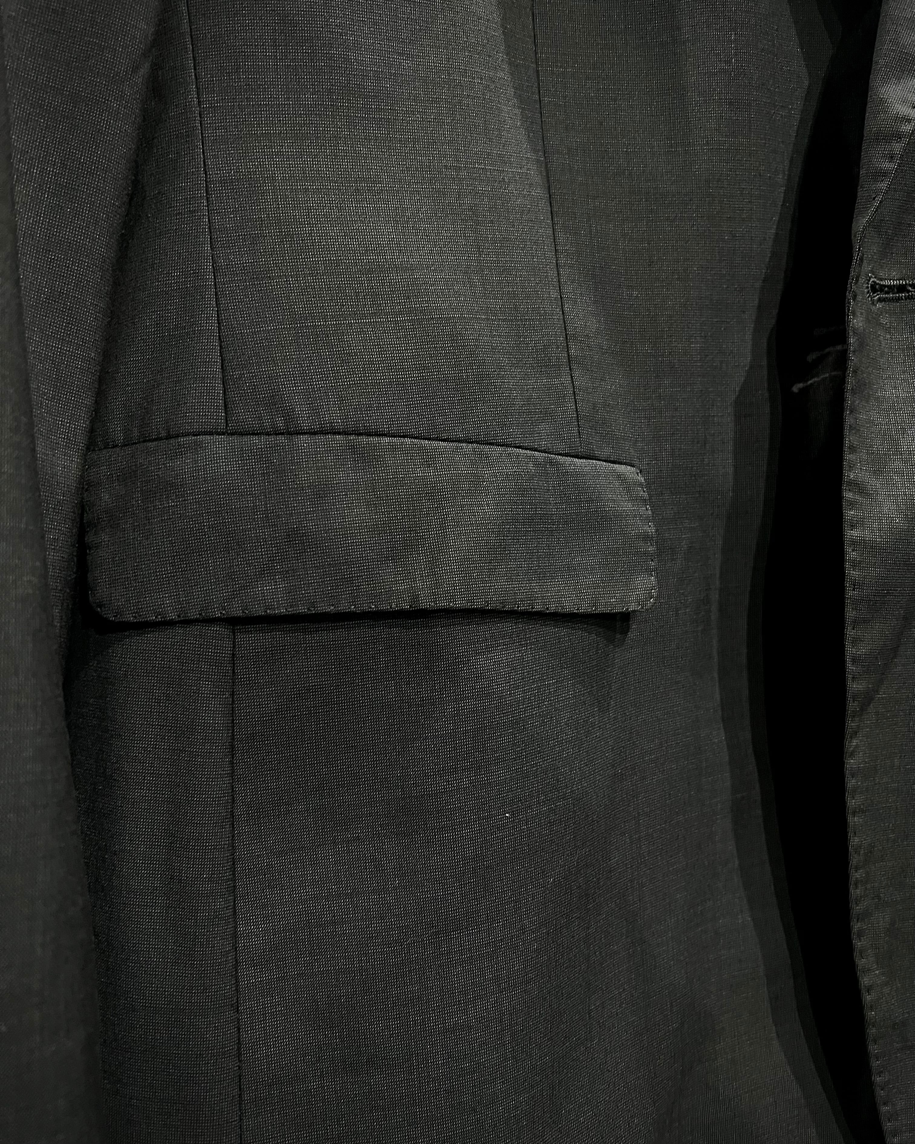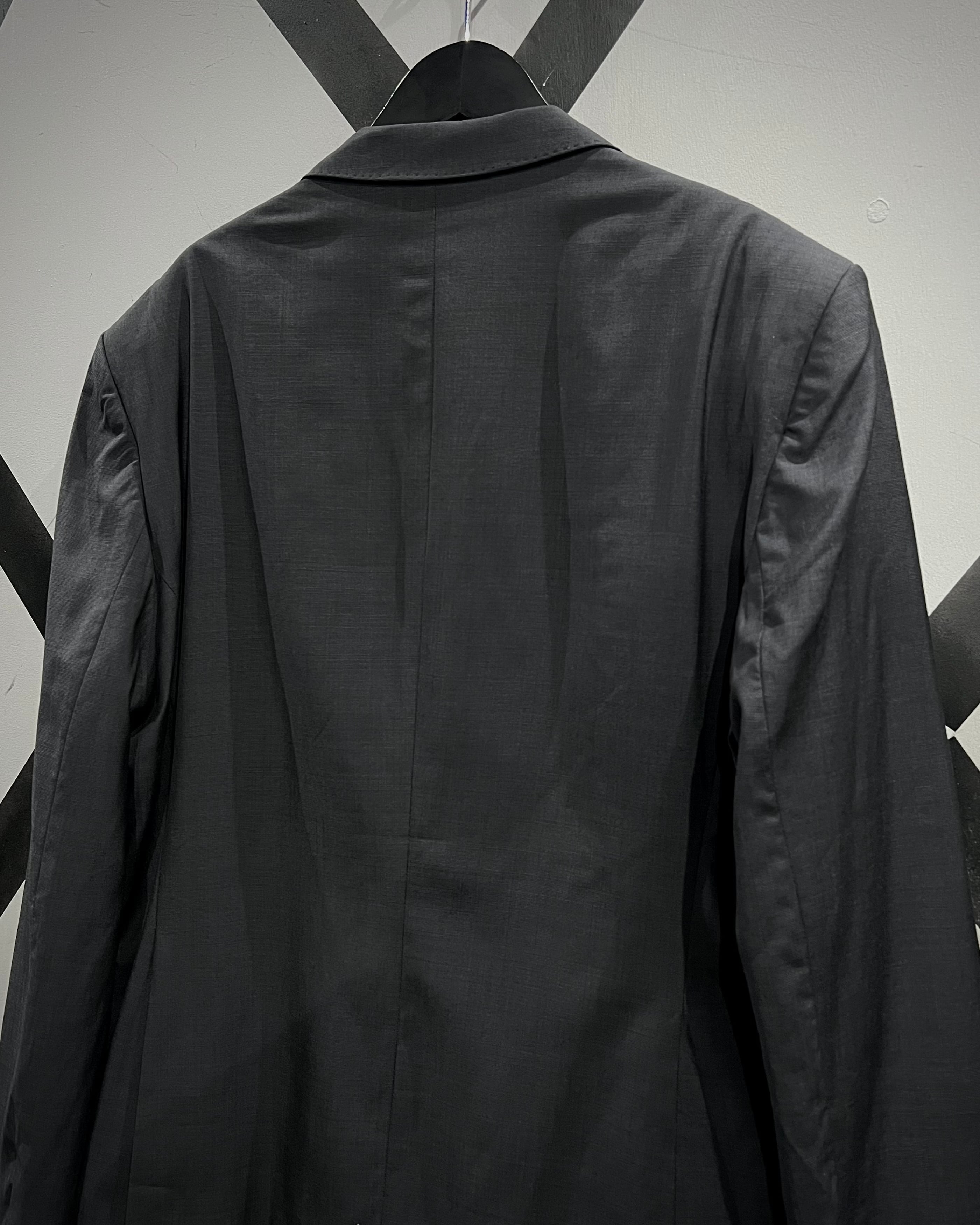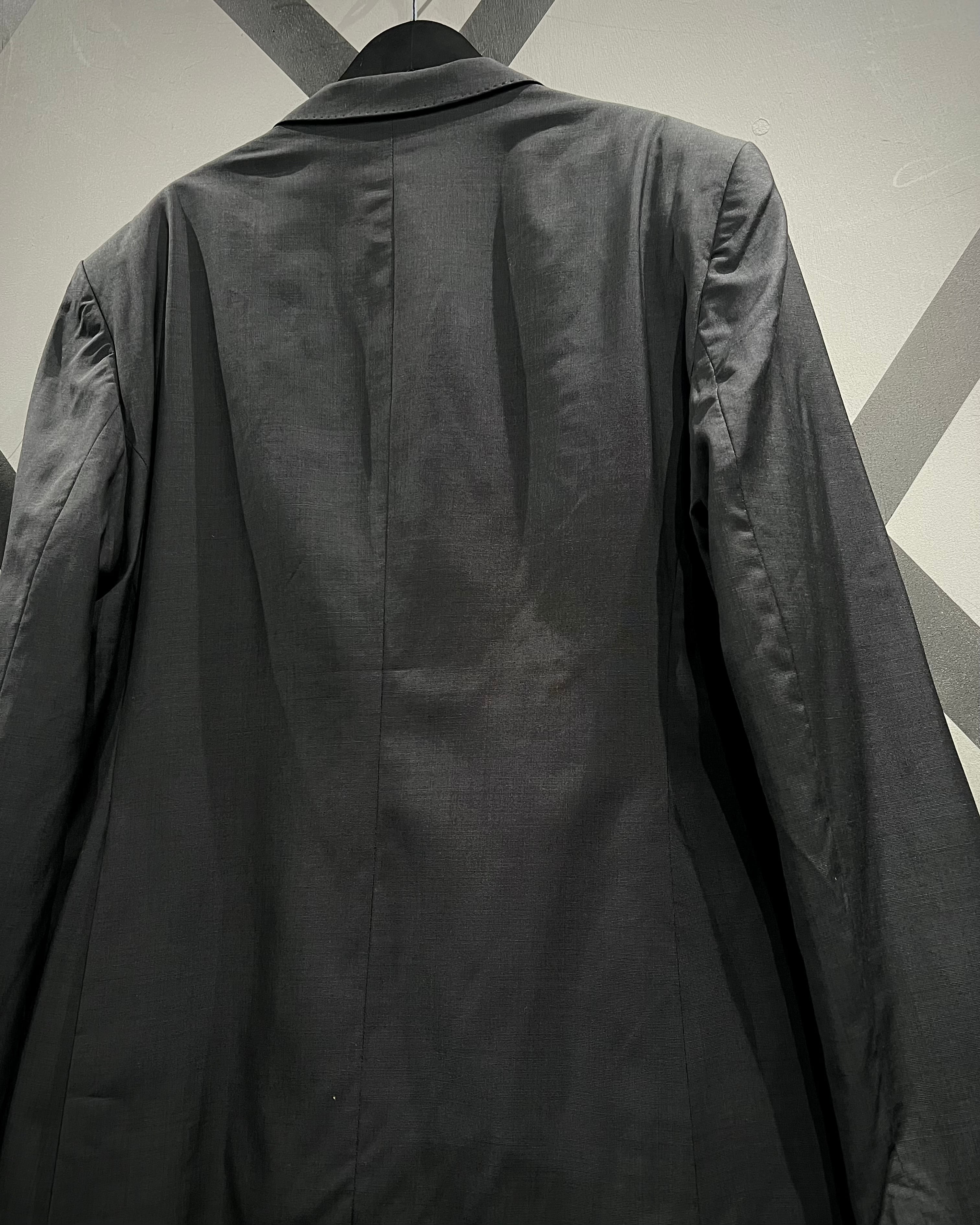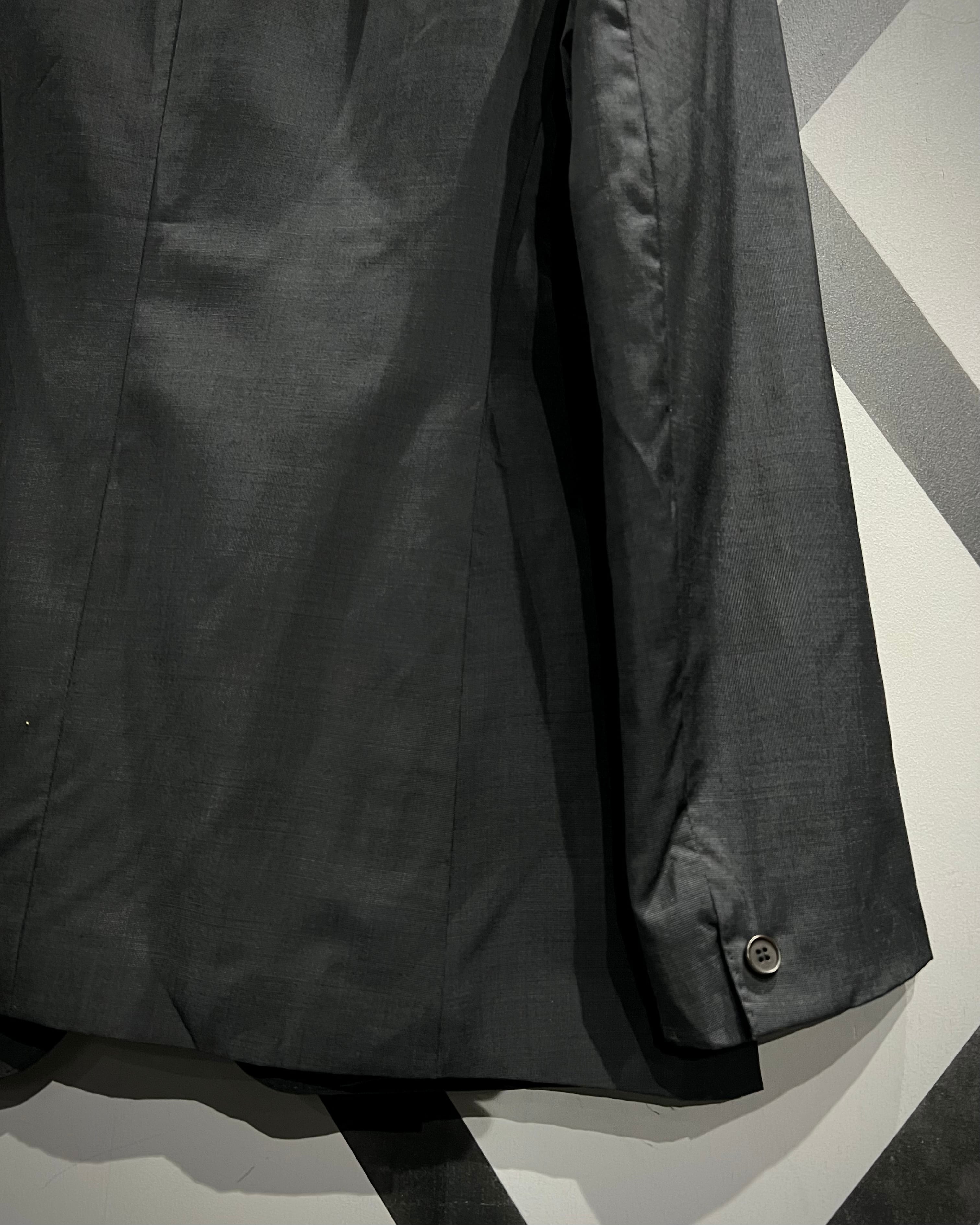 フロントはシングルブレスト仕様。無駄を削ぎ落としたラペルラインと端正なポケット配置により、パターンの美しさと縫製の丁寧さが際立ちます。