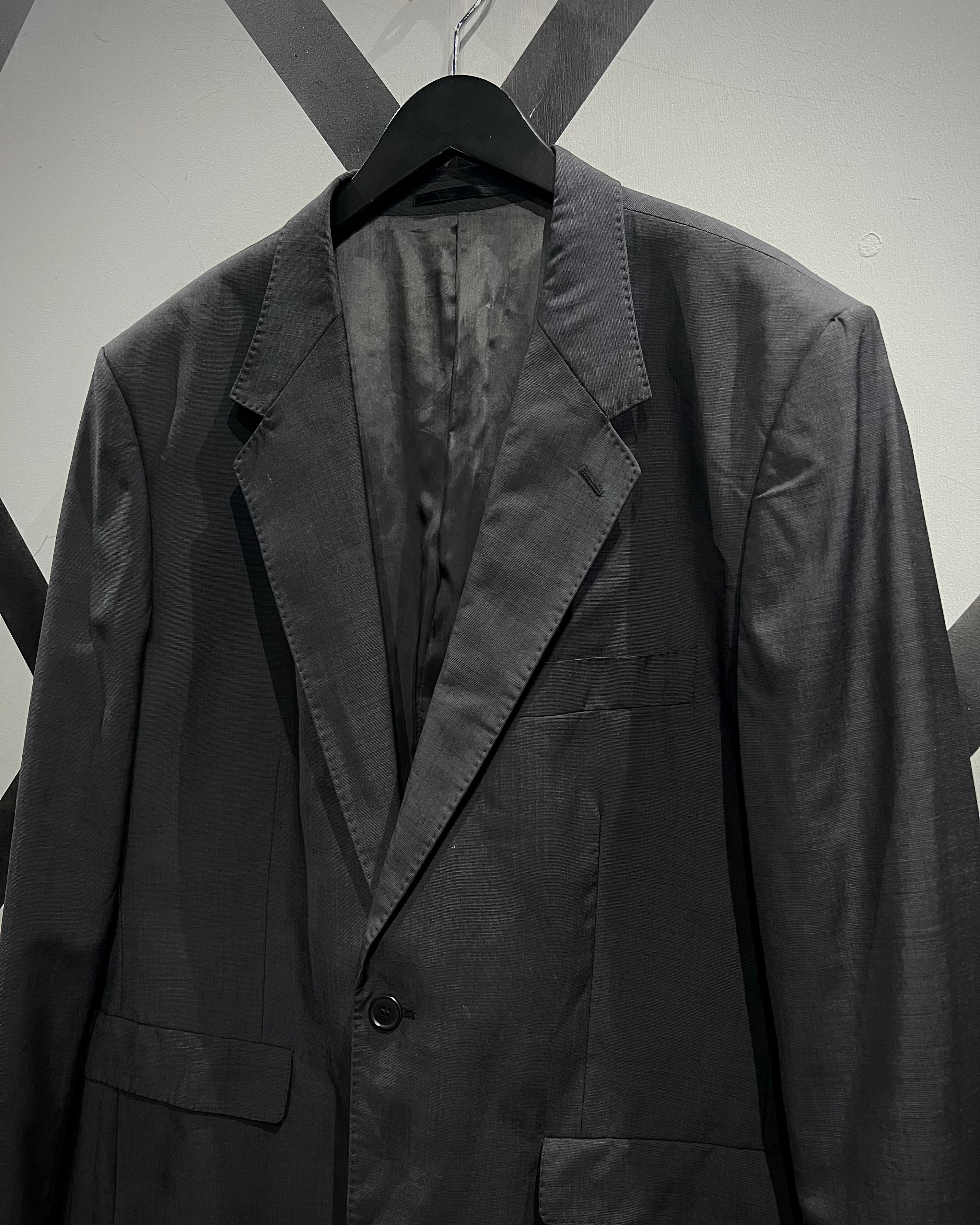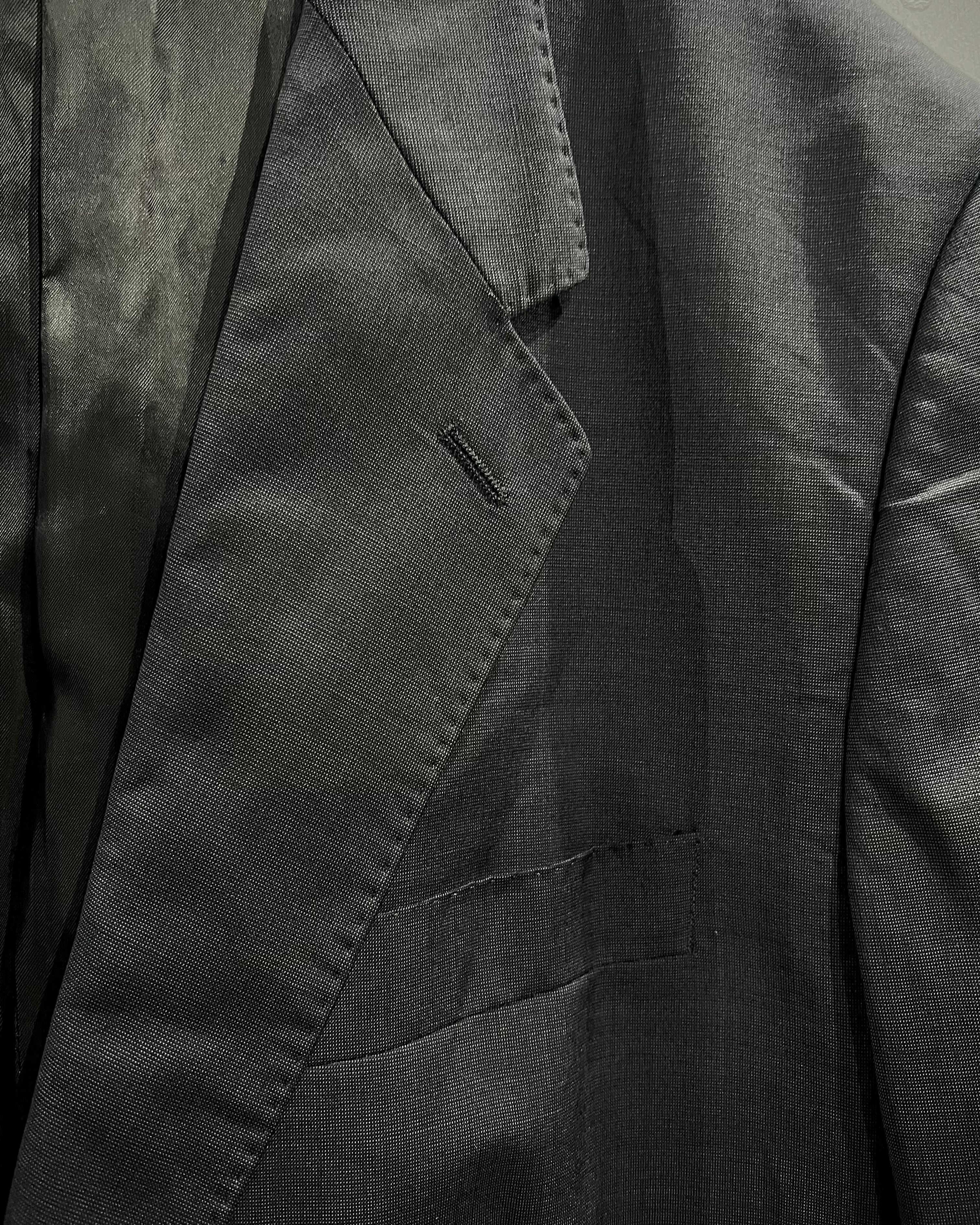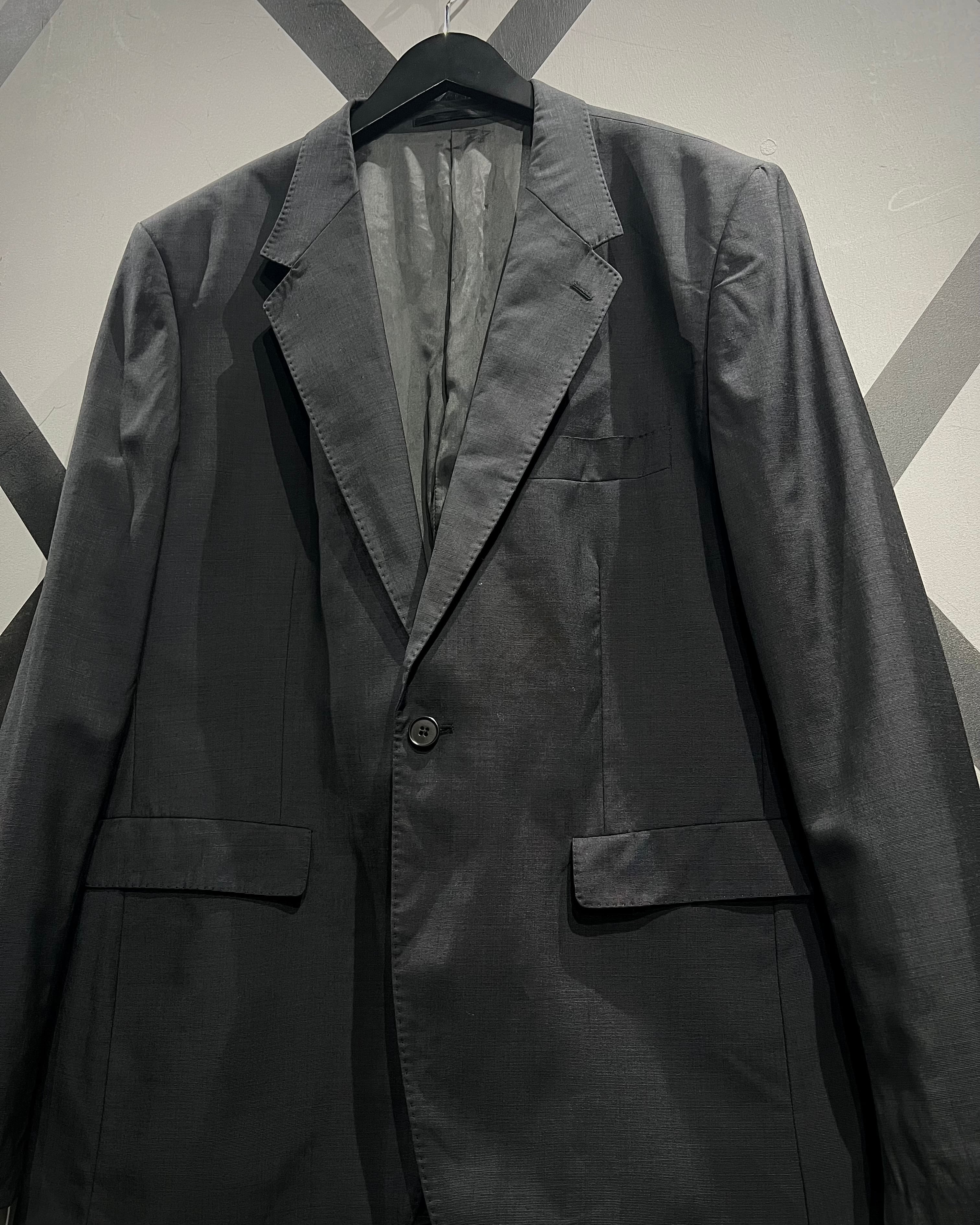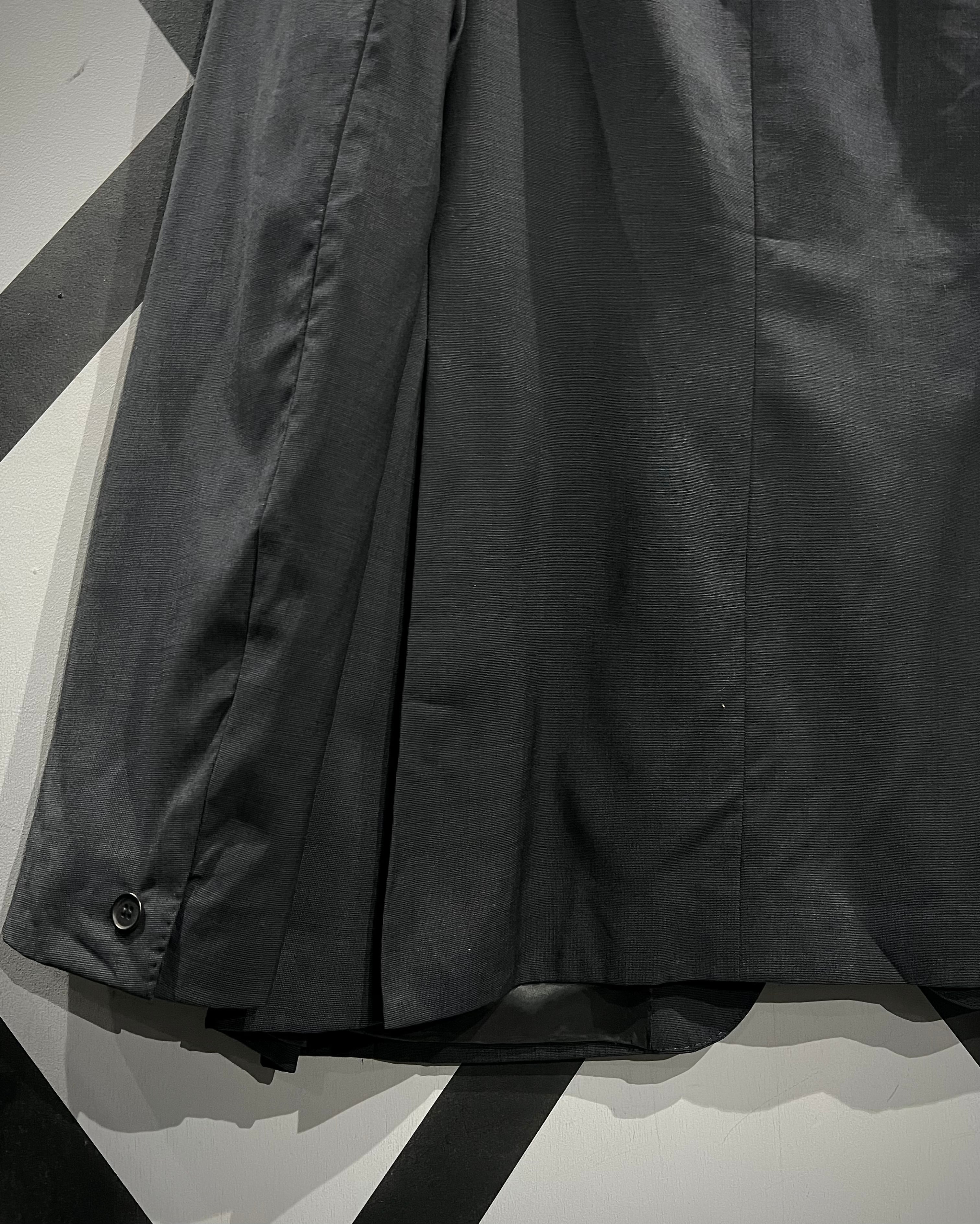 フロントはシングルブレスト仕様。無駄を削ぎ落としたラペルラインと端正なポケット配置により、パターンの美しさと縫製の丁寧さが際立ちます。