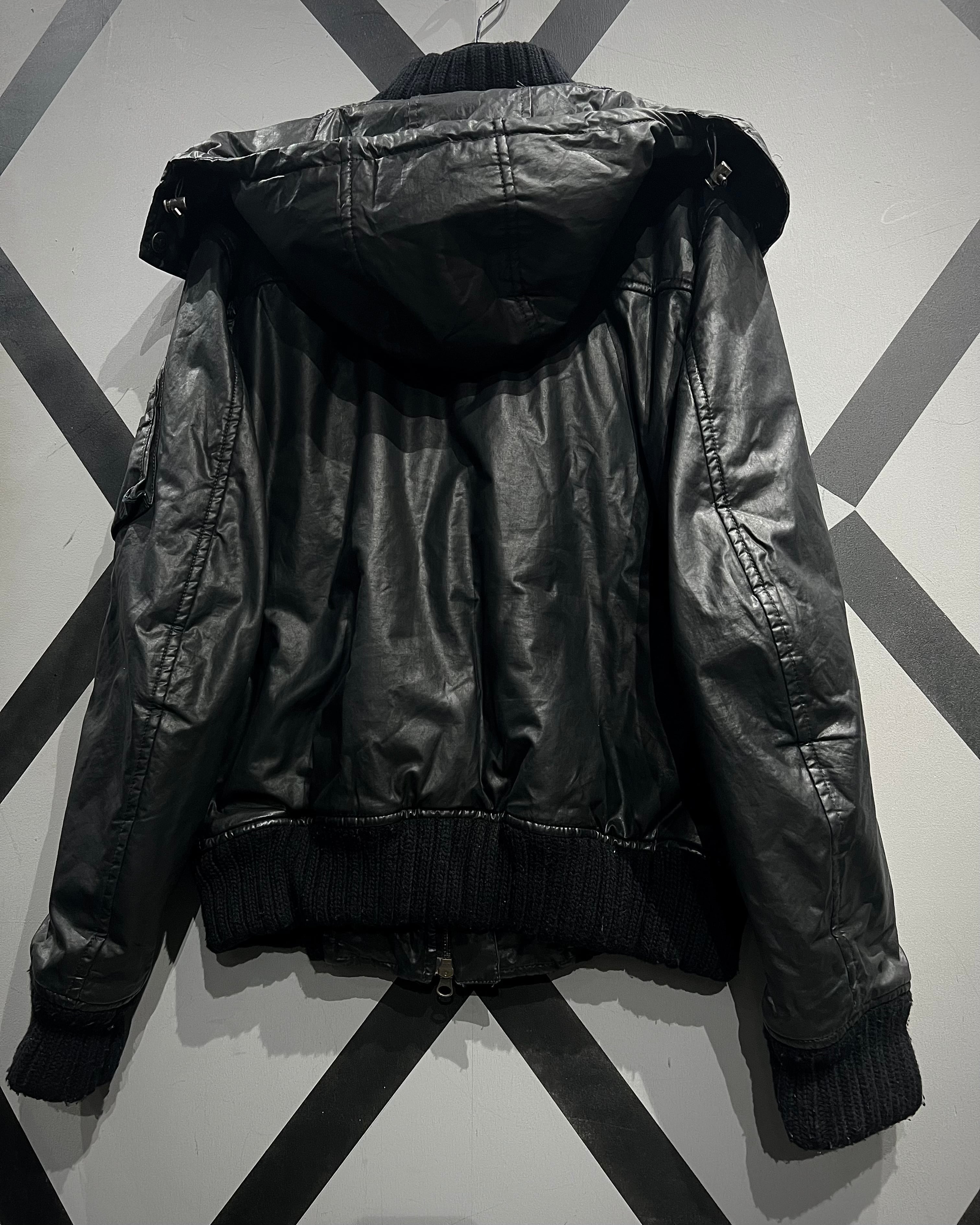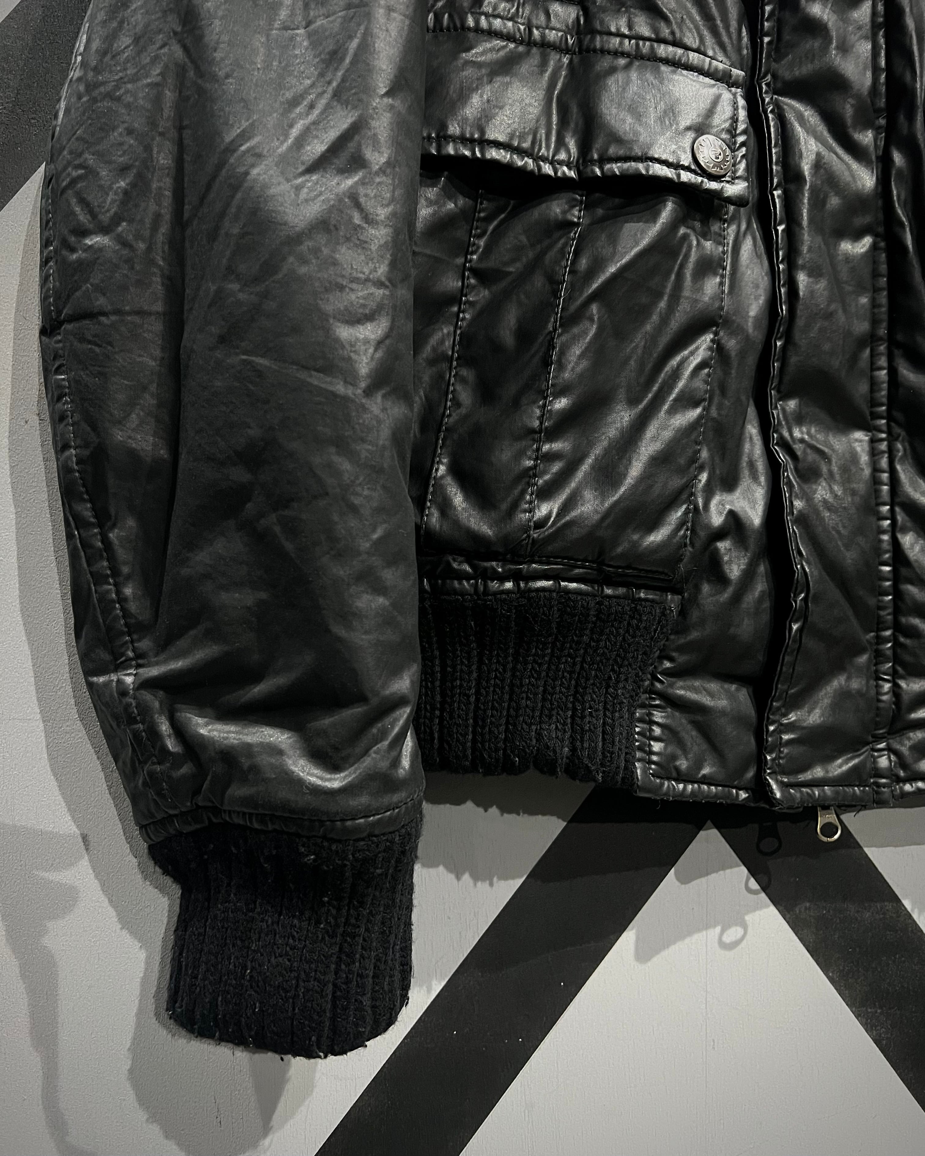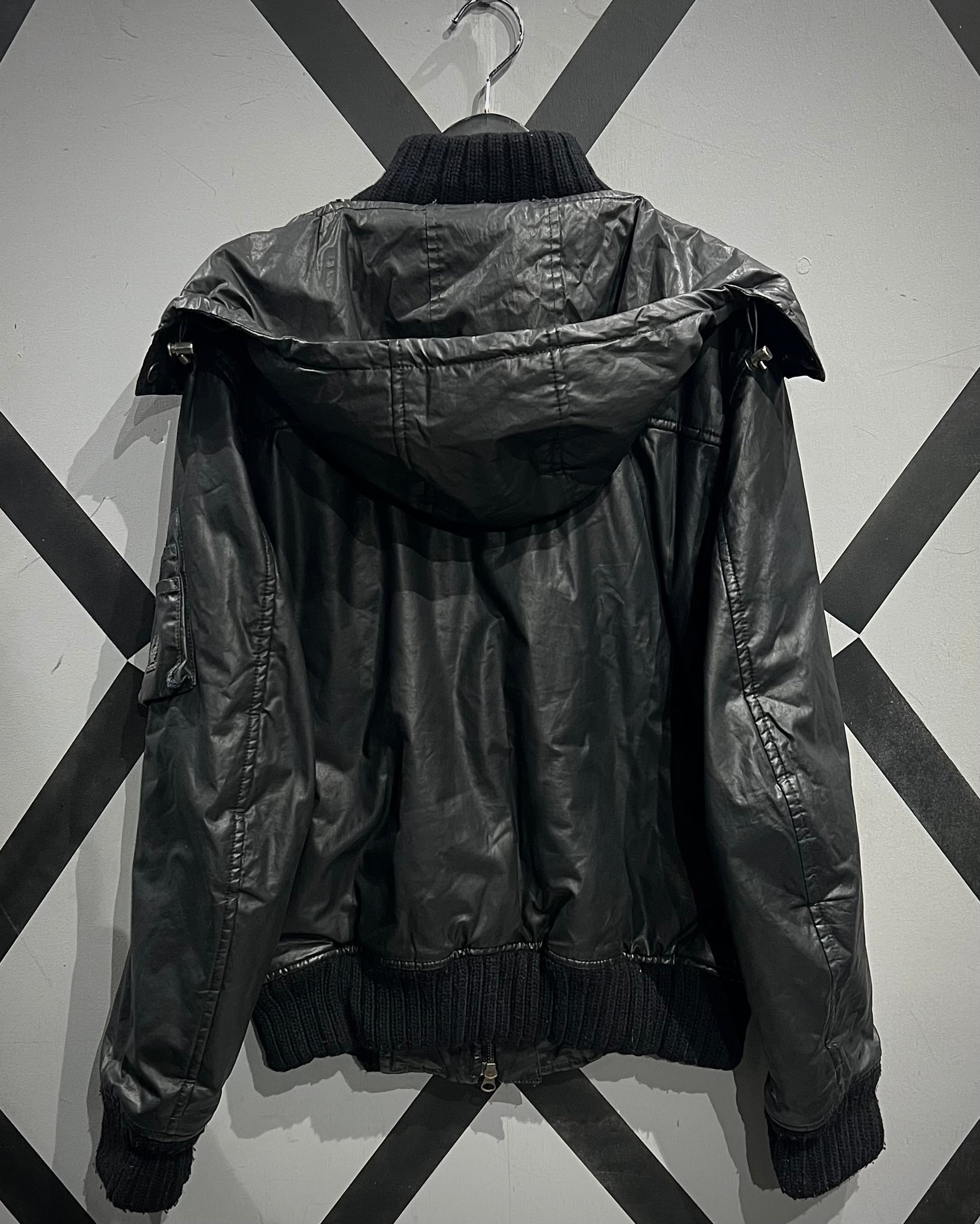 フライトジャケットをデザインソースに、重厚感のあるブラックボディで構成。独特の鈍い光沢を帯びた素材使いがソリッドで、ミリタリーを軸にしながらもモードな空気感を纏っています。