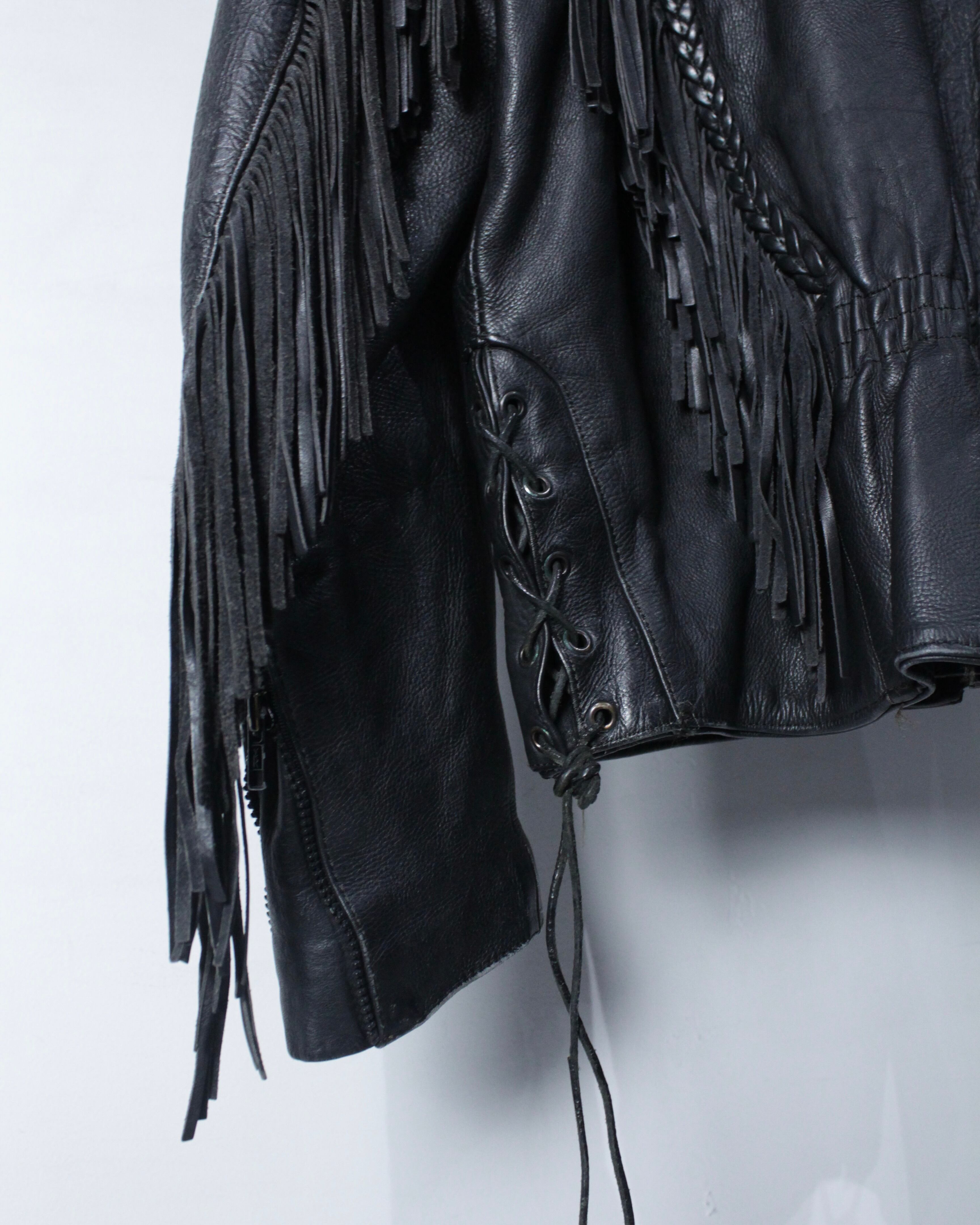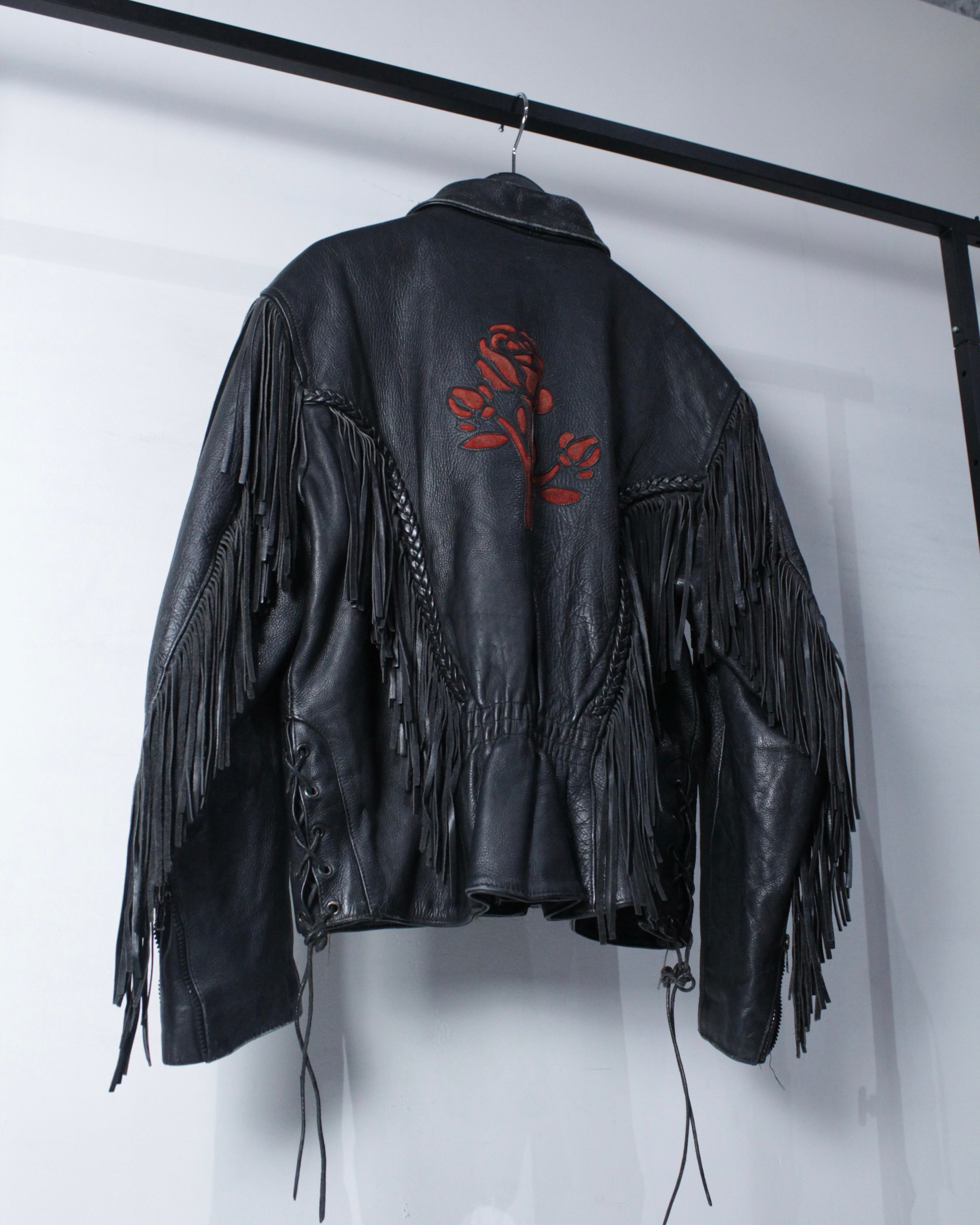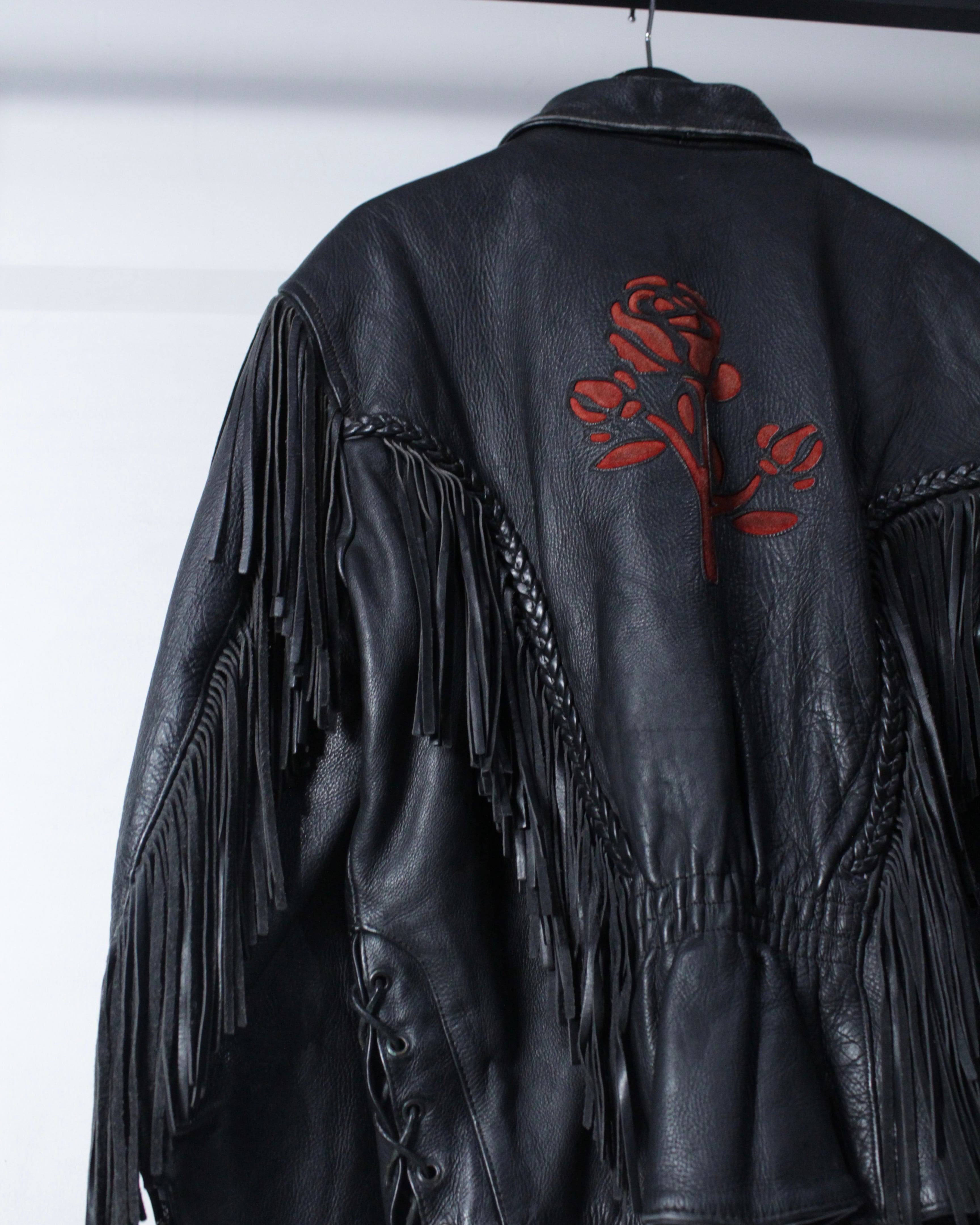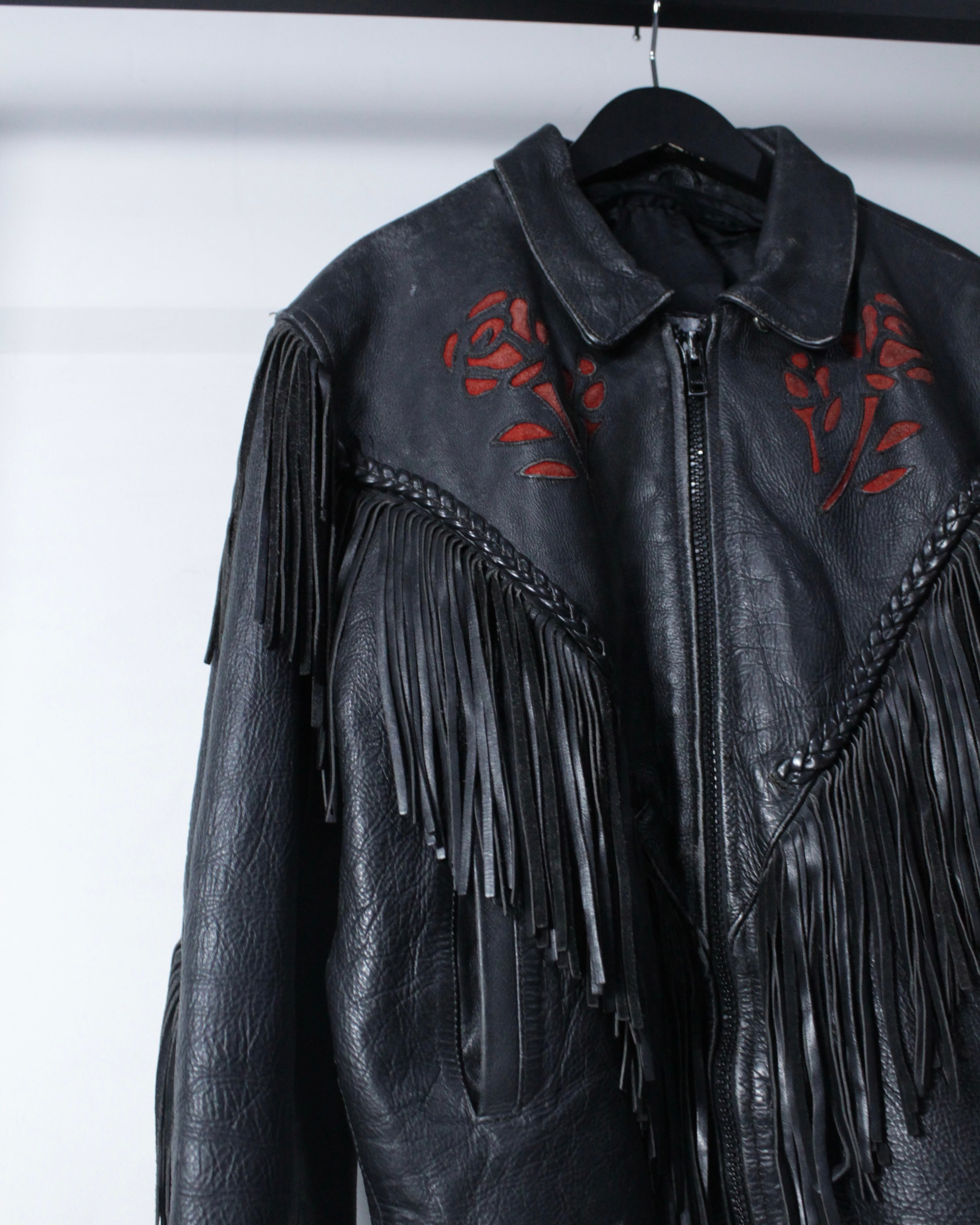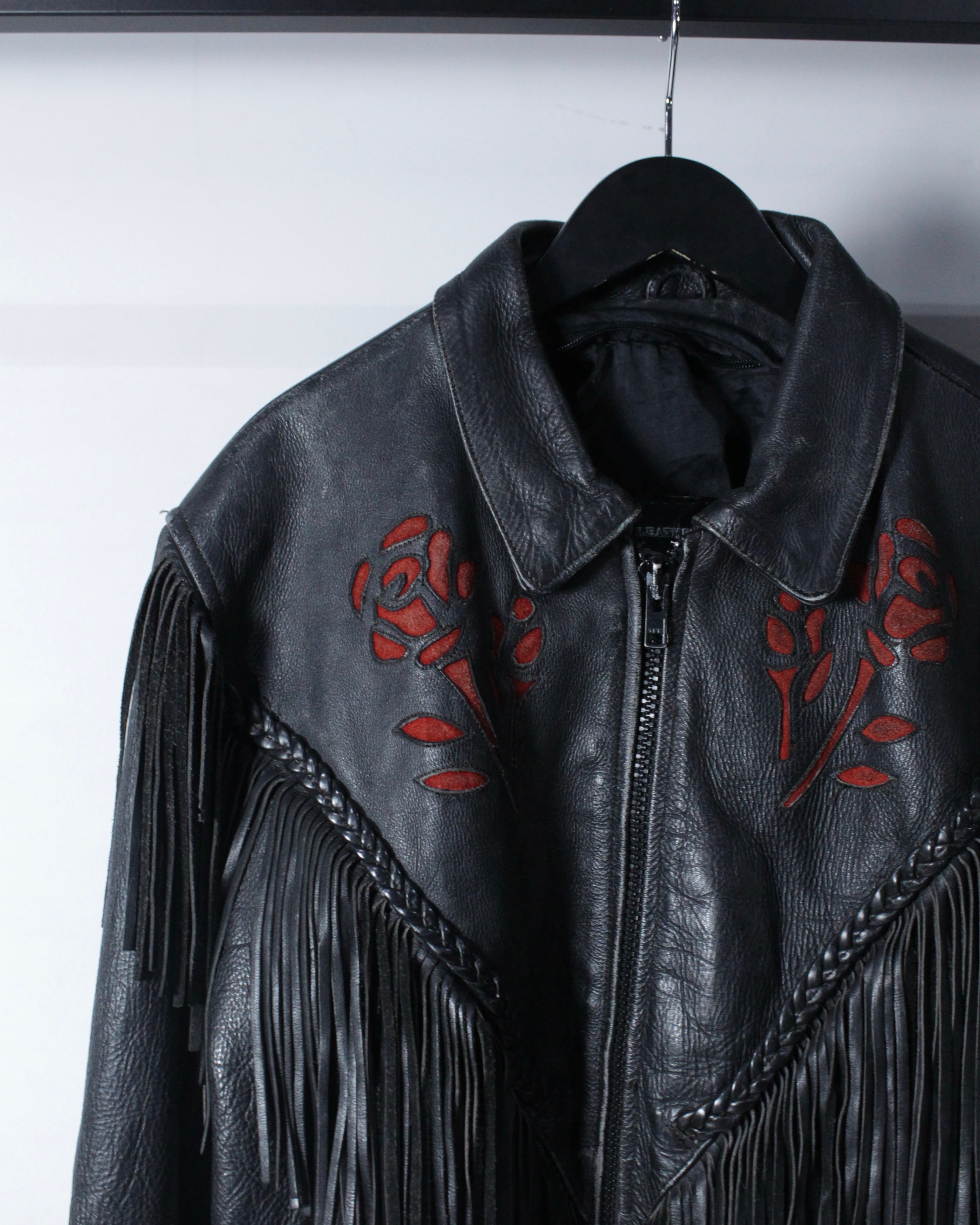 フリンジ、薔薇、レザーという強い要素を1着にまとめ上げた、スペシャルなレザージャケットです。