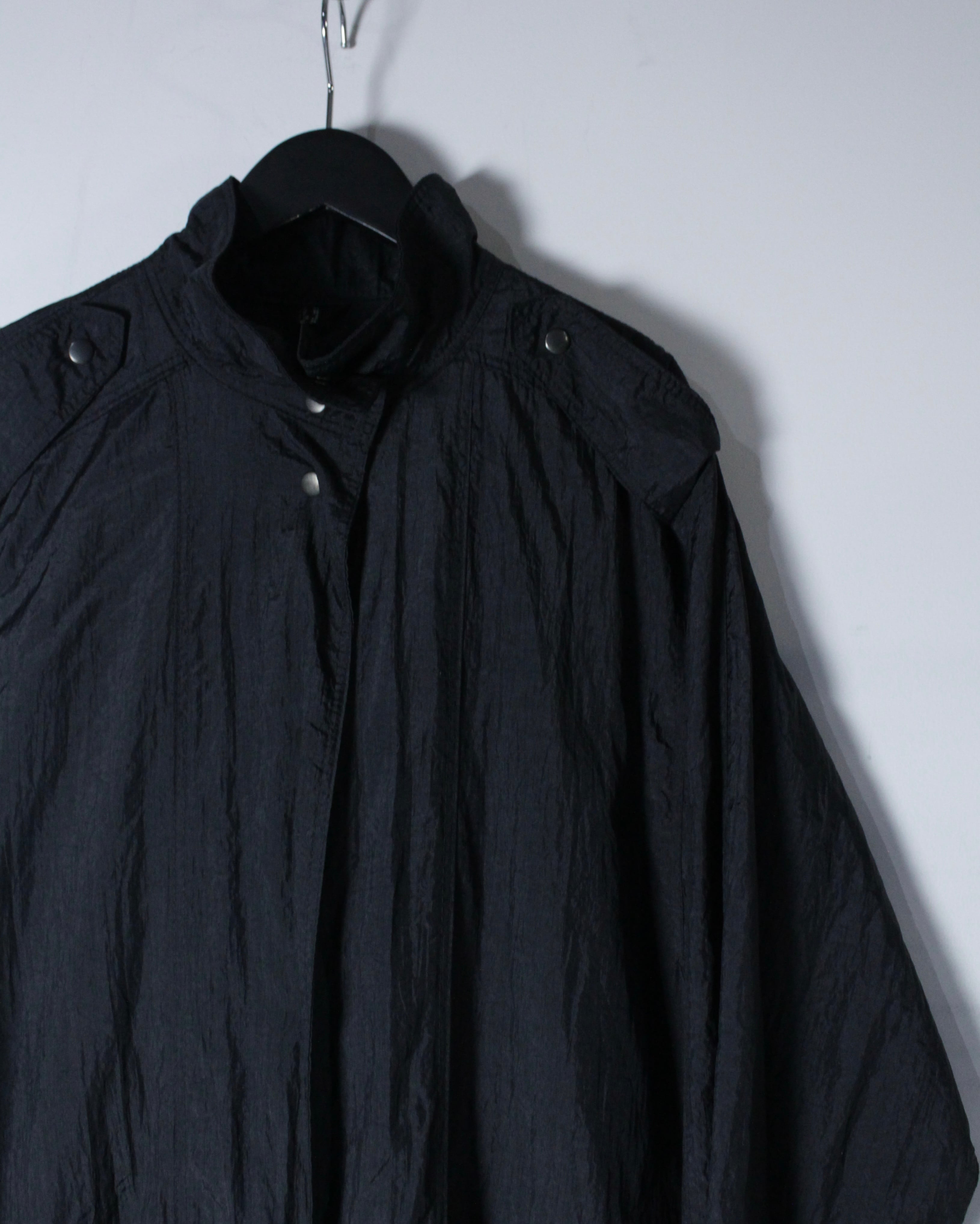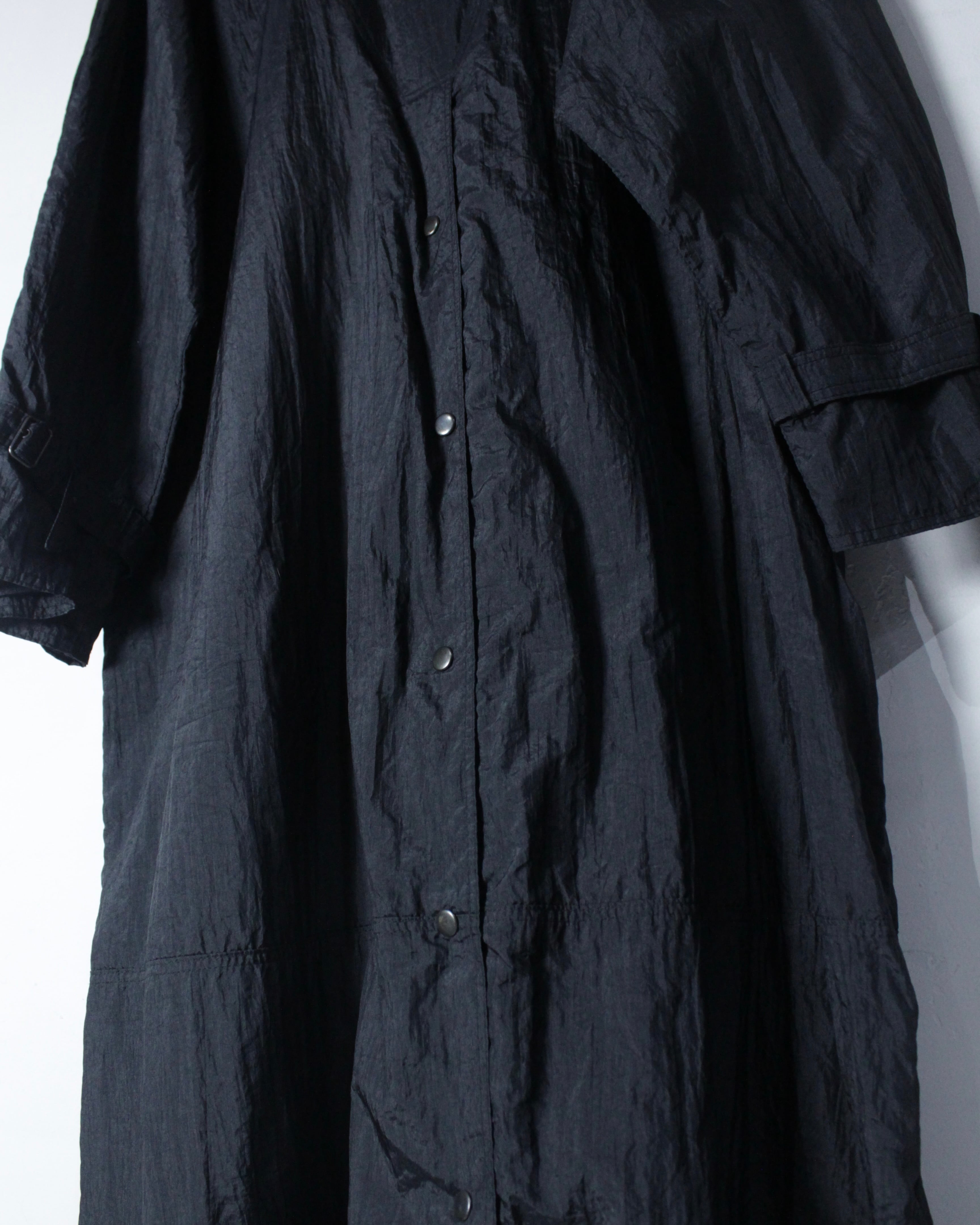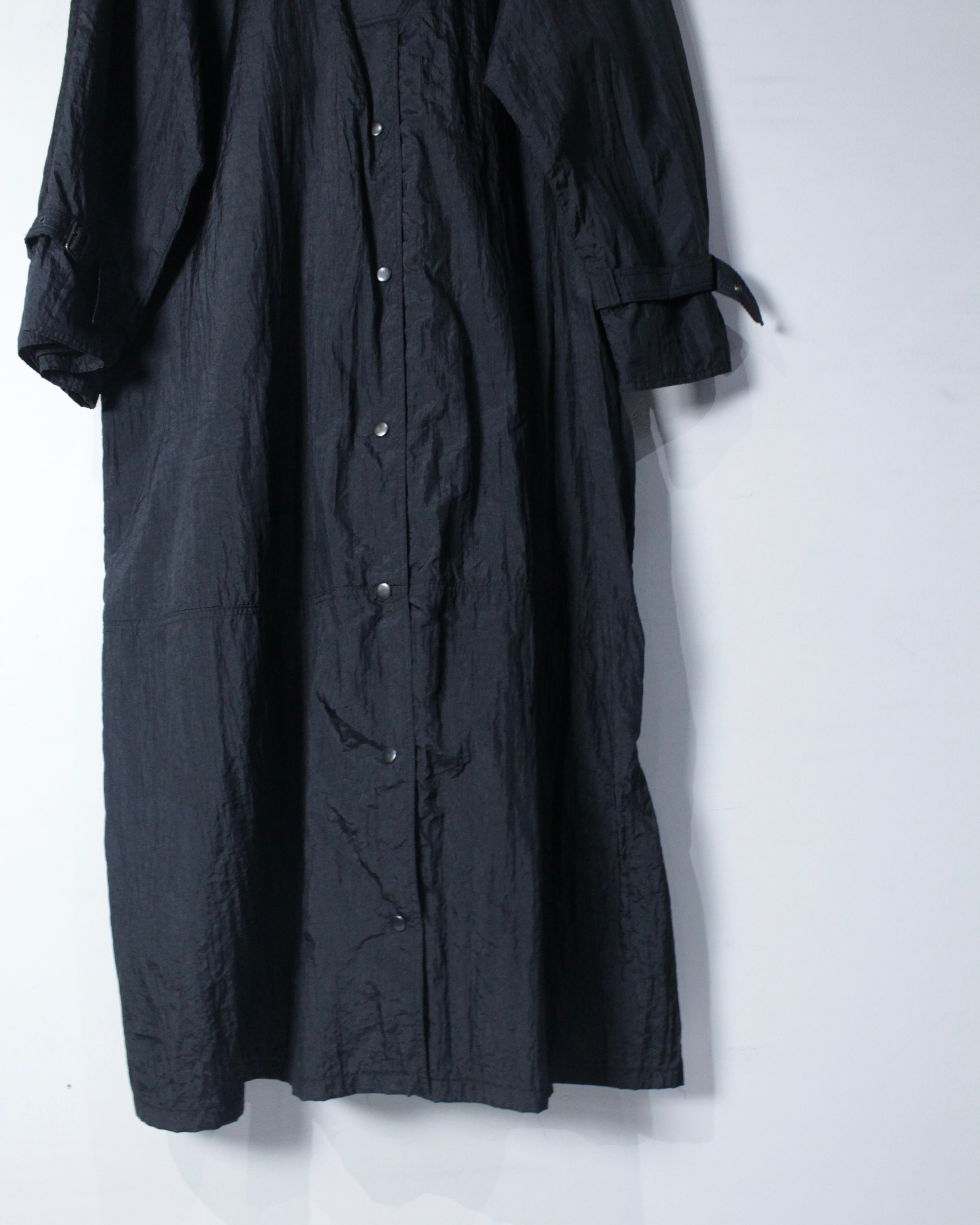 しっとりと落ち着いたブラックトーンでまとめられた、ミニマルかつ存在感のあるロングコート。