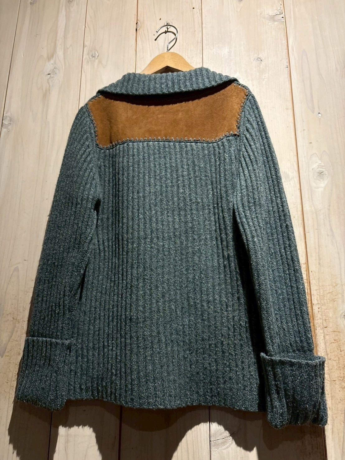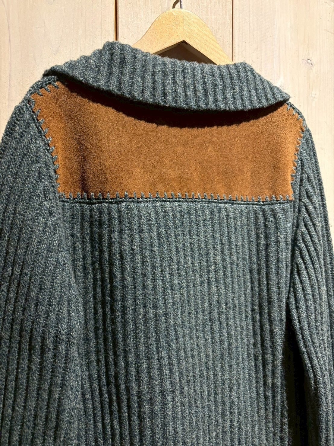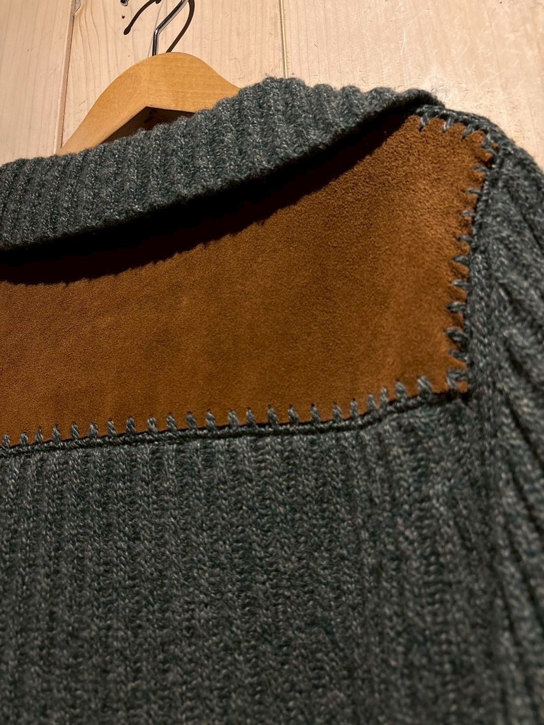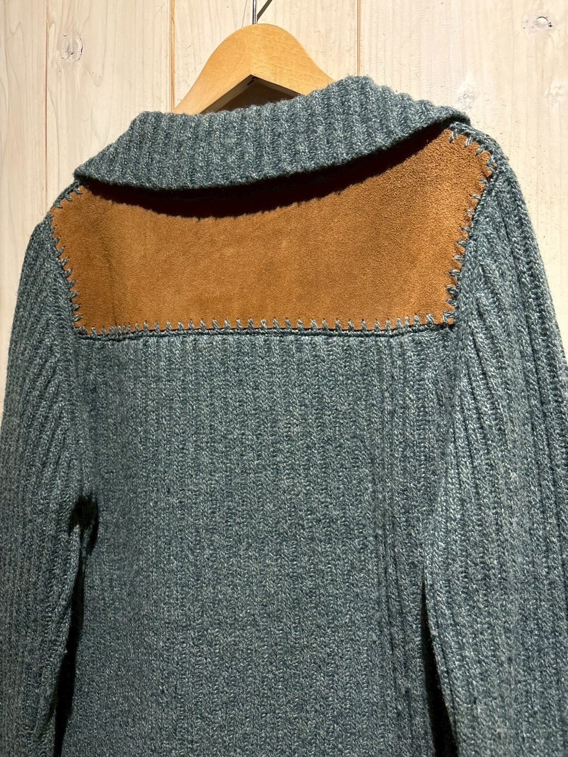 ライトブルーのメランジが美しく表情を作るニットボディをベースに、ヨーク部分をしっとりとした質感のスエードレザーで切り替えた、異素材のコントラストが際立つ1着。