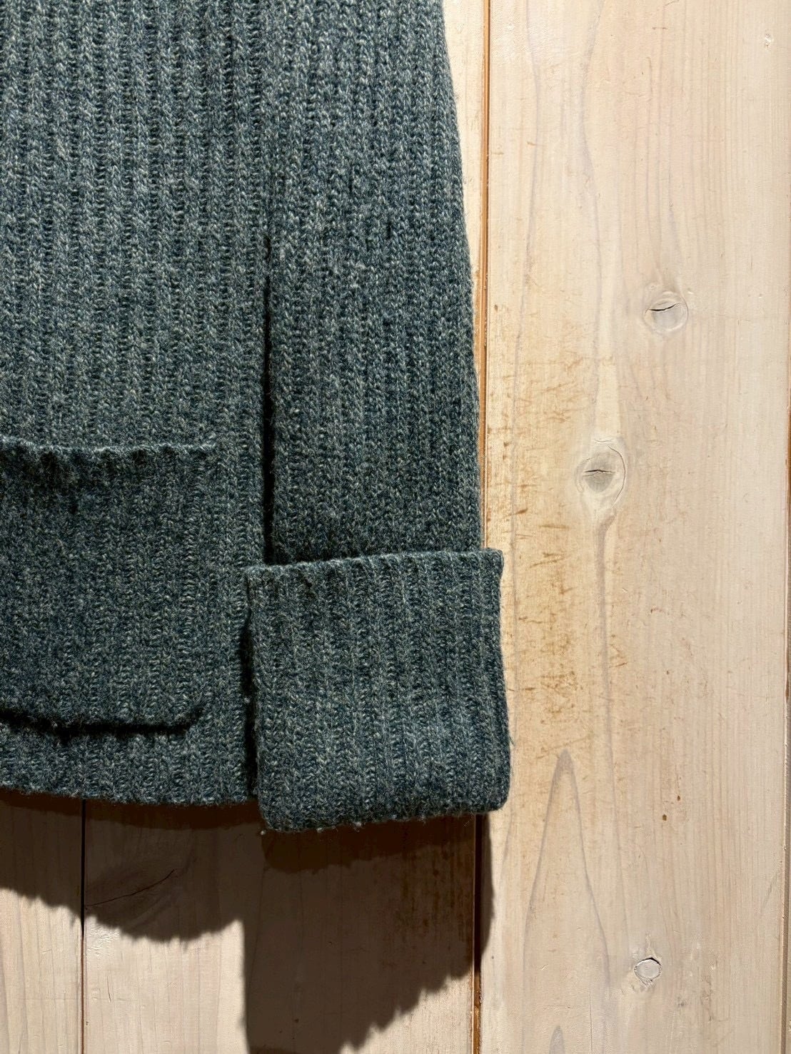 ニットの柔らかさとレザーの奥行きが重なり、落ち着いた中にも確かな存在感を感じさせます。