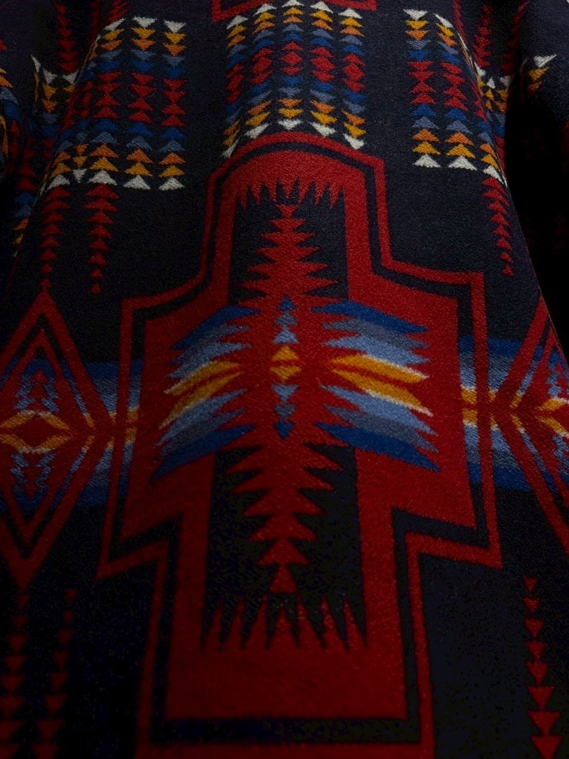 肉厚で保温性に優れたウールファブリックをベースに、赤、ネイビー、イエロー、サックスブルーといった多色使いで構成された、奥行きあるネイティブパターンを全面に配置した1着。