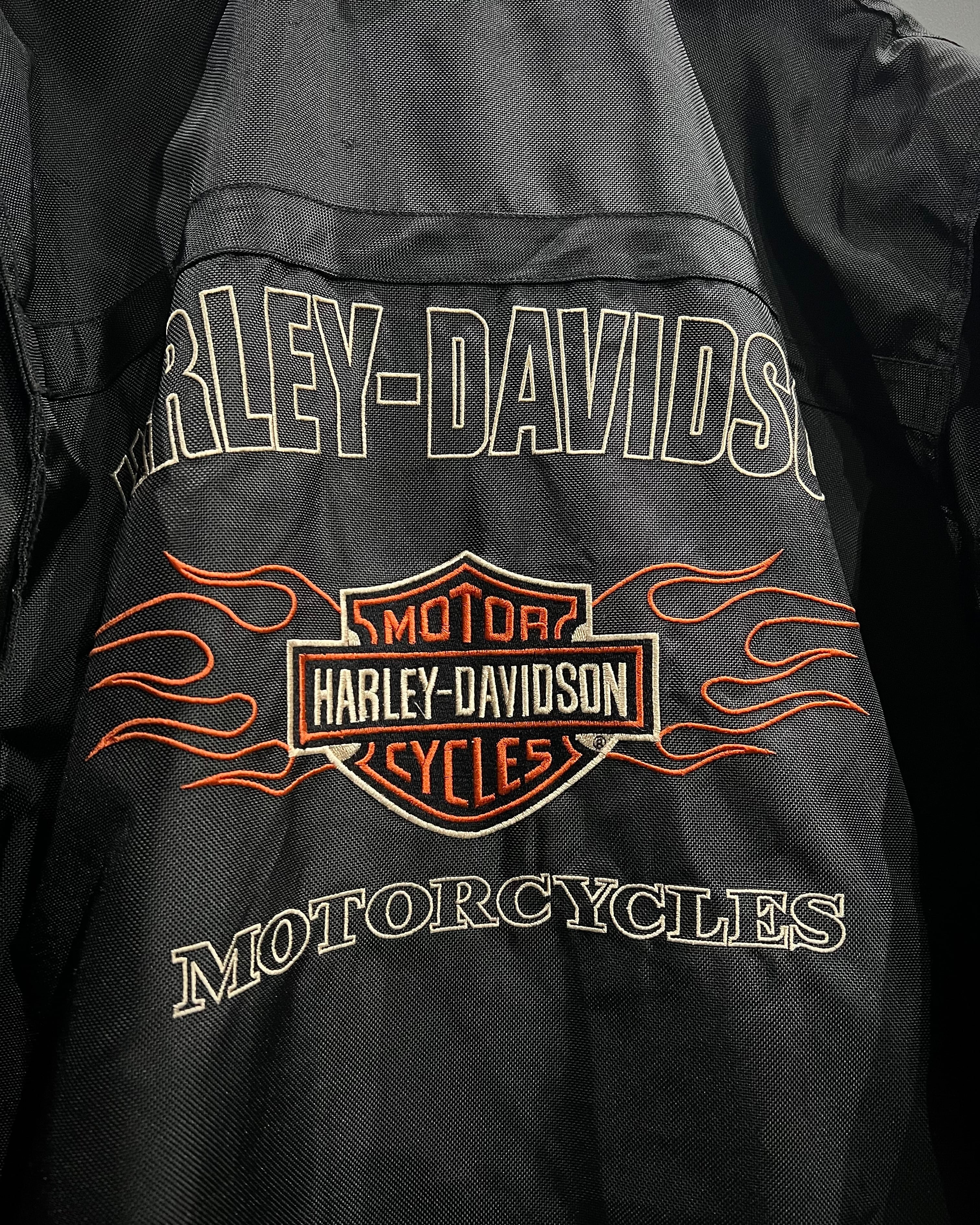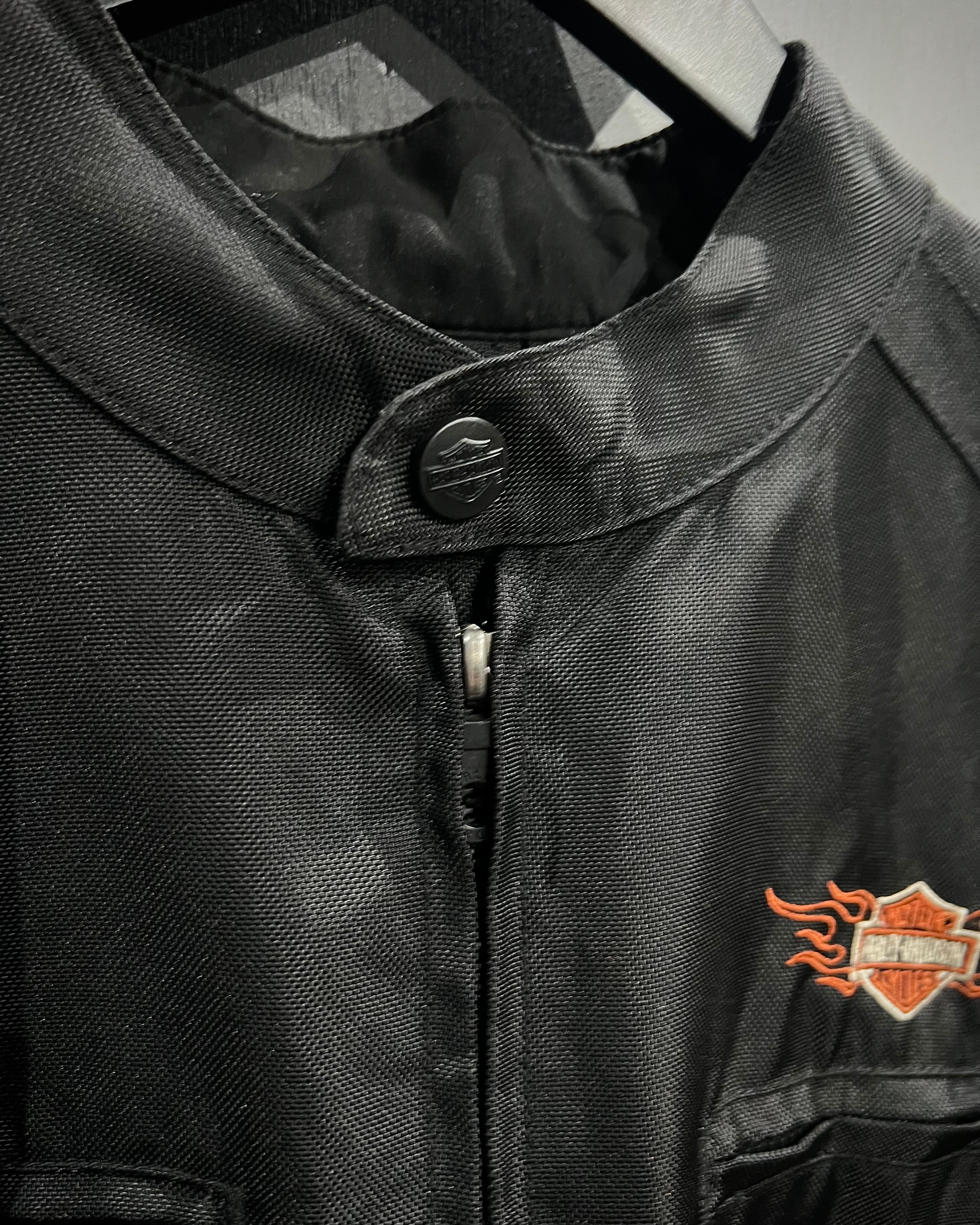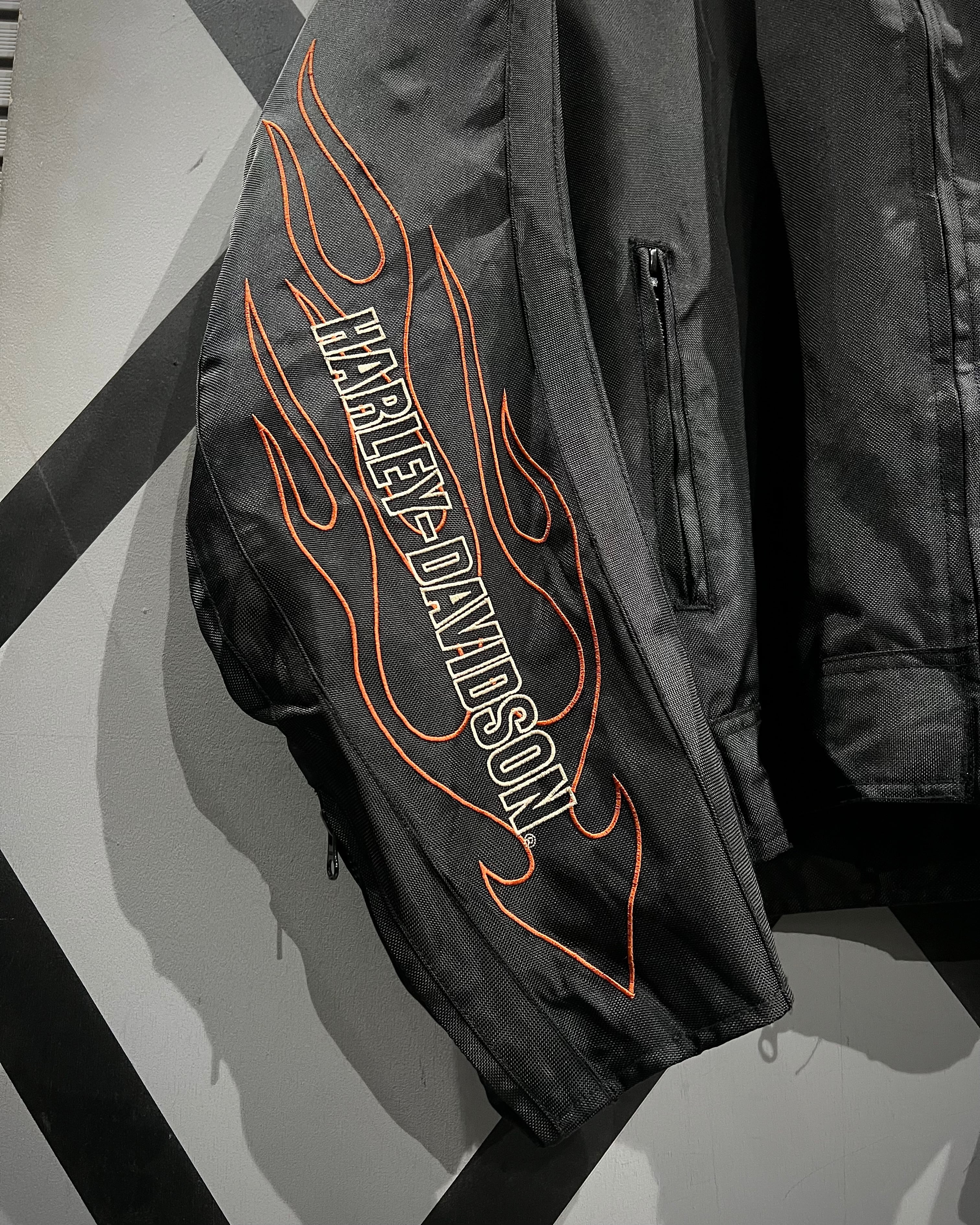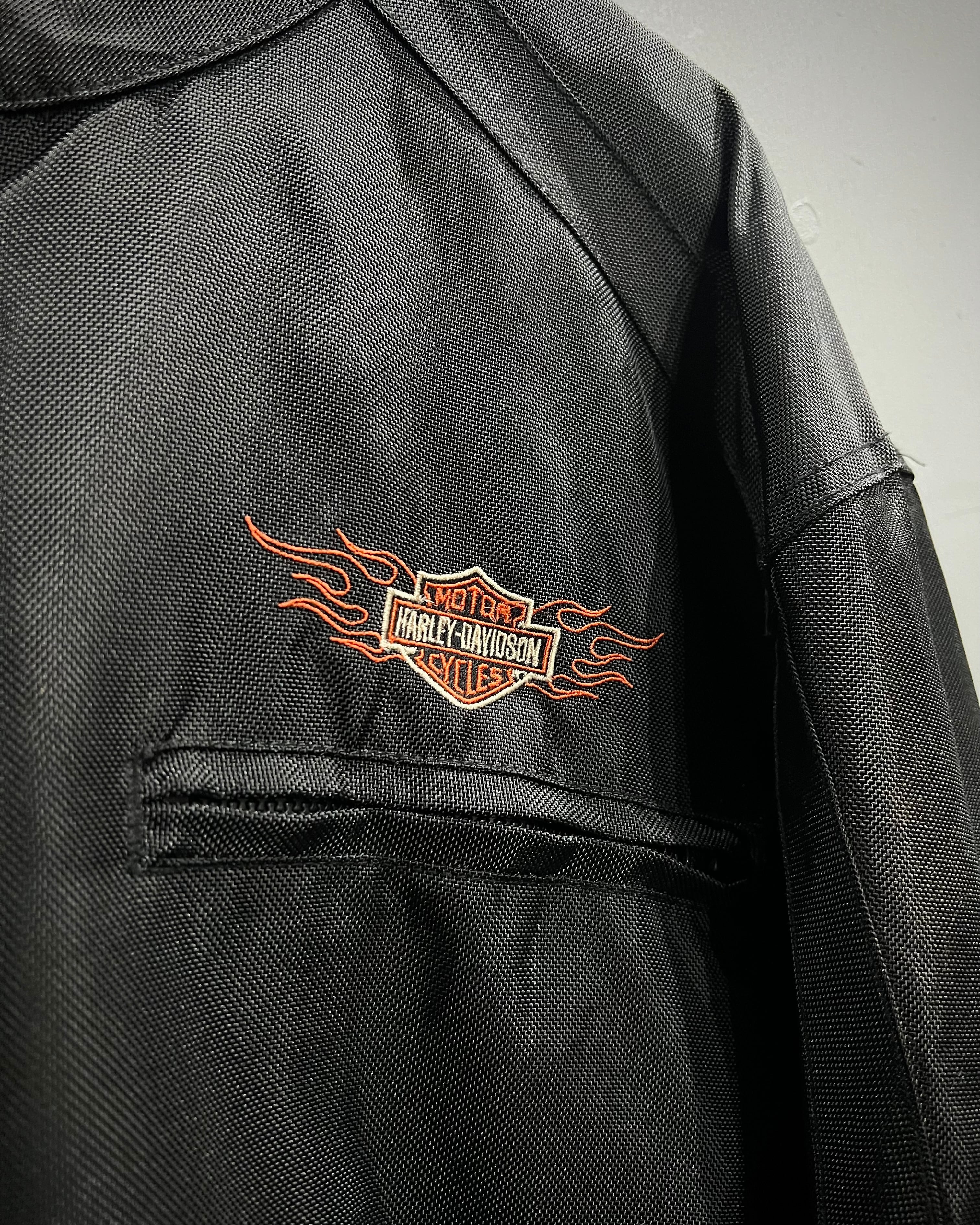 フロント胸元のロゴ刺繍に加え、両袖にはフレイムと“HARLEY-DAVIDSON”のロゴを大胆に配置。背面にもブランドを象徴するシールドロゴ刺繍が入り、前後左右どこから見ても抜かりのない仕上がりです。