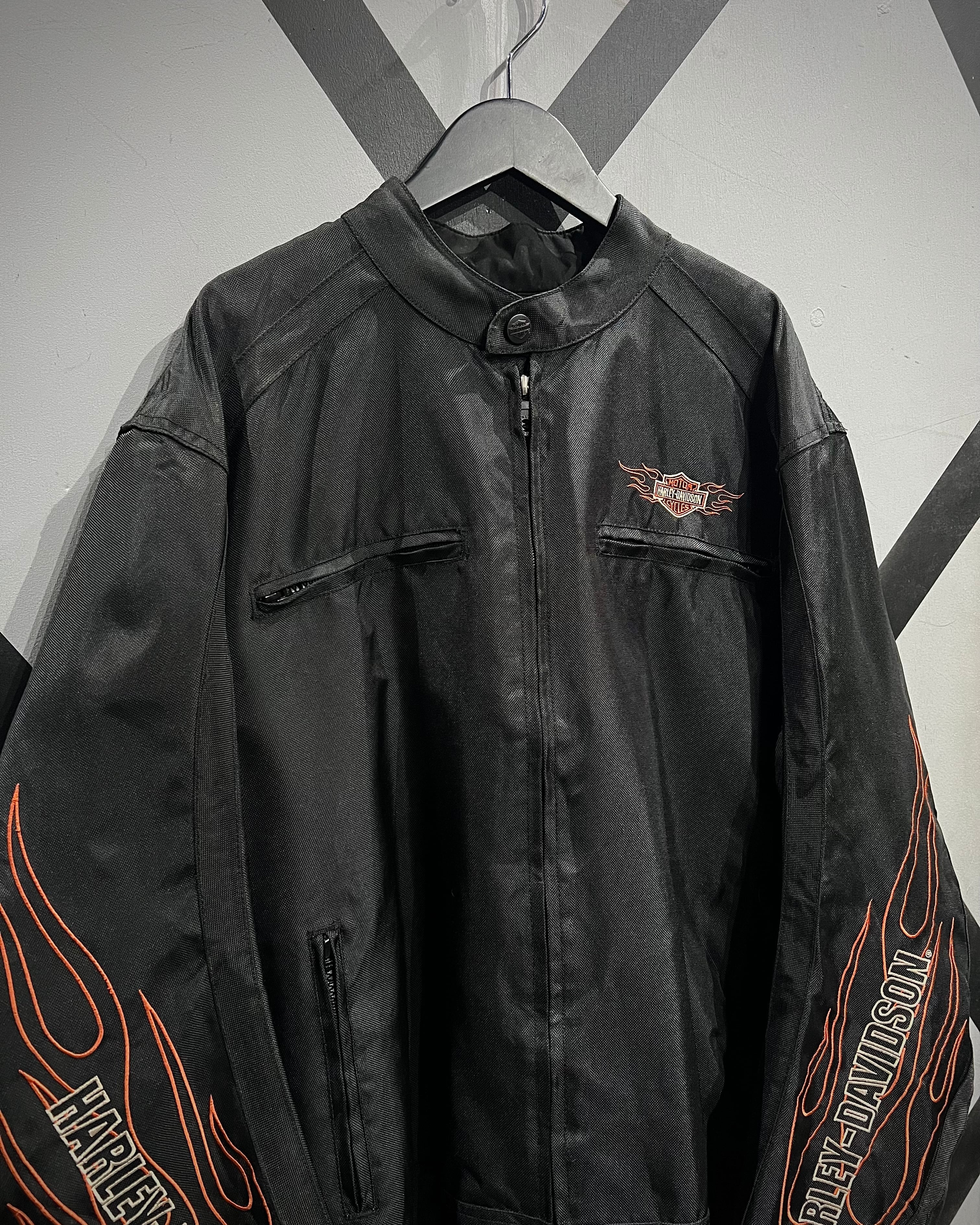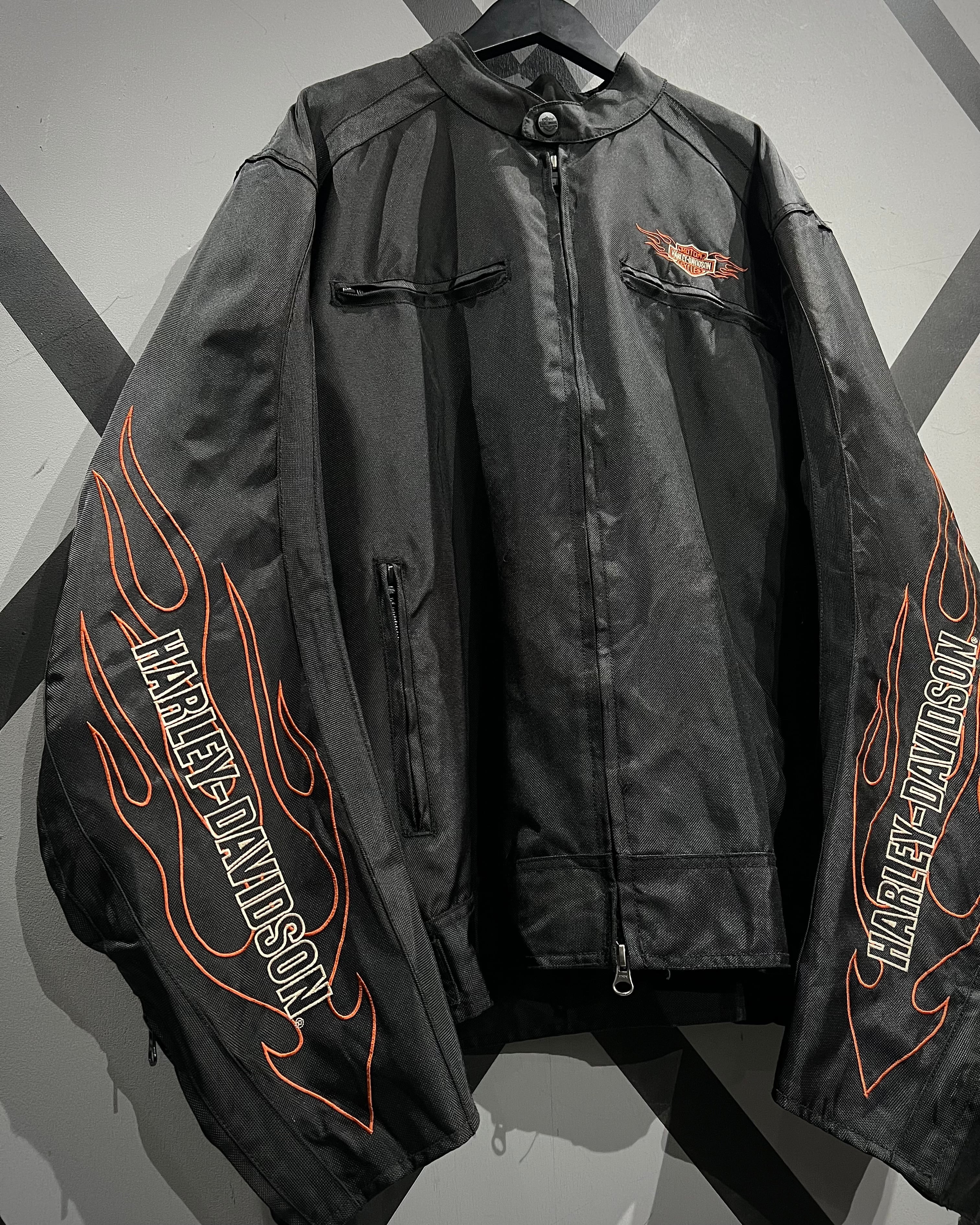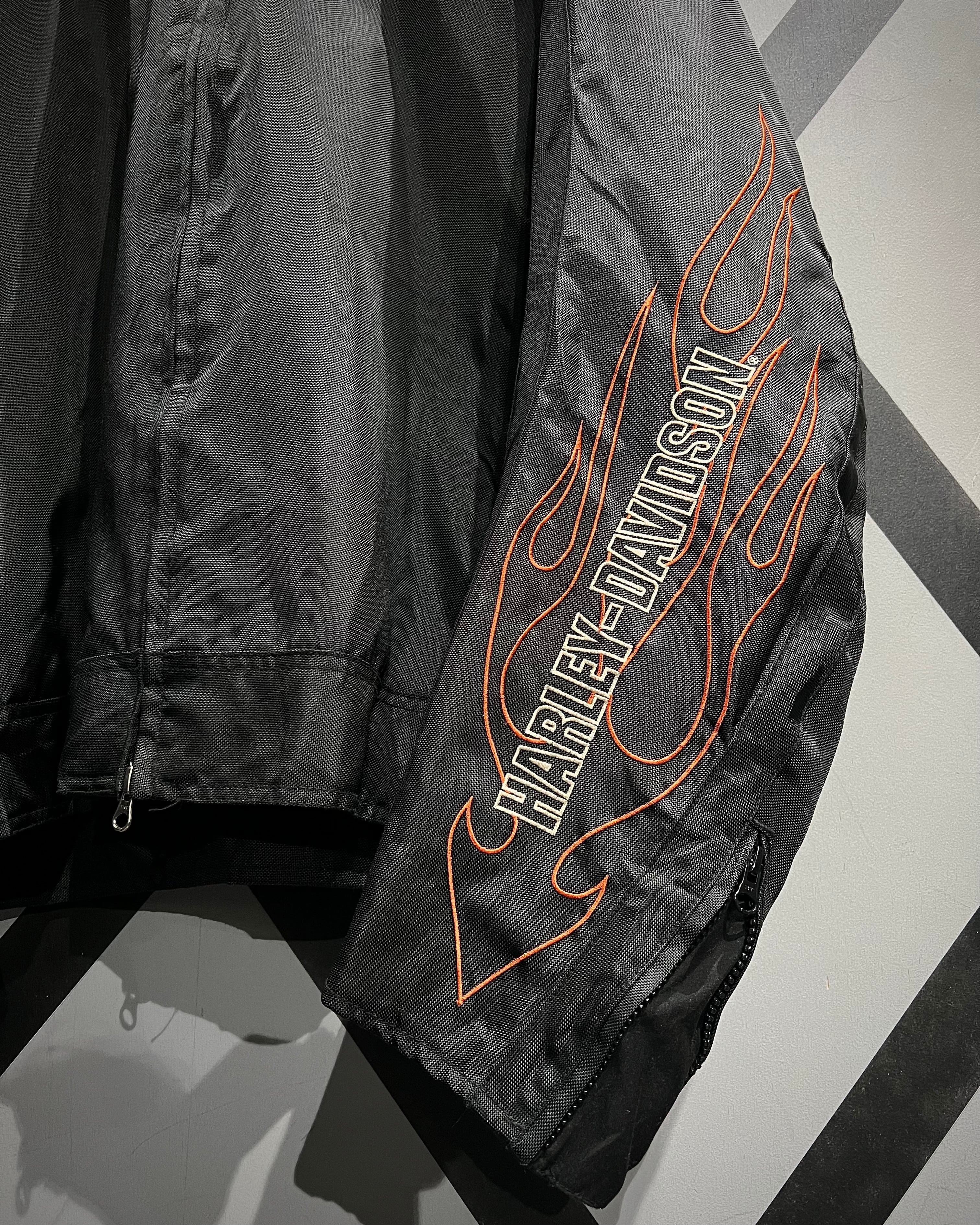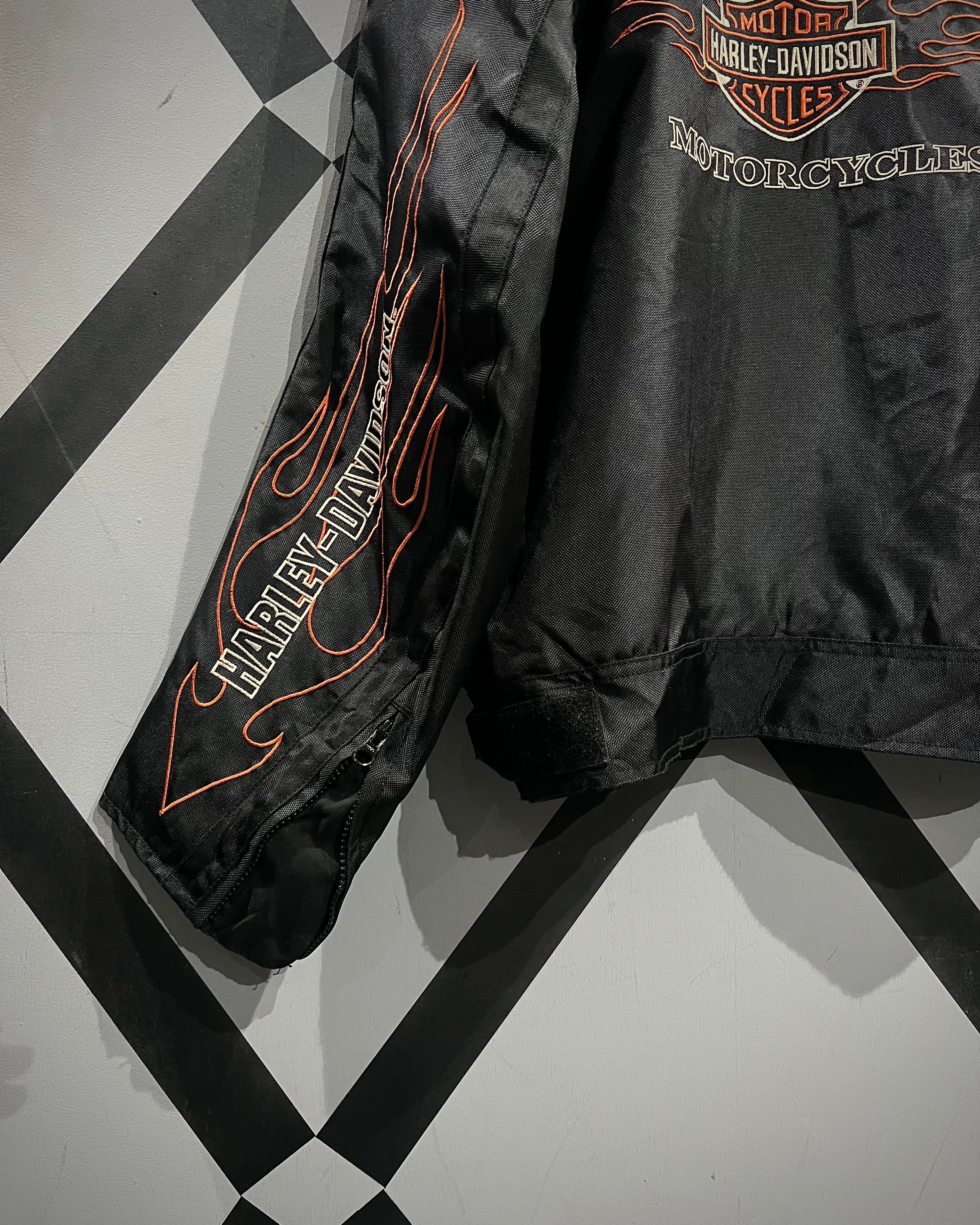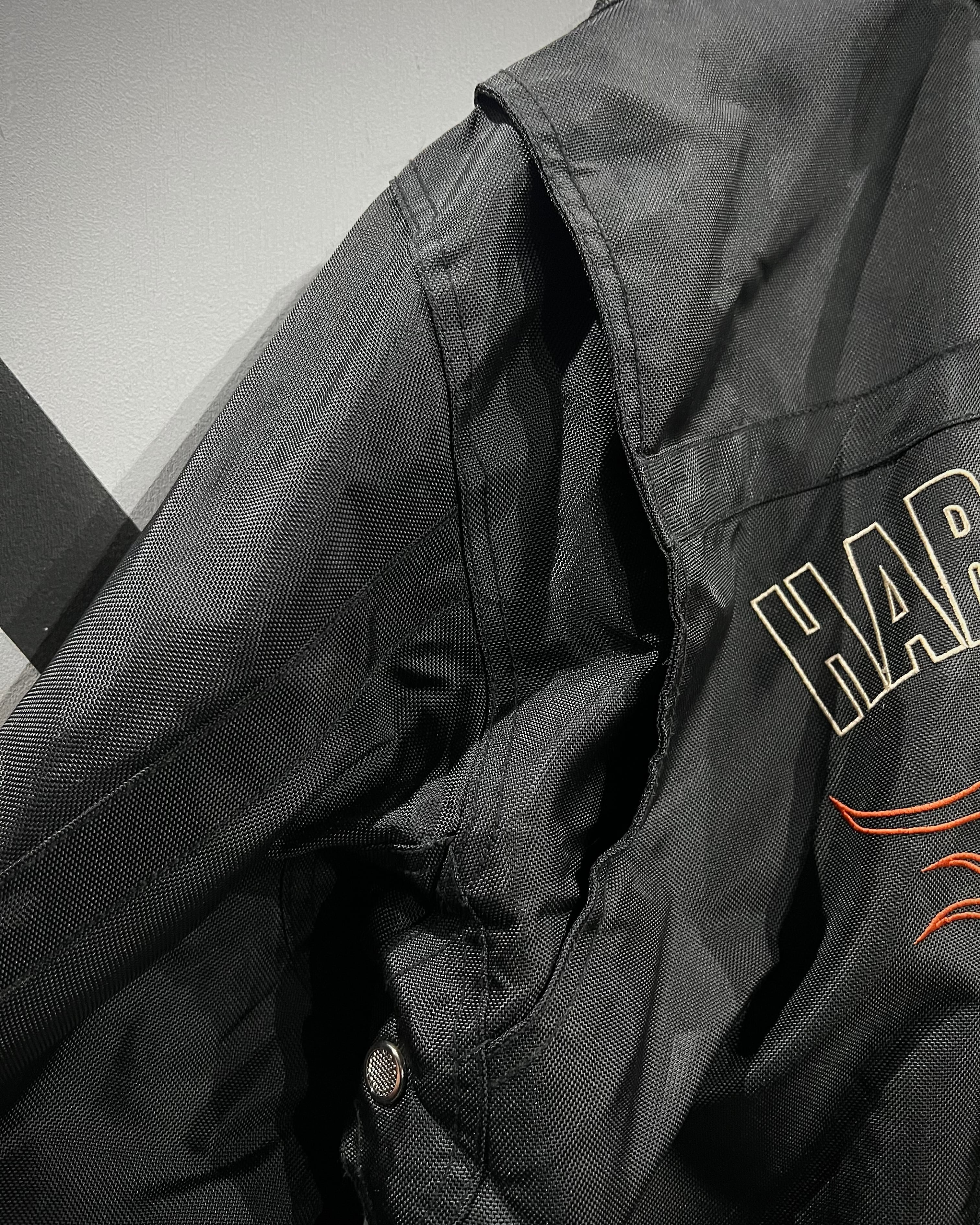 フロント胸元のロゴ刺繍に加え、両袖にはフレイムと“HARLEY-DAVIDSON”のロゴを大胆に配置。背面にもブランドを象徴するシールドロゴ刺繍が入り、前後左右どこから見ても抜かりのない仕上がりです。