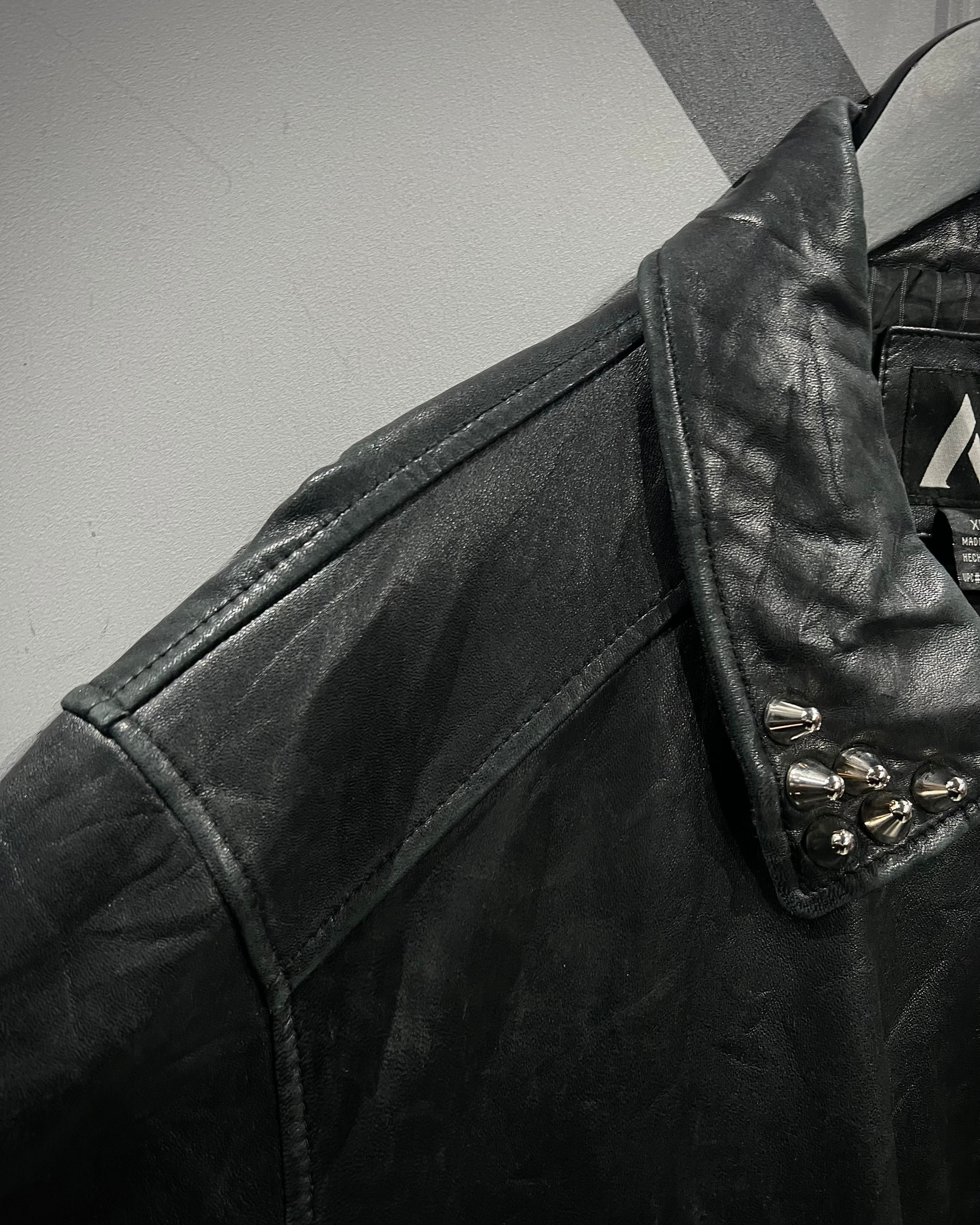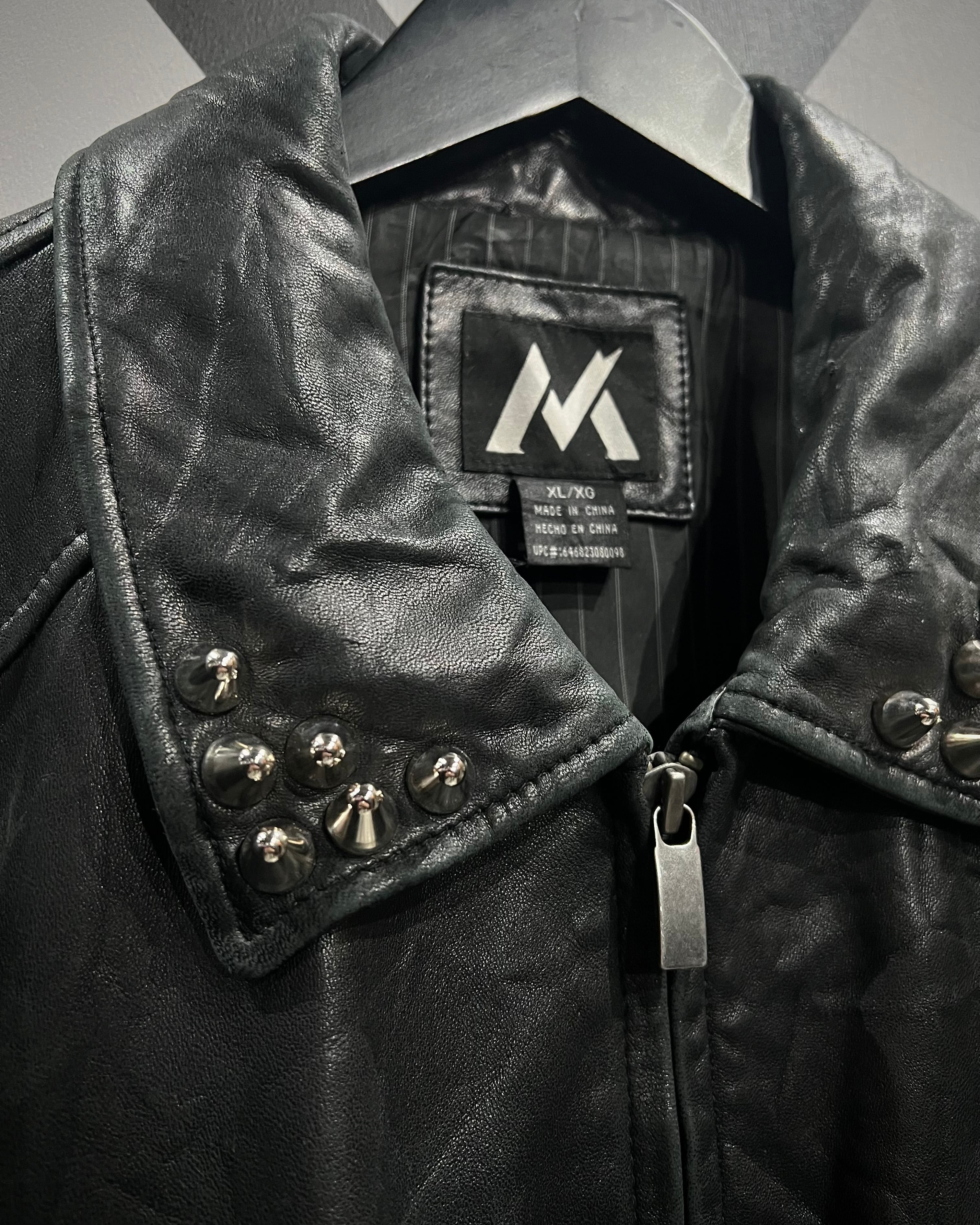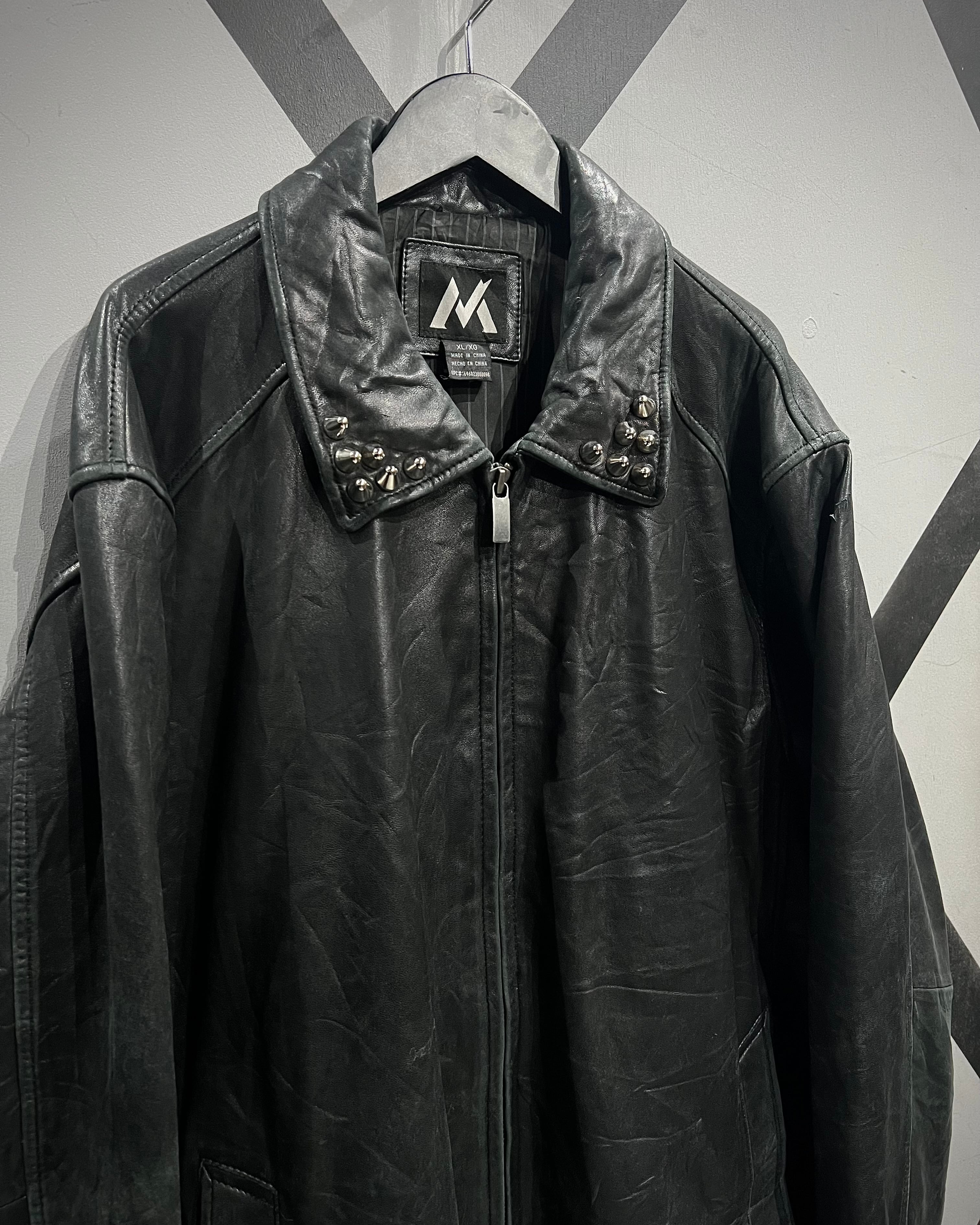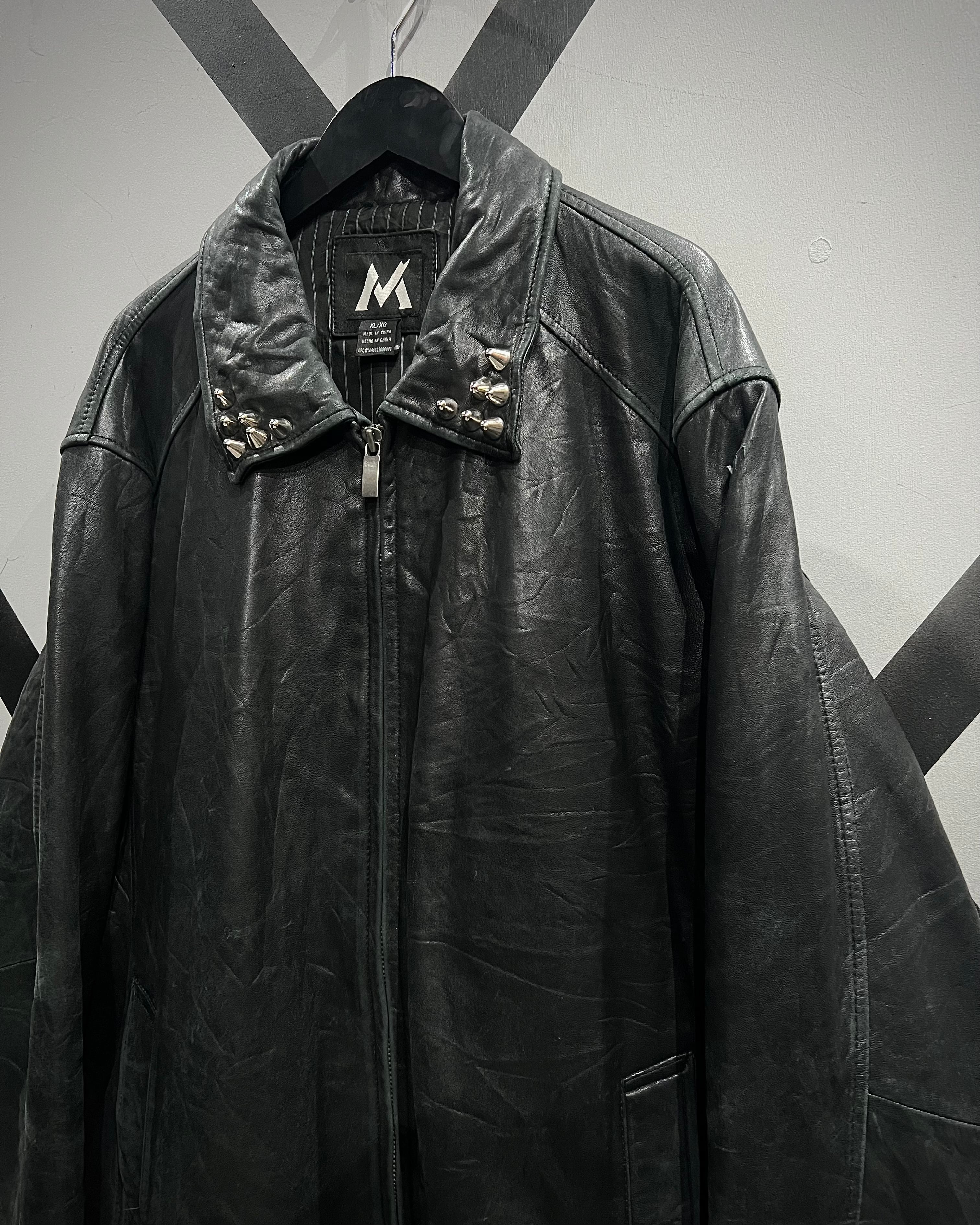襟元にあしらわれたスタッズがハードな要素でありながら、パンク一辺倒にならず洗練されたアクセントとして機能しています。フロントはジップ仕様で、無駄を削ぎ落としたミニマルな作りも◎