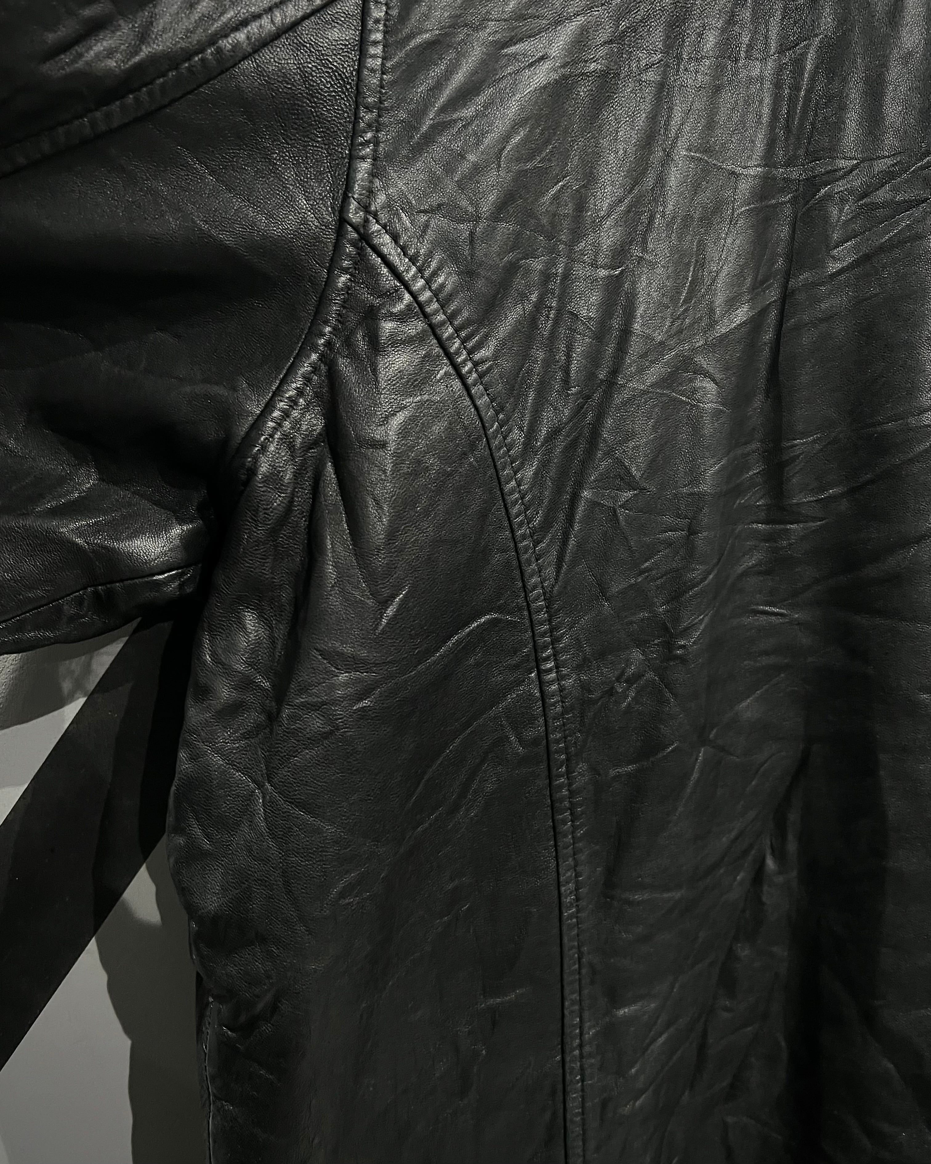 ボディにはしっとりとした質感のブラックラムレザーを採用。程よい光沢とシワ感が相まって、着用を重ねることでさらに表情が深まっていくのをお楽しみいただけるかと。