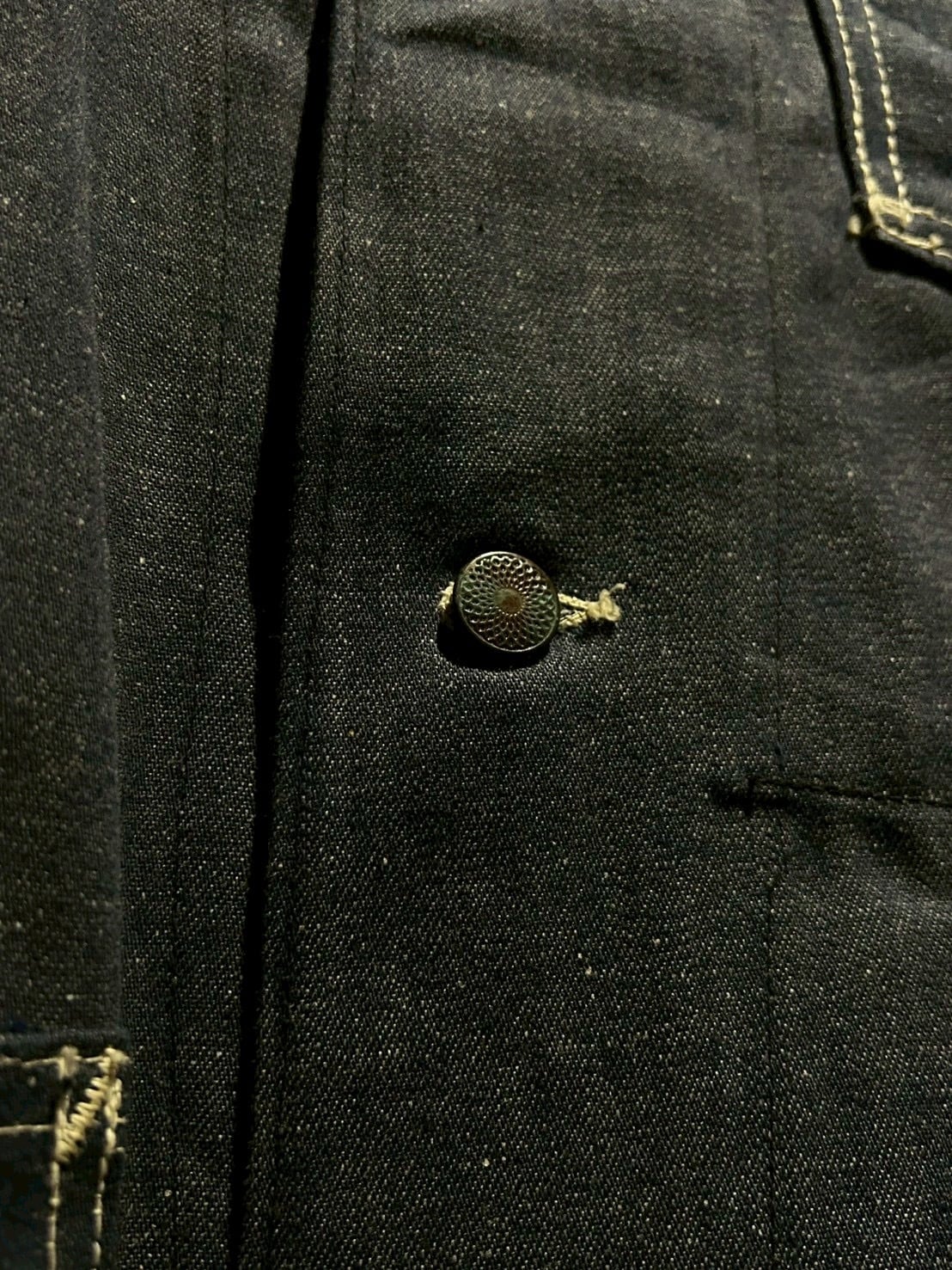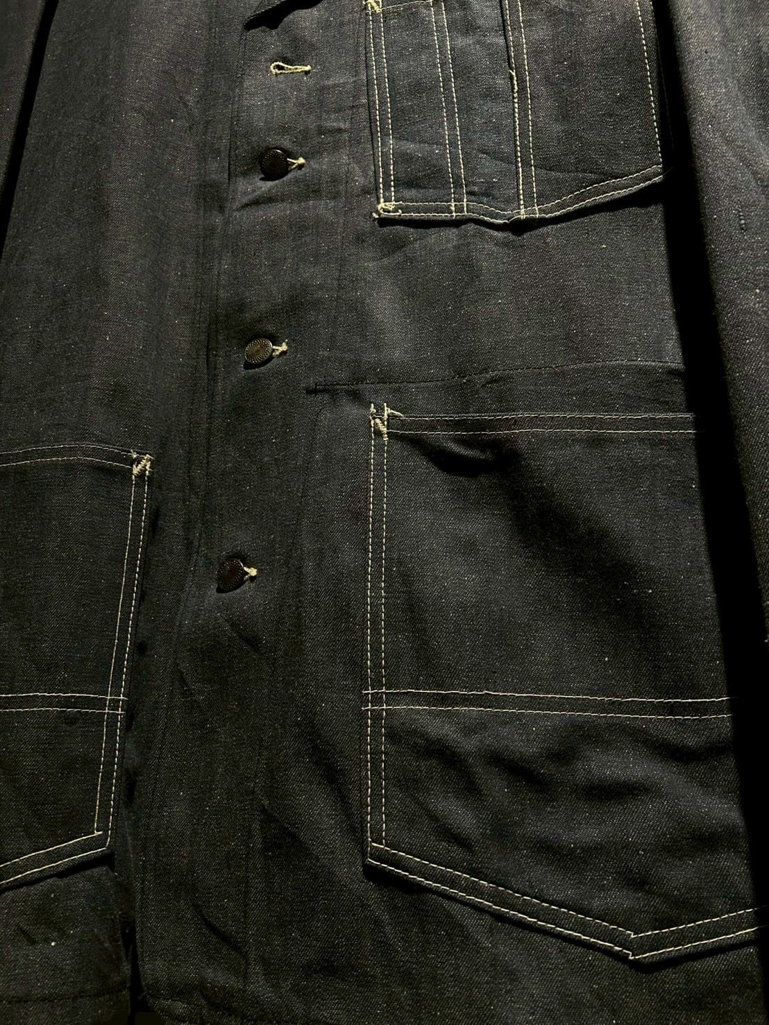 フロントの大ぶりなポケット配置や、無駄のないシンプルなボタンなど、ワークウェアらしい機能美が際立つディテール。縫製も非常に丁寧で、ステッチの運びやパターンから当時のクオリティの高さが伺えますね。