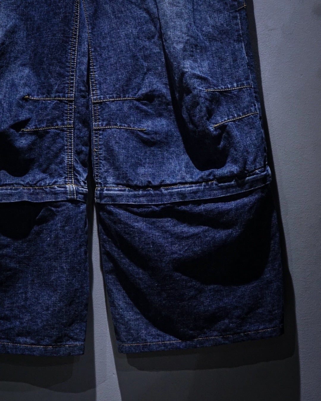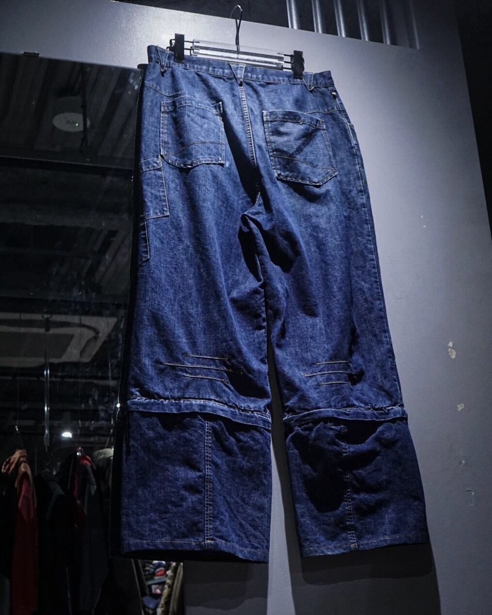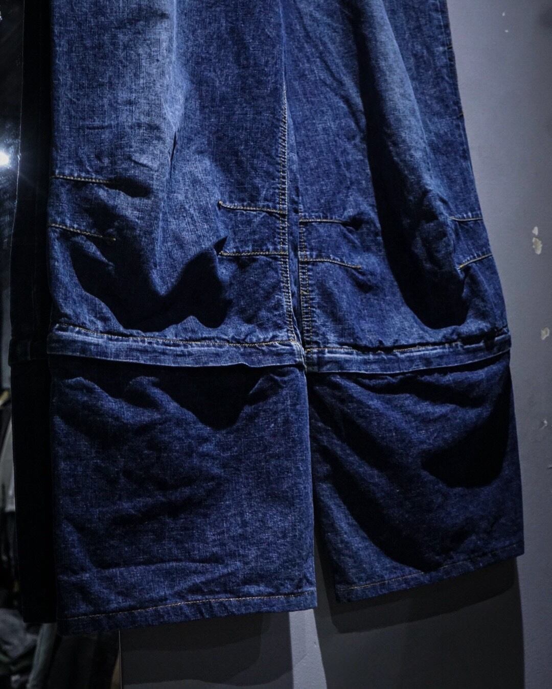 しっかりとしたインディゴデニムをベースに、フロントやサイドへ入る複数のダーツが立体的なシルエットを形成。穿いた際に自然と生まれるボリューム感が特徴で、レイヴカルチャーを想起させるワイドながらも動きのあるフォルムに仕上がっています。