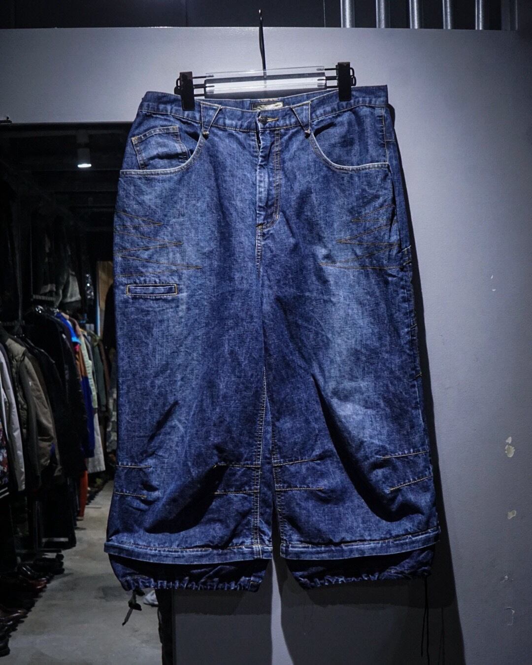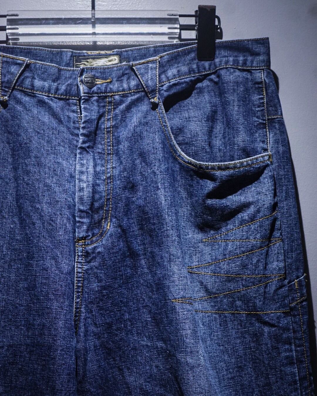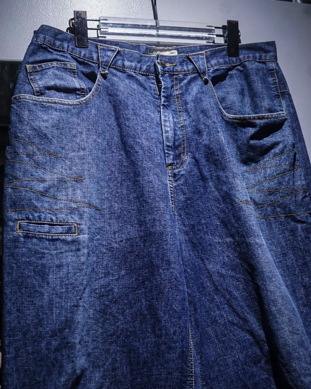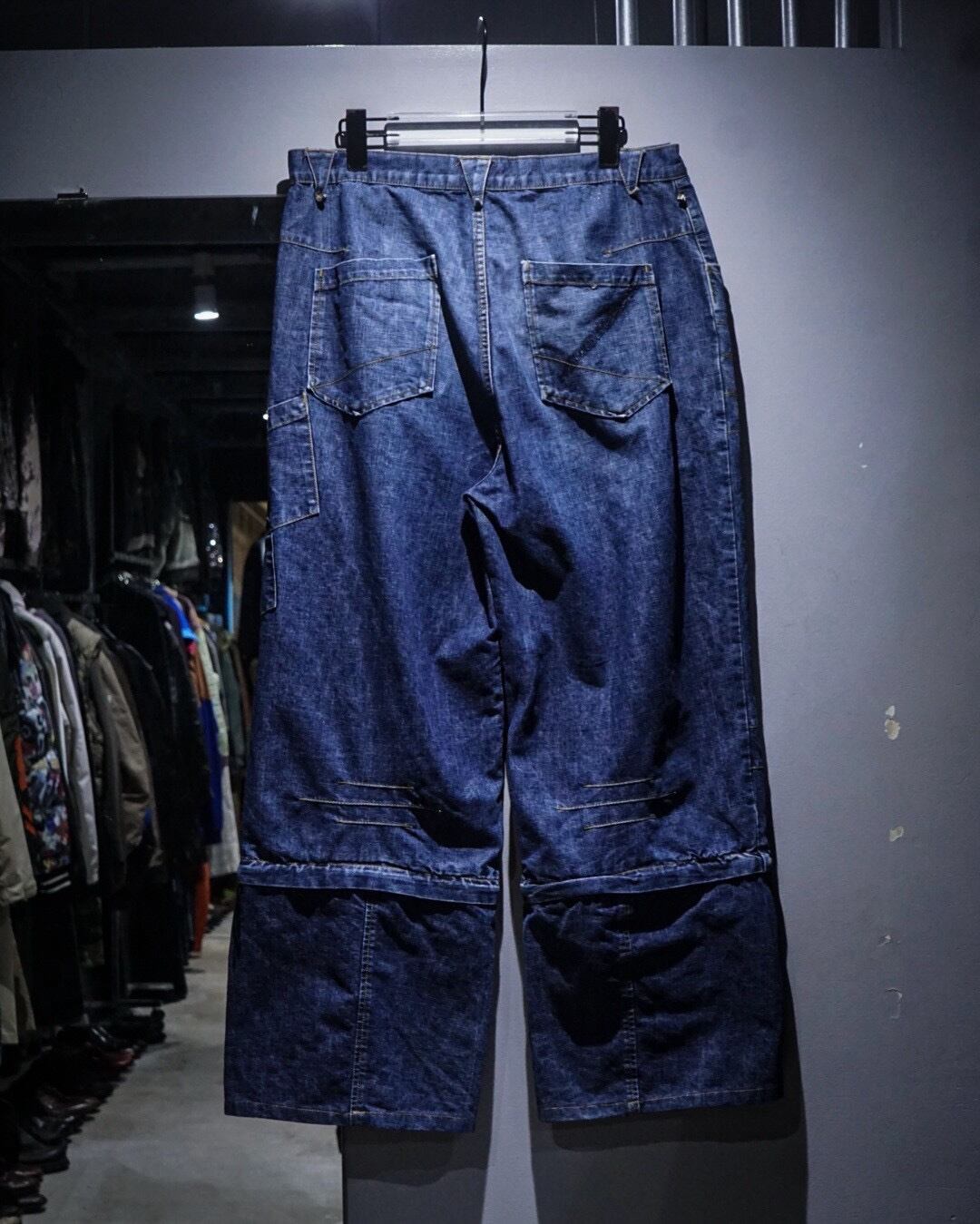 しっかりとしたインディゴデニムをベースに、フロントやサイドへ入る複数のダーツが立体的なシルエットを形成。穿いた際に自然と生まれるボリューム感が特徴で、レイヴカルチャーを想起させるワイドながらも動きのあるフォルムに仕上がっています。