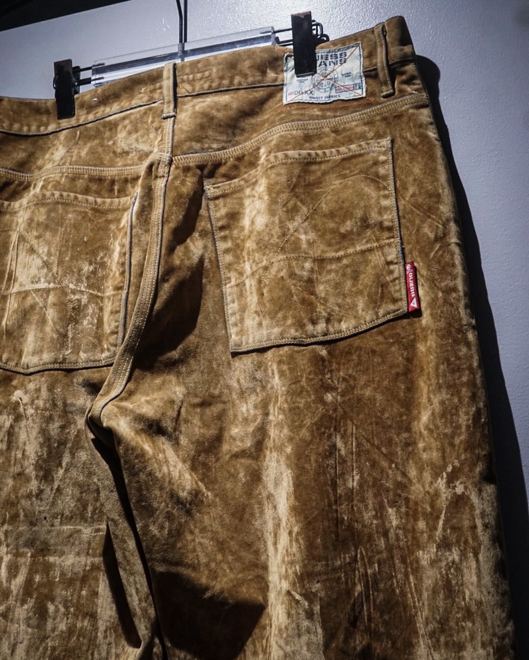 5ポケットのオーセンティックなデザインをベースにしつつ、コーティングによる質感変化で一気にモードな印象へ昇華。背面のタグやパッチなど、GUESSらしいディテールもしっかりと健在です。