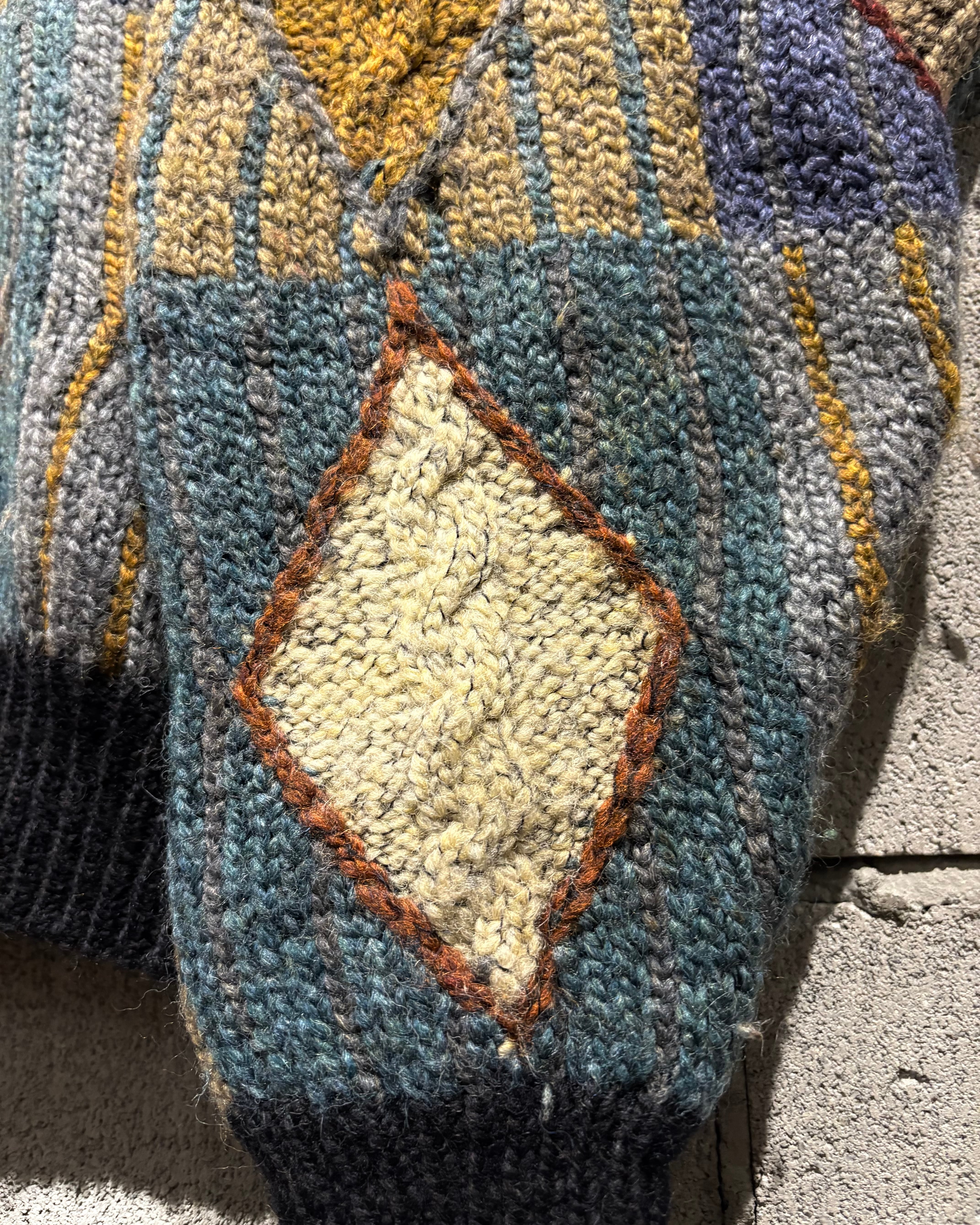ボディ全体にはダイヤ柄にストライプをパッチワーク風に切り替え。ブルー、ボルドー、マスタード、ベージュといった多色使いながら、トーンを揃えることでまとまりのある仕上がりに。