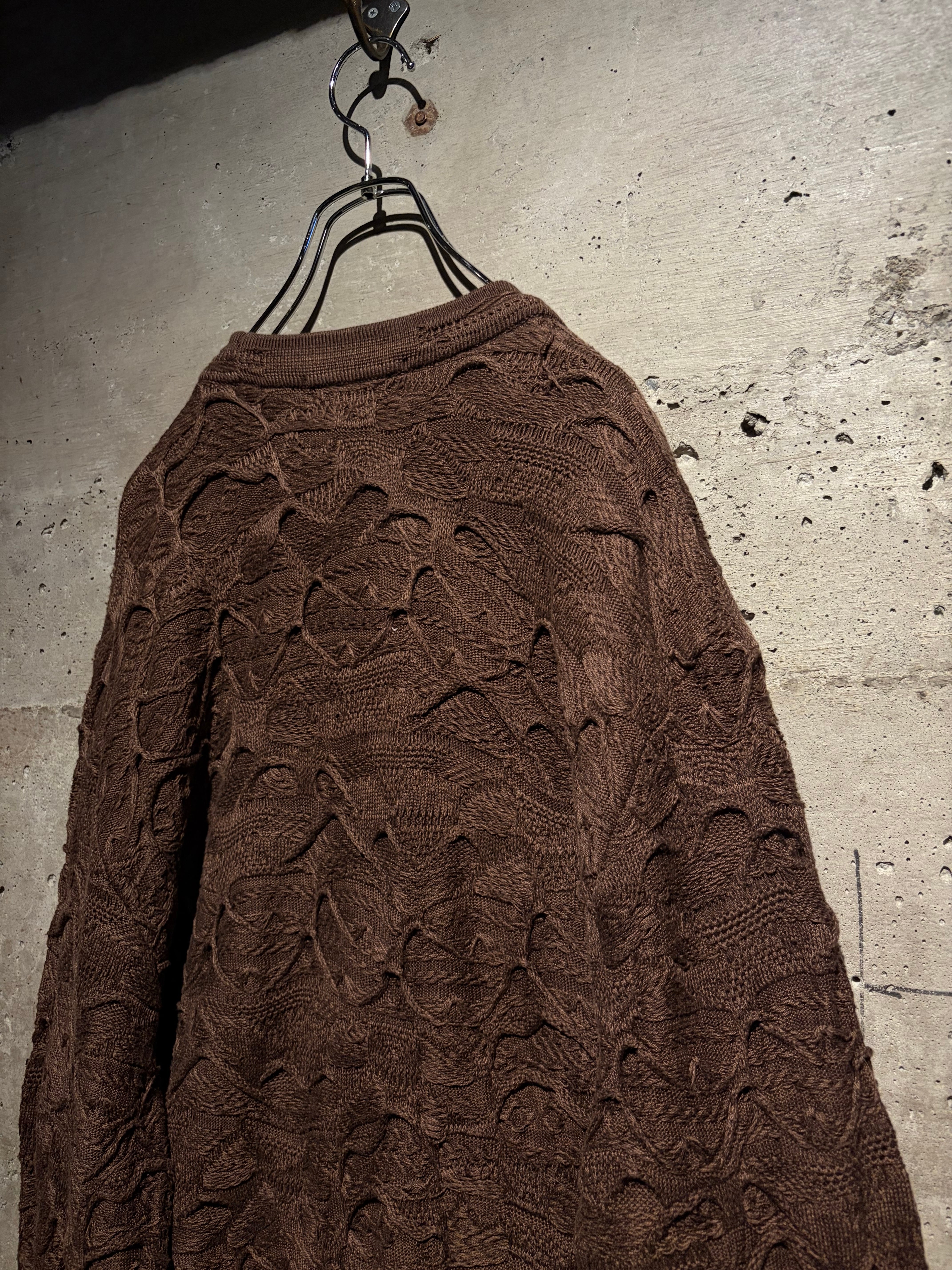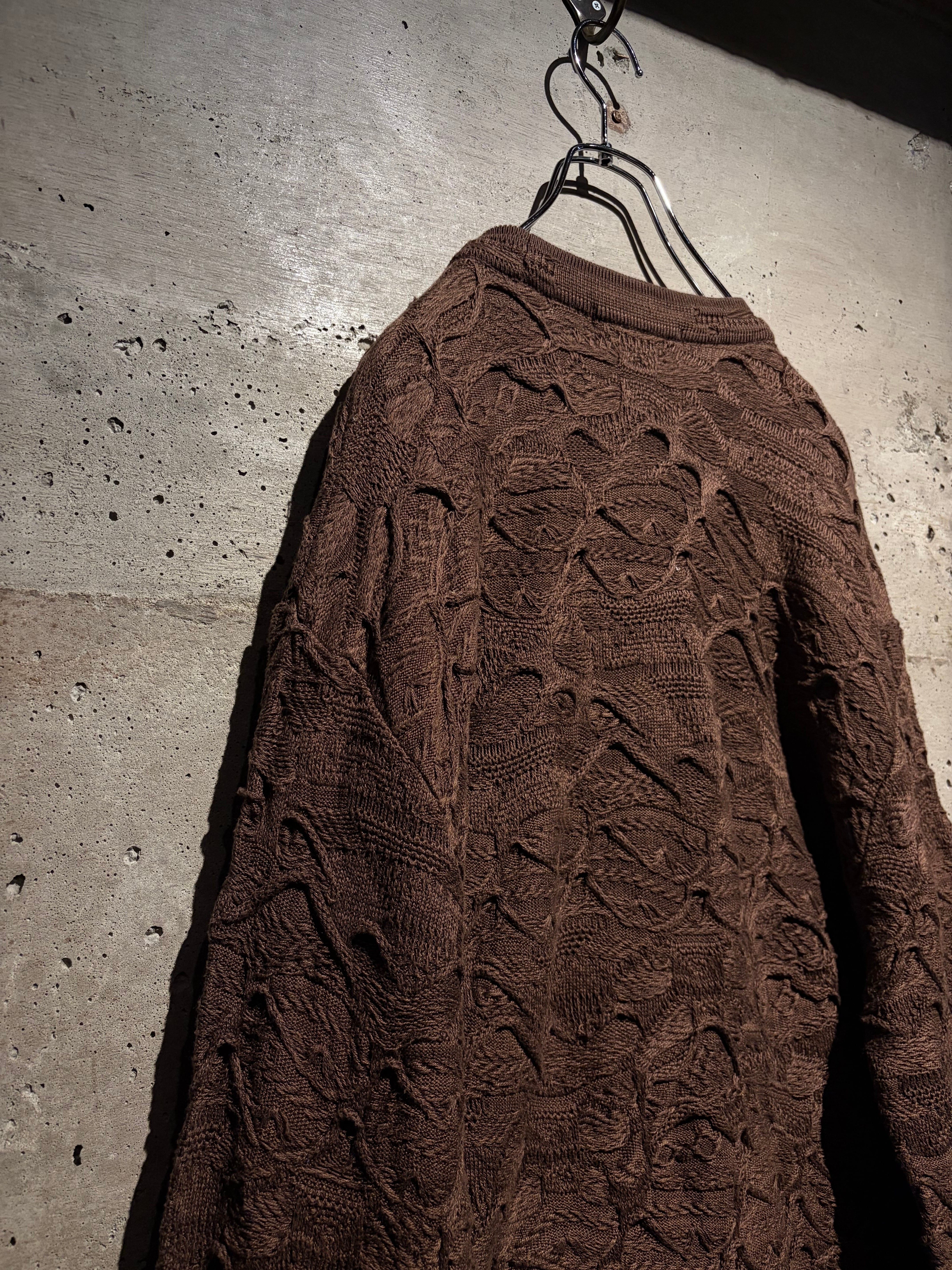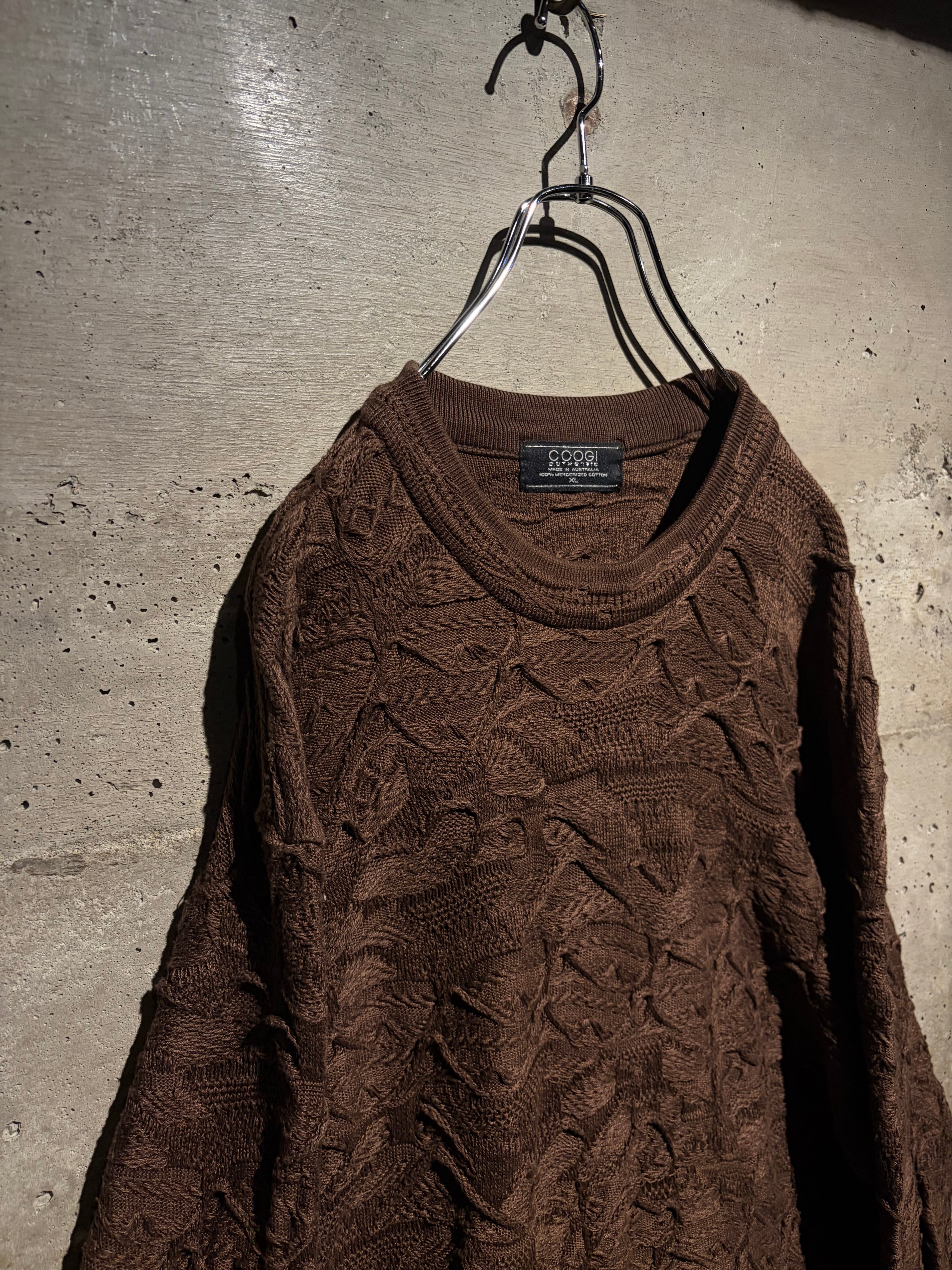 ボディ全体に広がるのは、COOGIならではの凹凸感あふれる立体的なニッティング。波打つような編地は、単色でありながら奥行きと陰影を生み、ブラウンの落ち着いたトーンが、立体感を際立たせています。