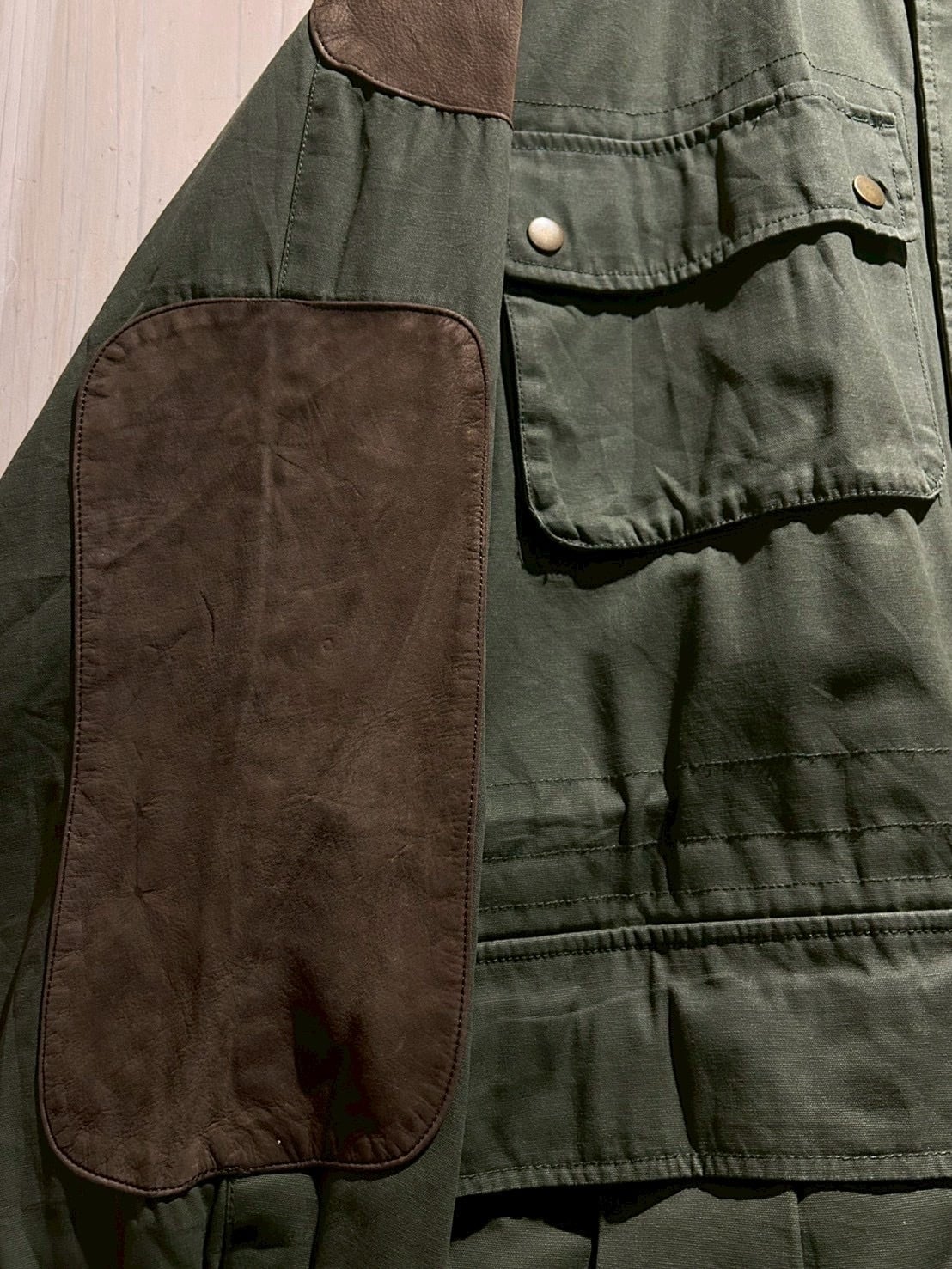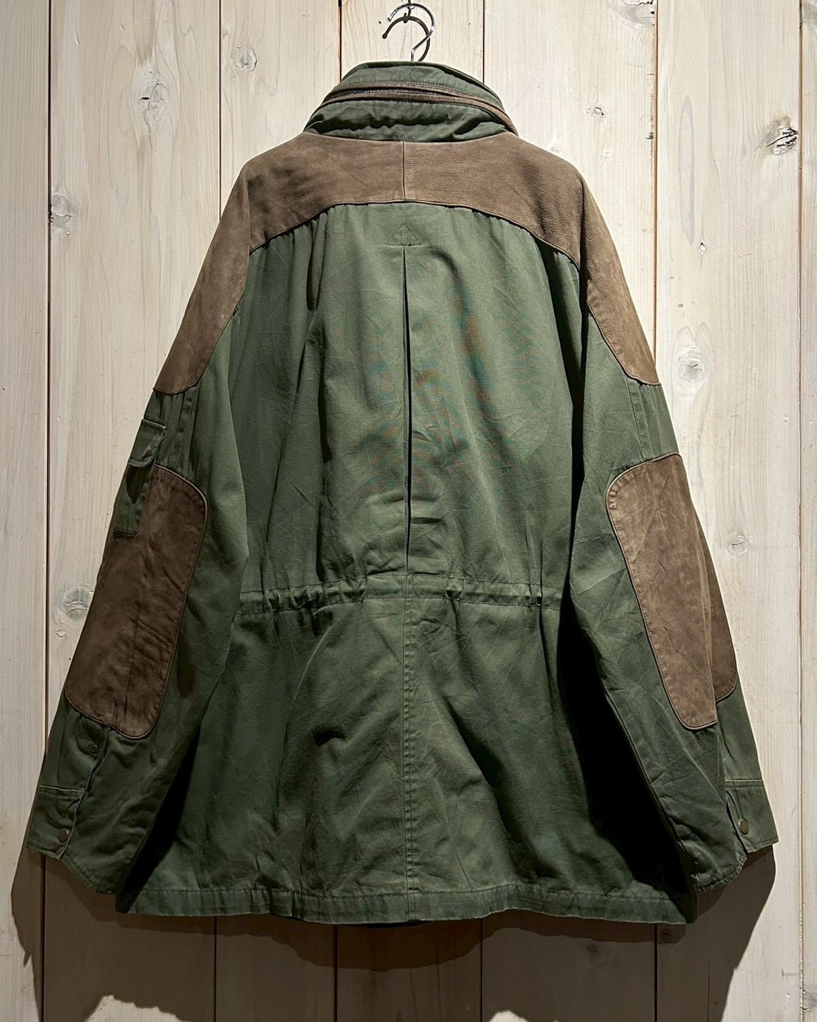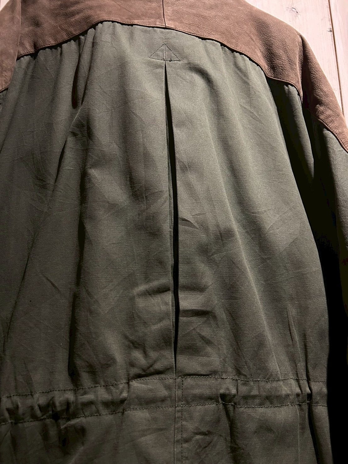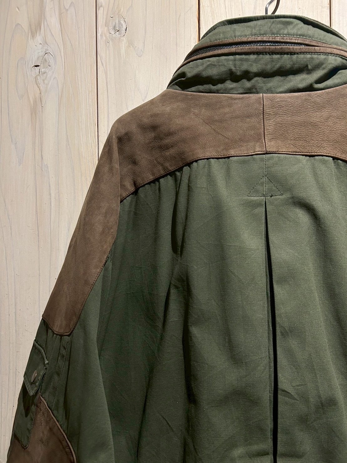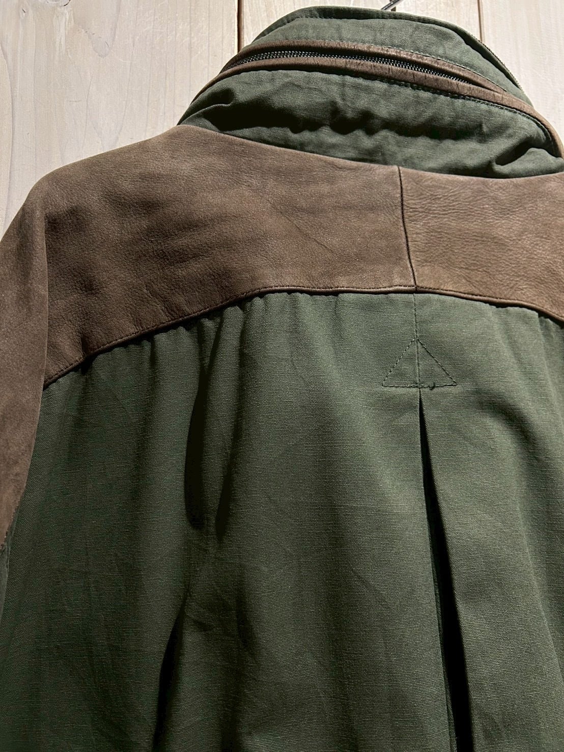 ボディにはタフなコットンキャンバスをベースに、要所へスエードレザーを切り替えで配置。無骨なグリーンボディに対し、ブラウンスエードが加わることで、無骨さの中にどこか上品で落ち着いた表情を演出しています。