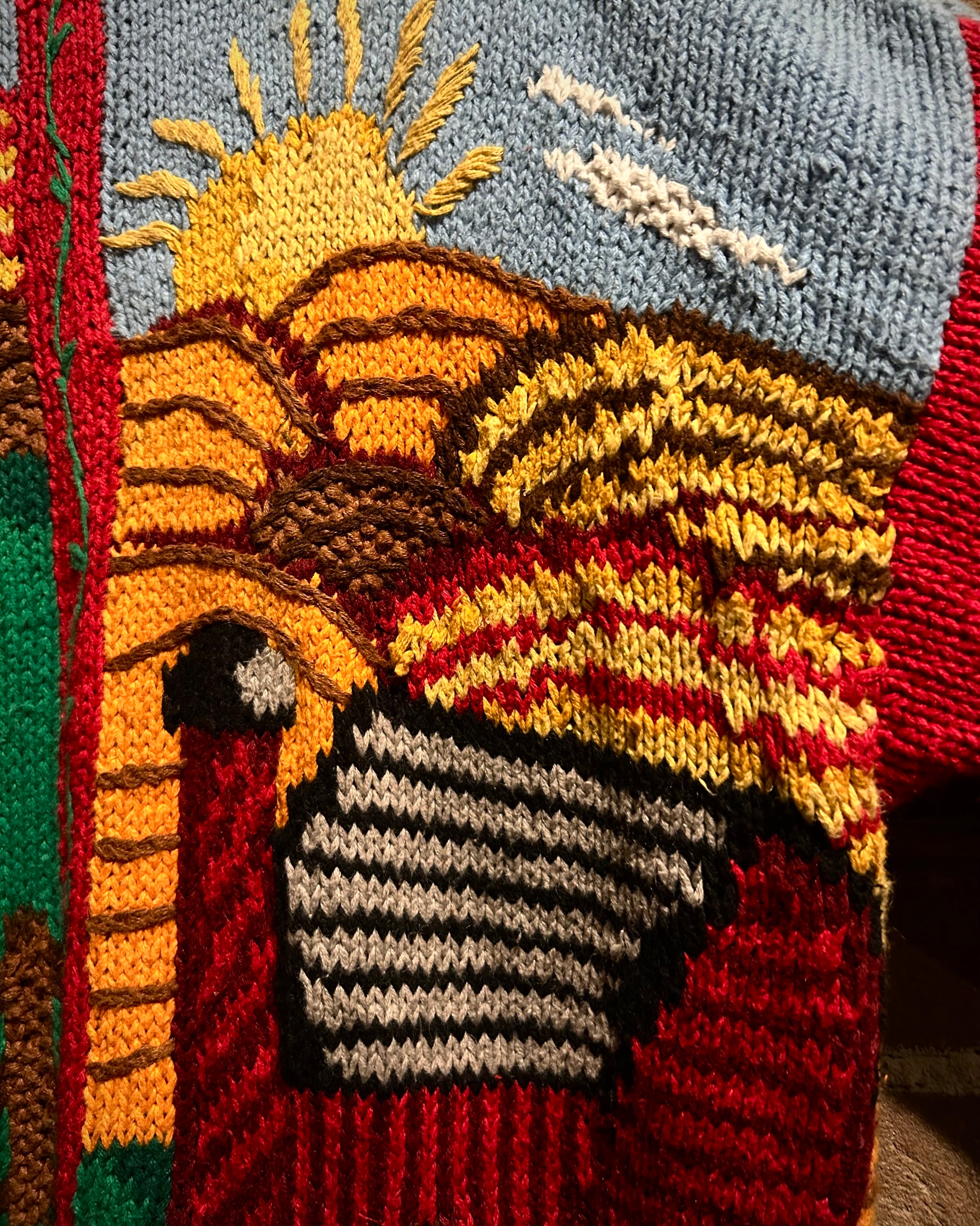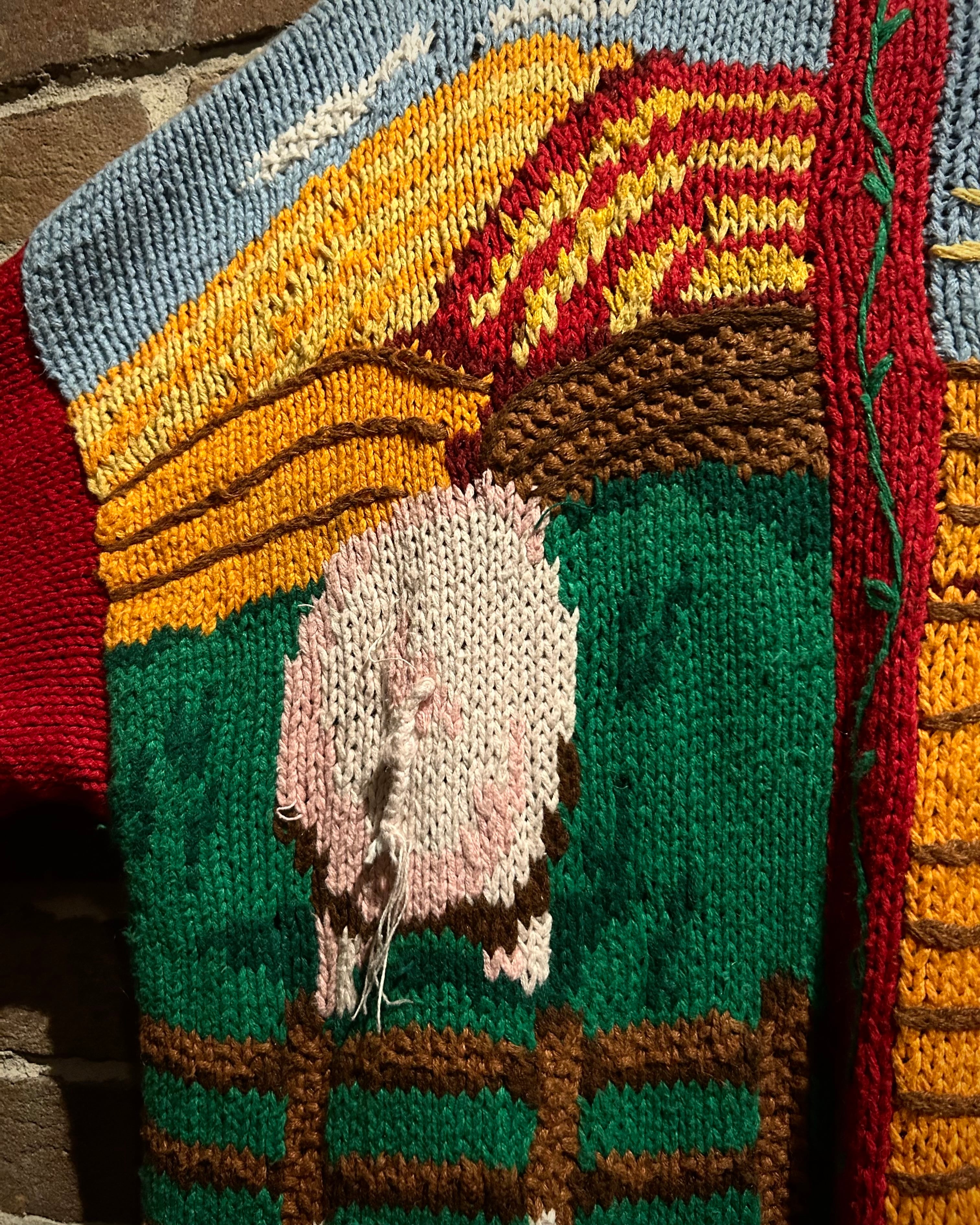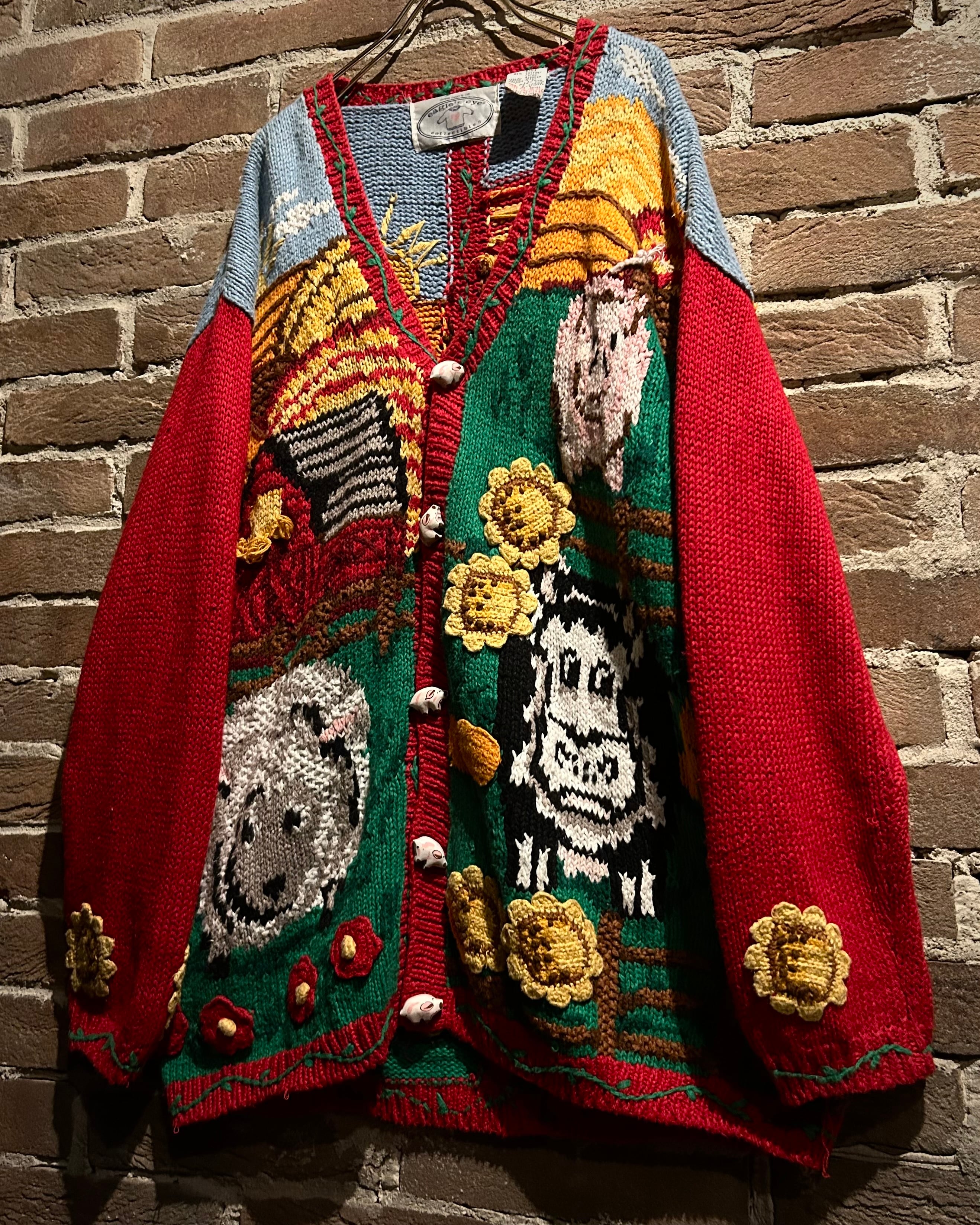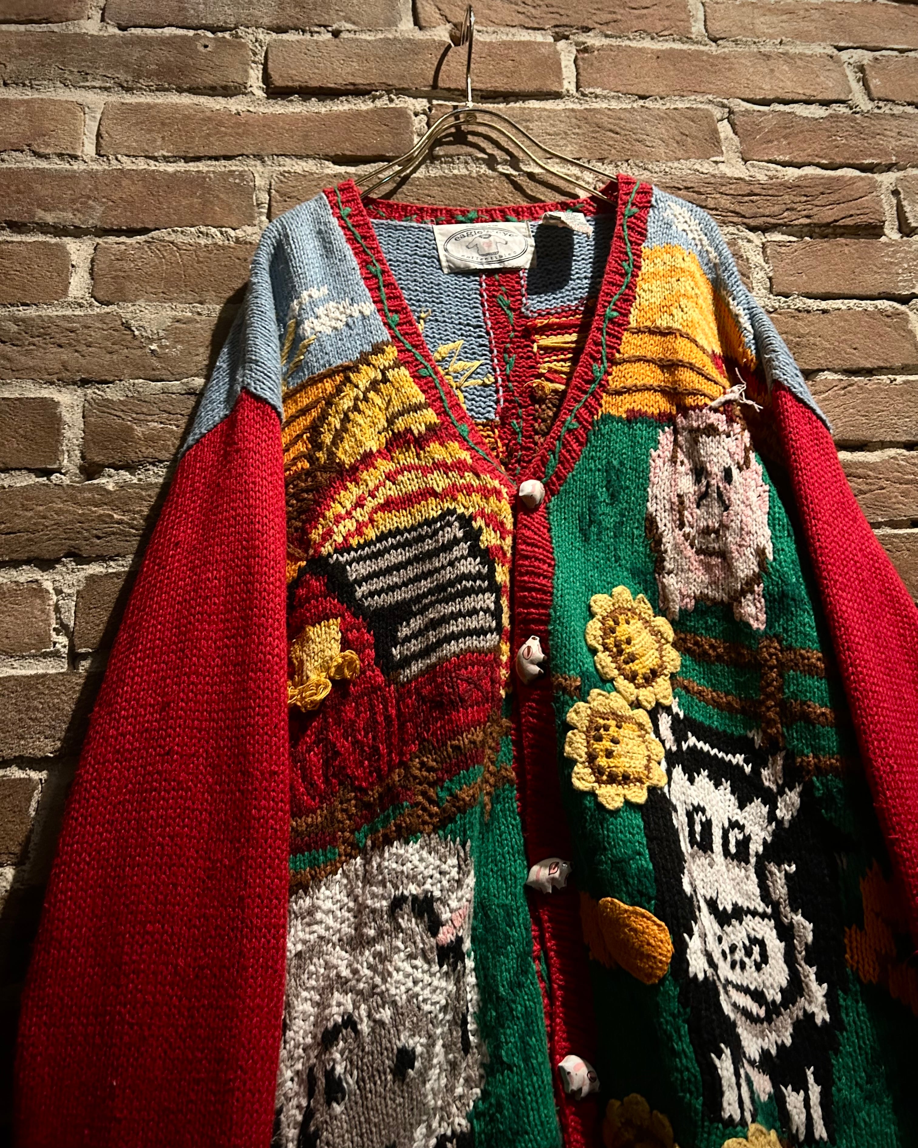 羊や牛が青空の下で過ごす牧場の風景を、上質なニッティングで表現したヴィンテージニットカーディガン。