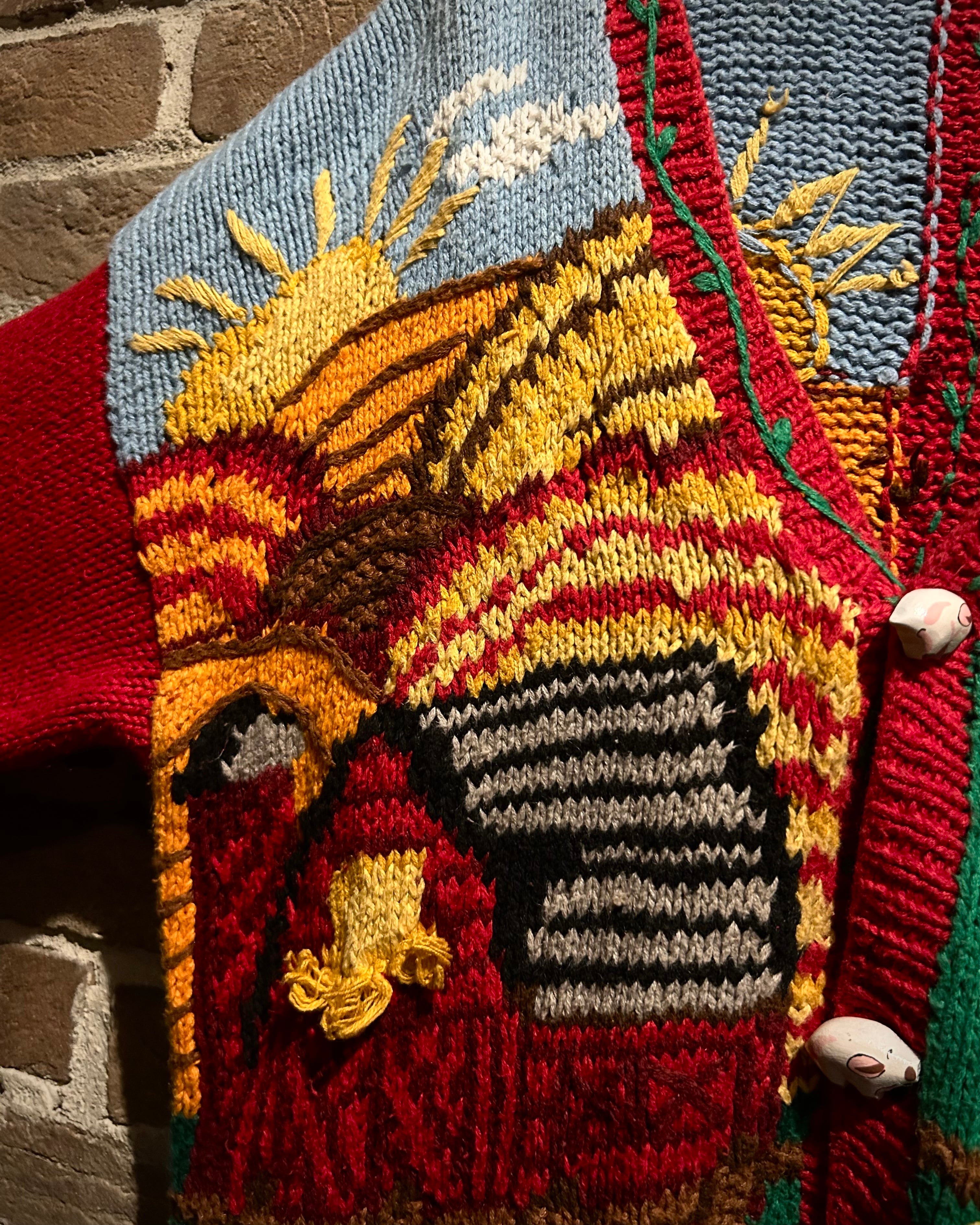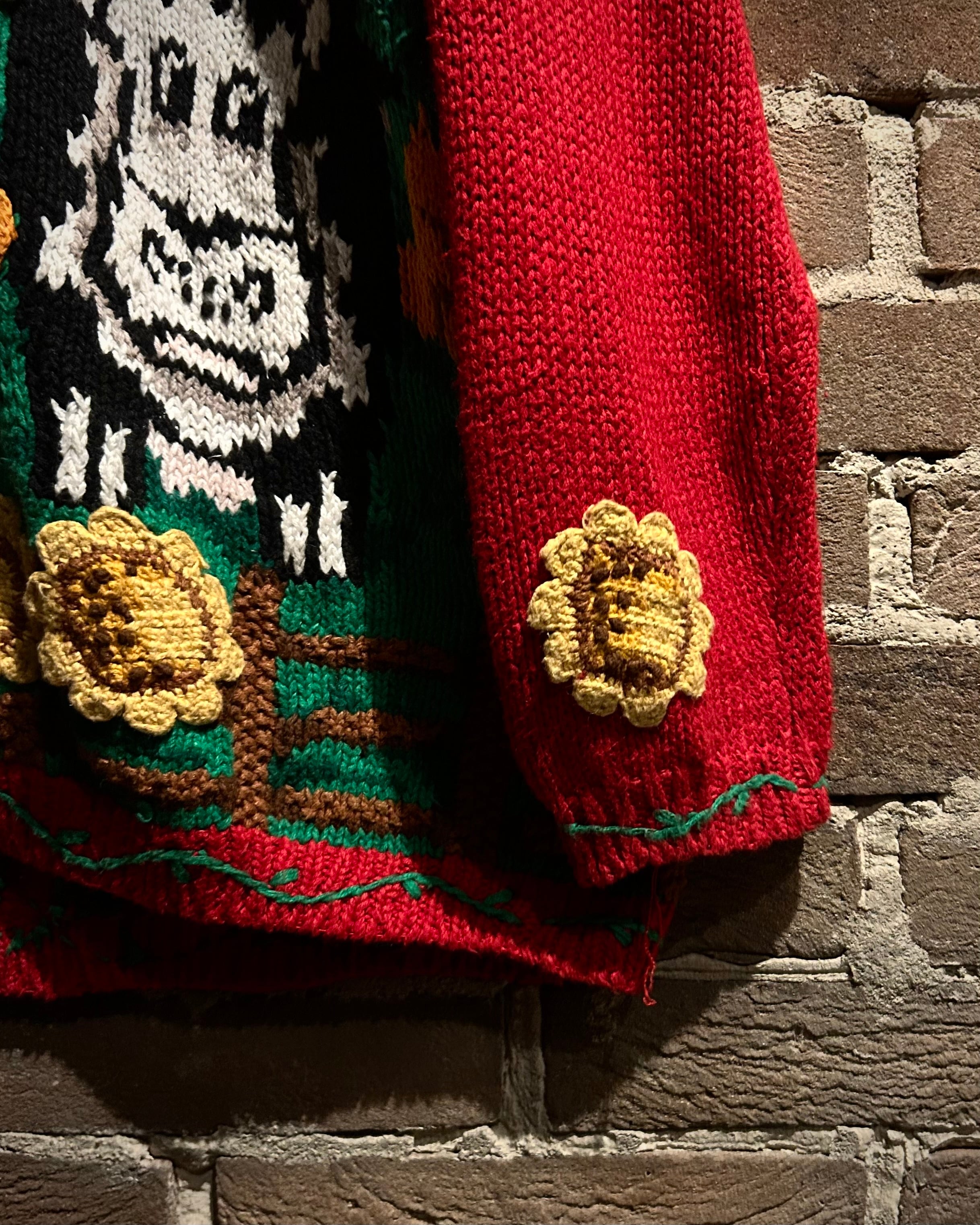 ひまわりモチーフのニットパッチやフロントボタンなど、細部まで作り込まれたデザイン性の高さが際立ち、ヴィンテージならではの温もりを感じさせます。