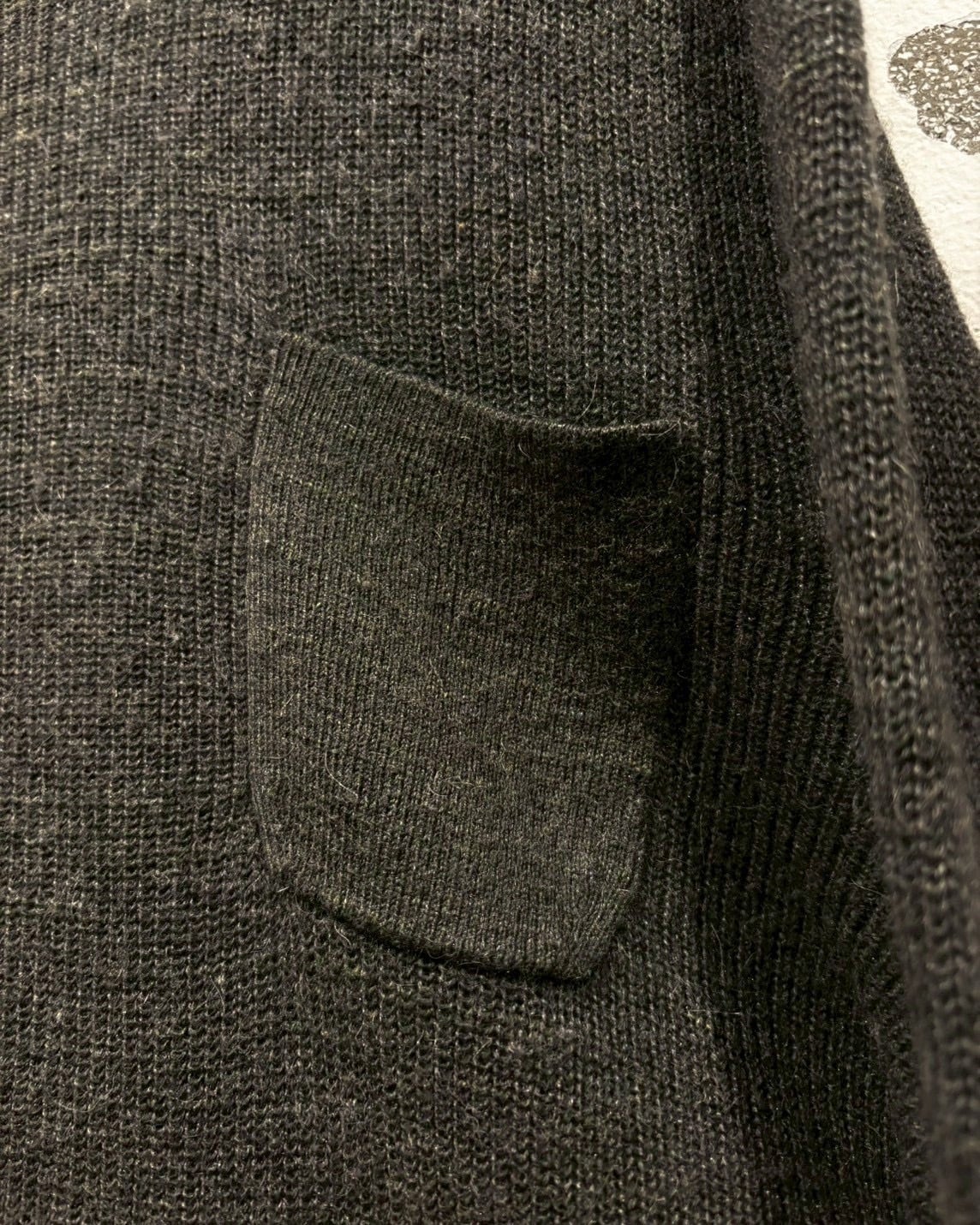 ベースは落ち着いたチャコールトーン。表面は細かな編み地で、カジュアルで柔らかな表情に仕上げられています。左胸のポケットのアクセントも◎