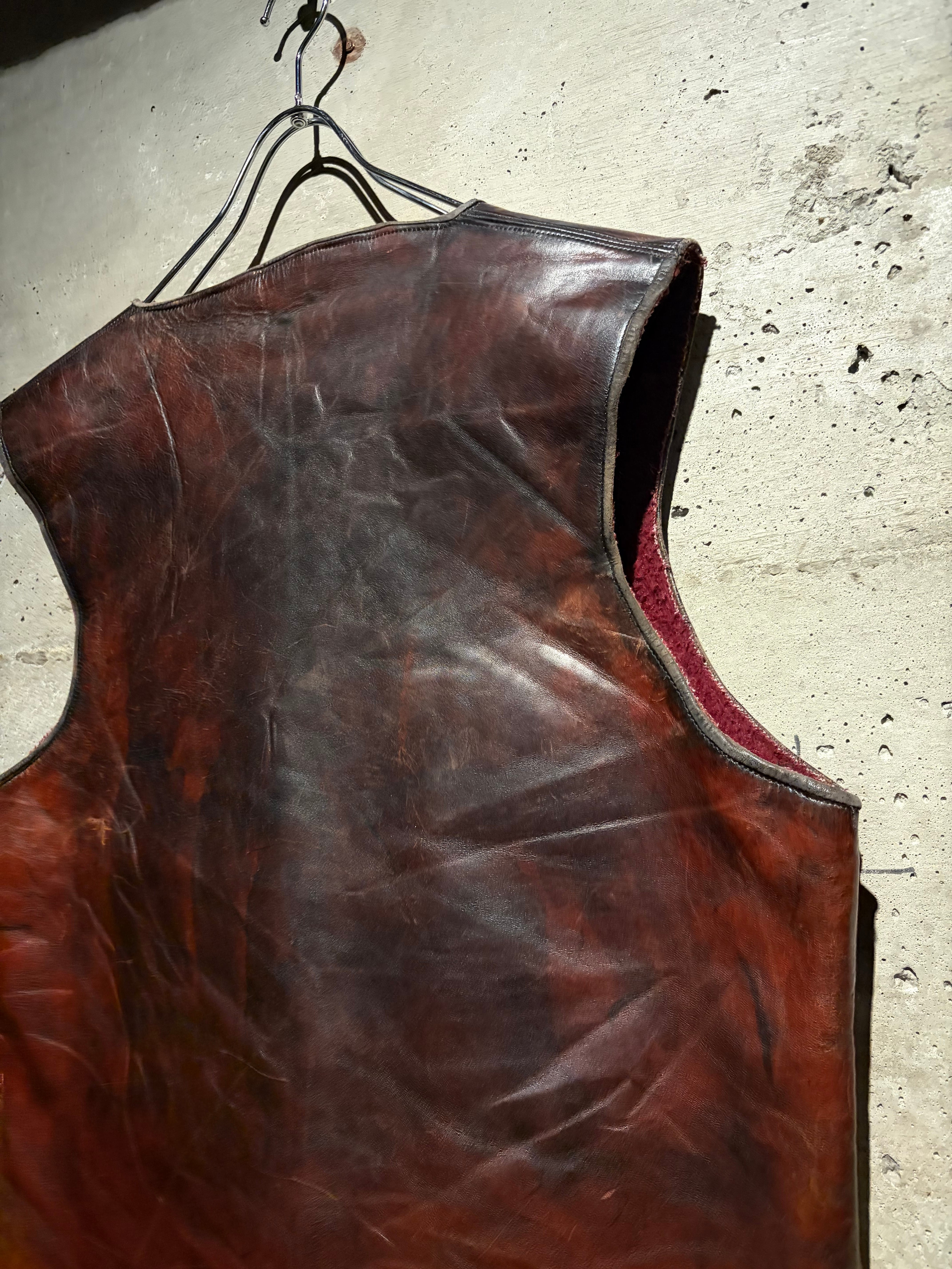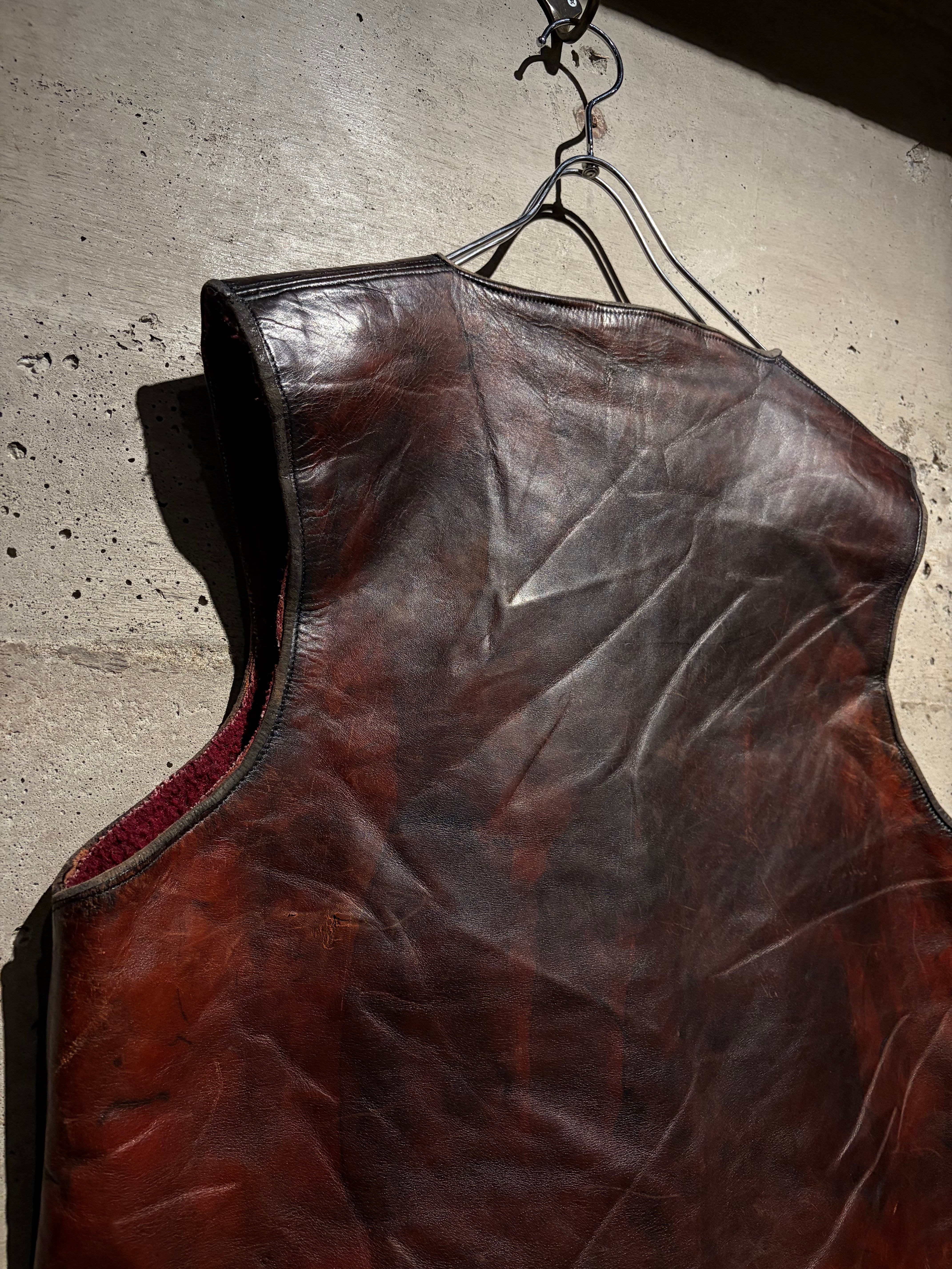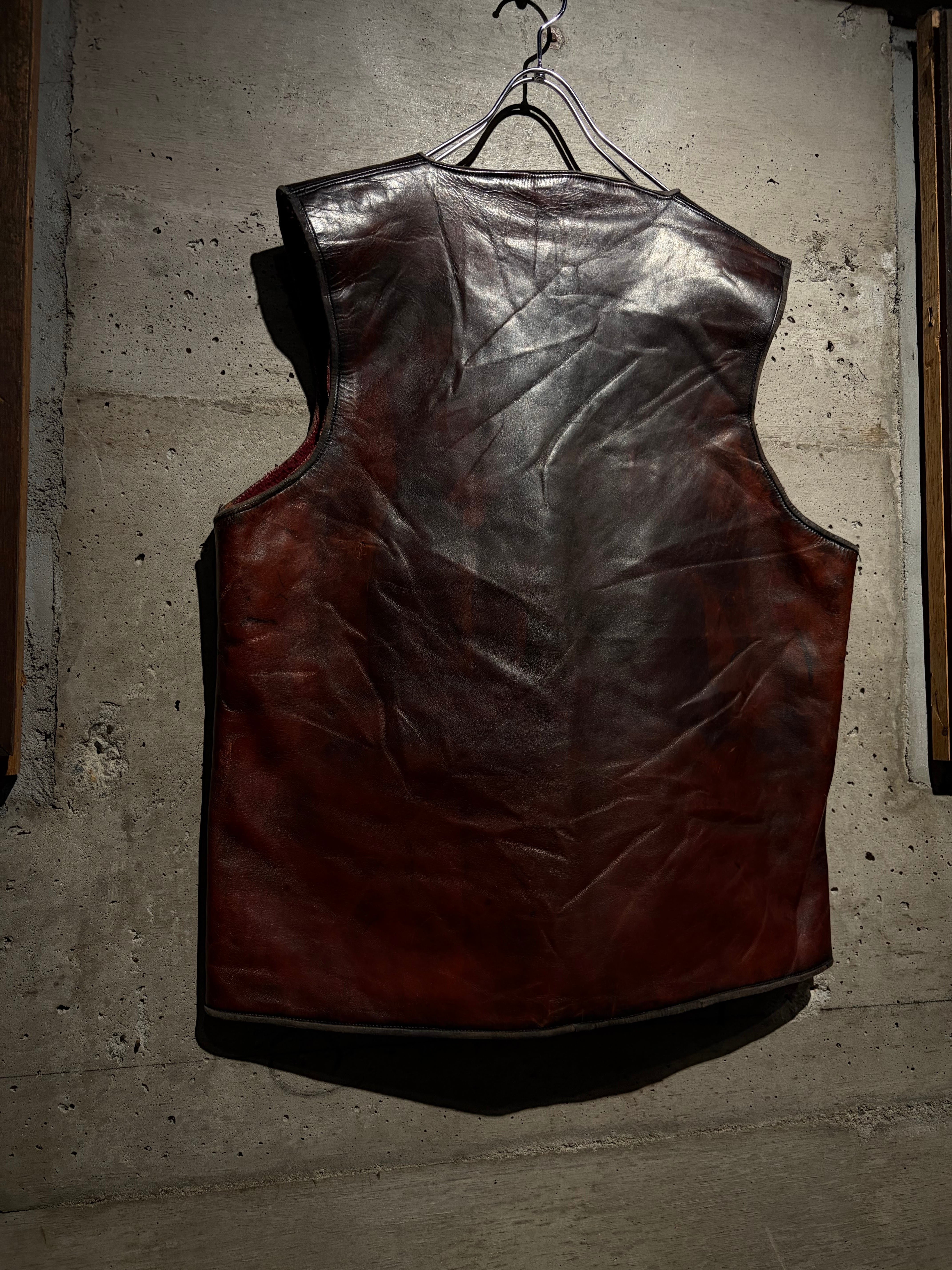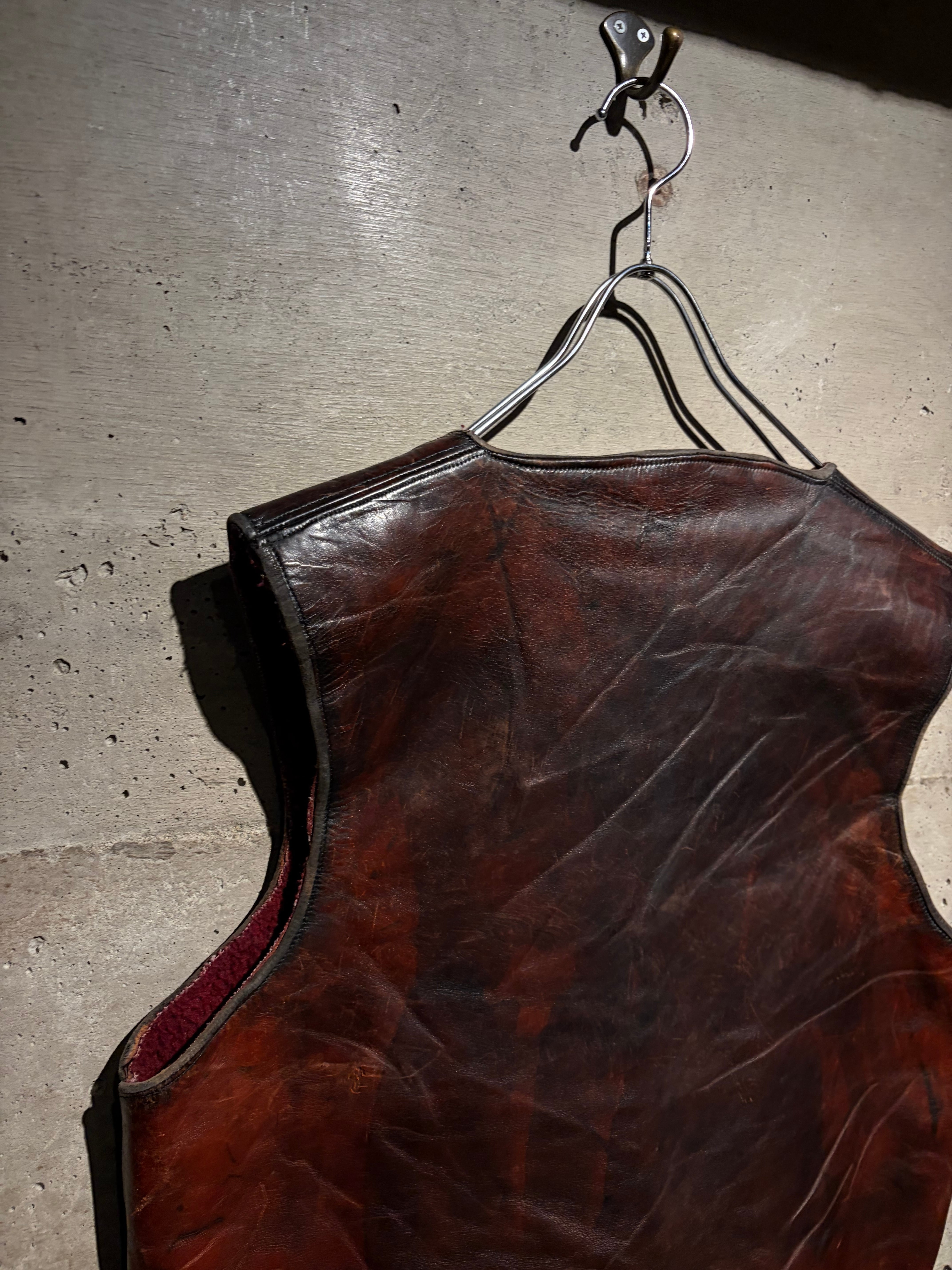 ハリのある艶やかな光沢を帯びた、褐色のレザーを用いた60年代〜70年代のレザーベスト。