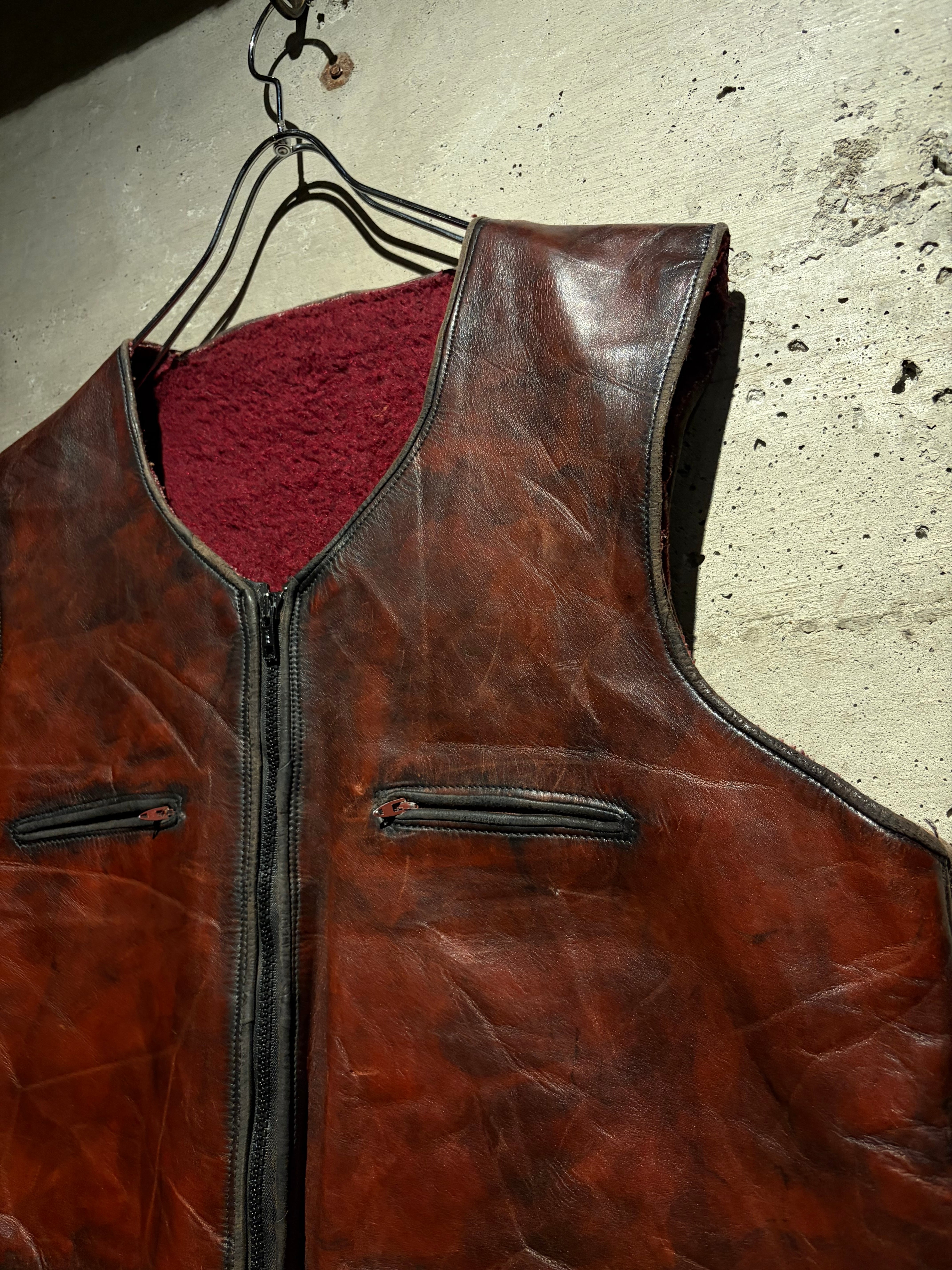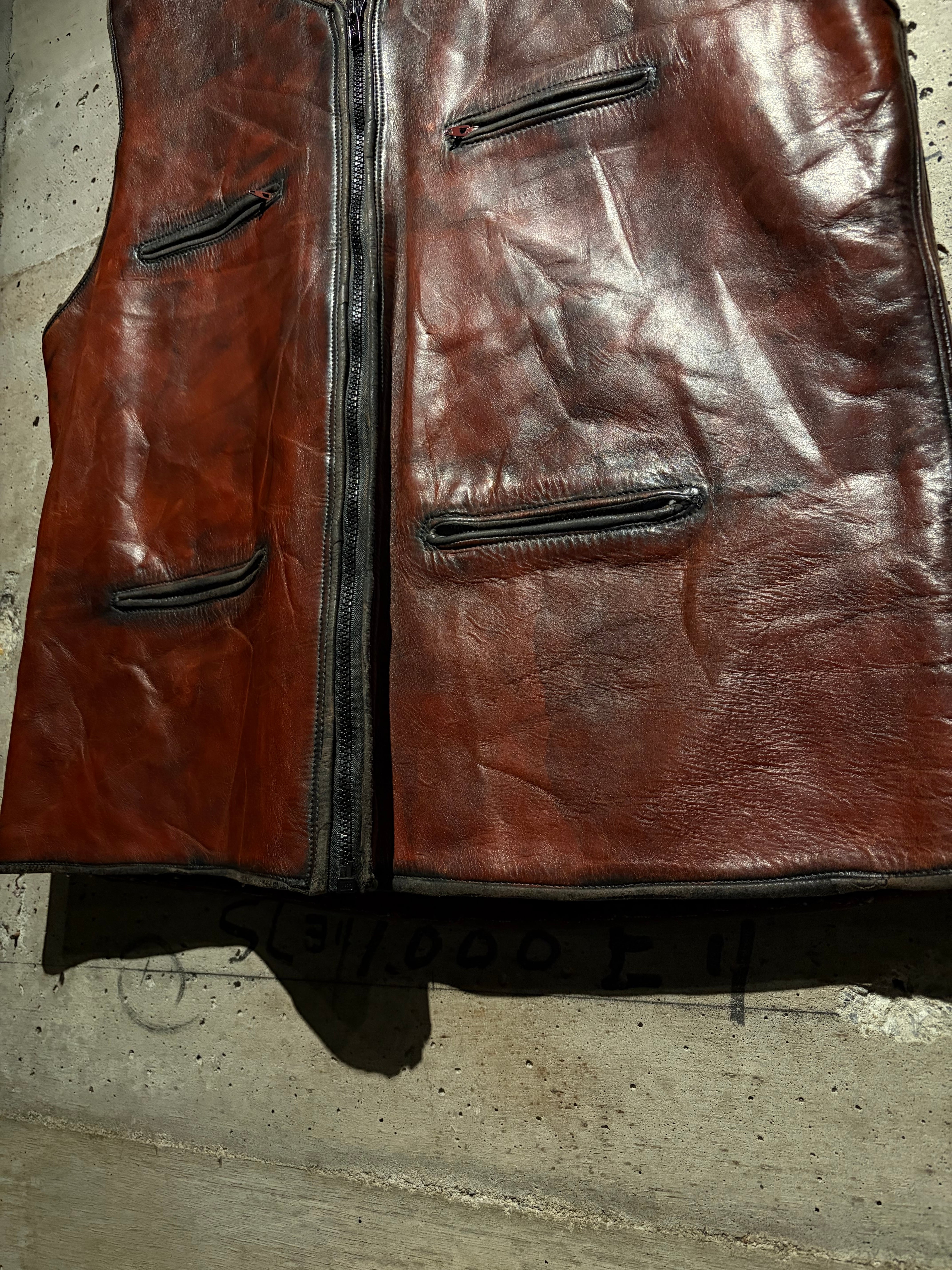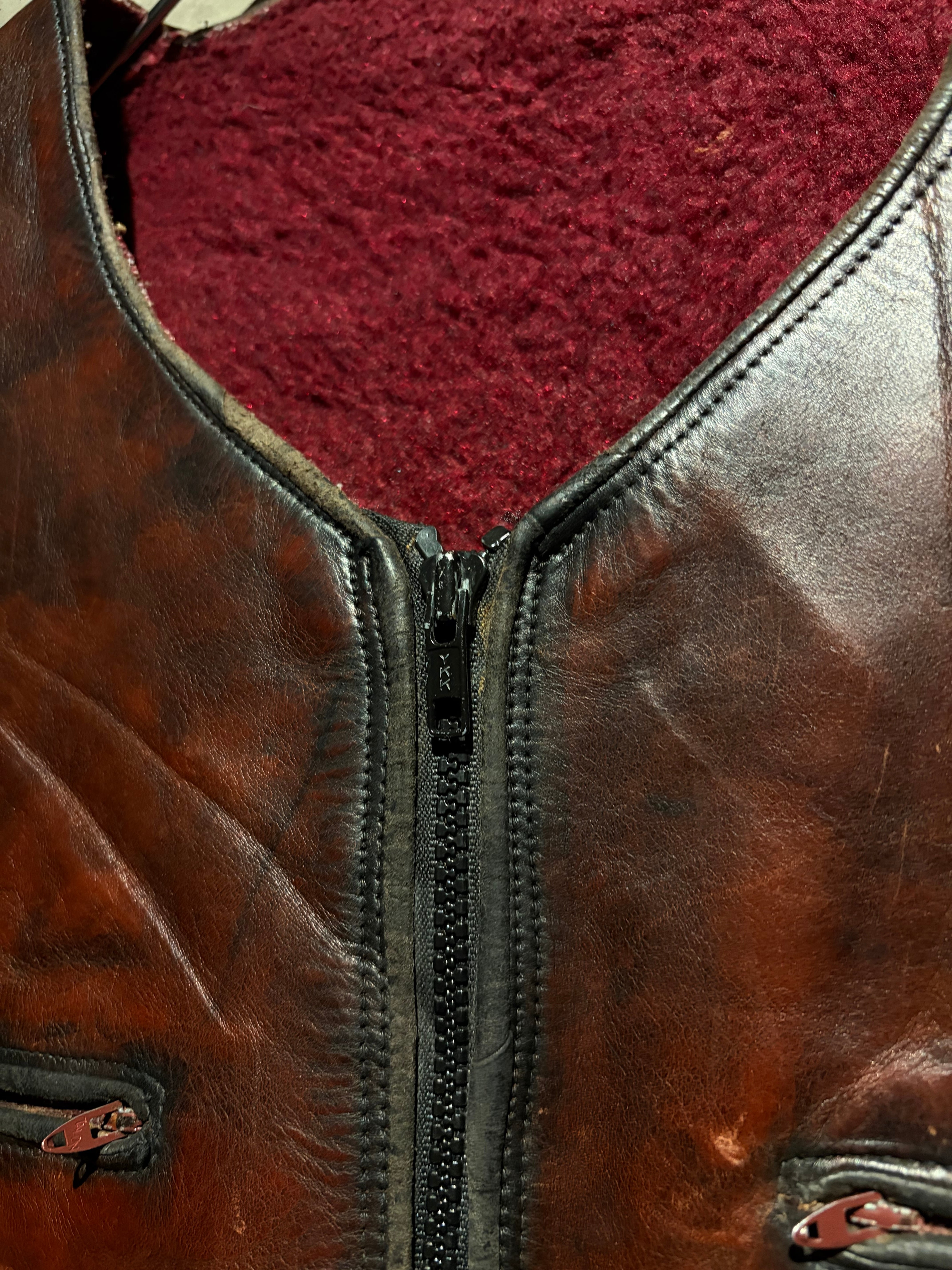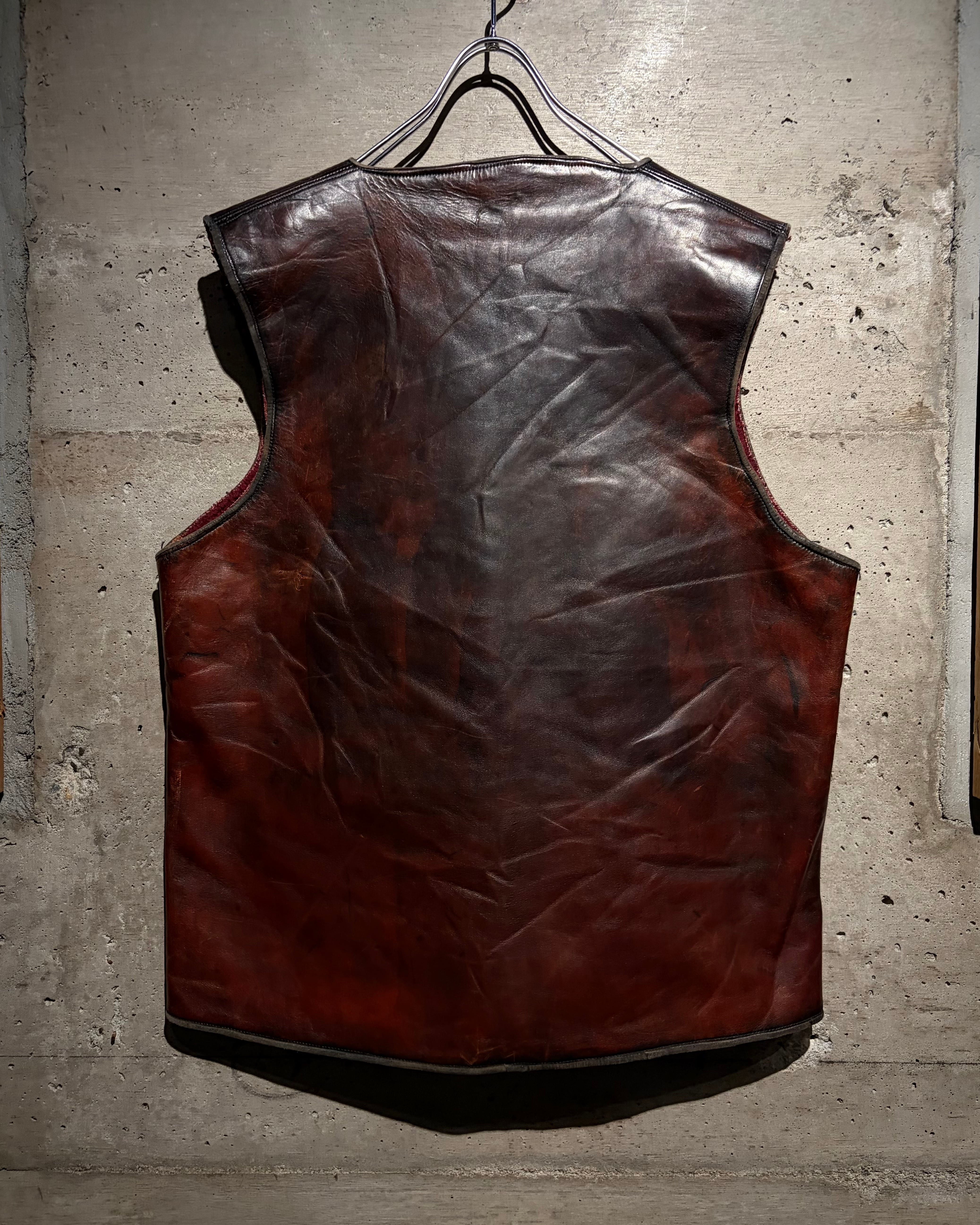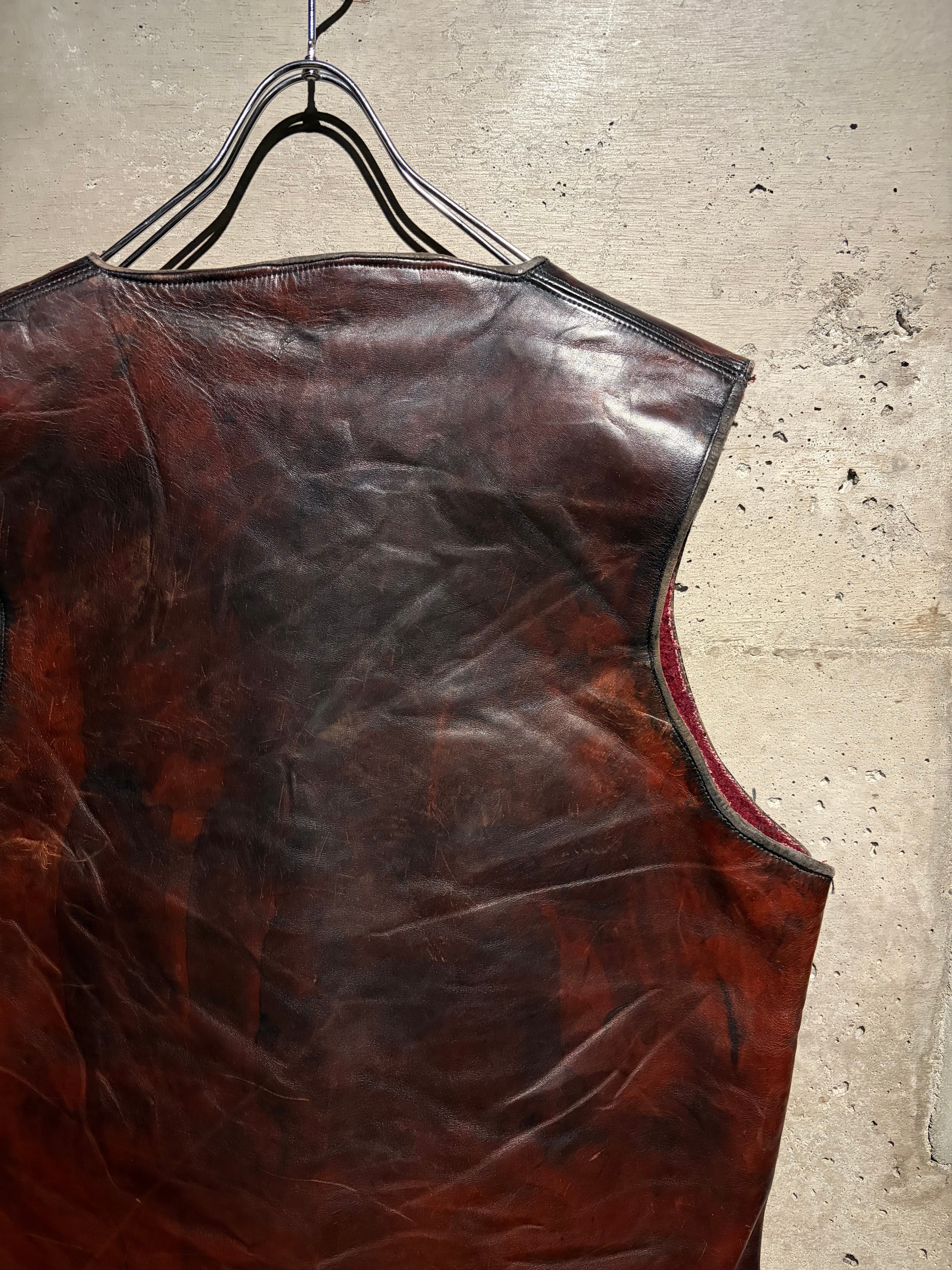 ハリのある艶やかな光沢を帯びた、褐色のレザーを用いた60年代〜70年代のレザーベスト。