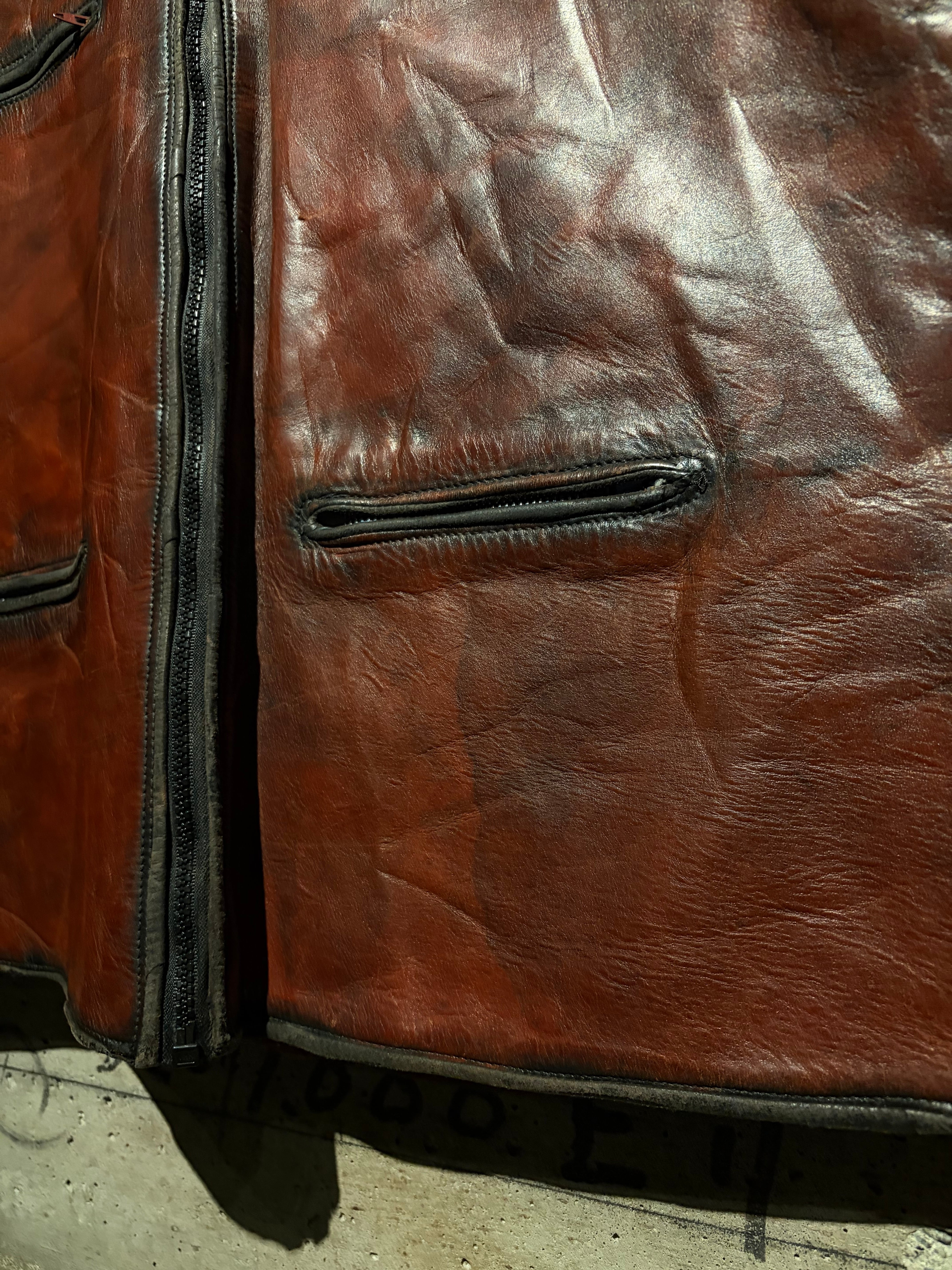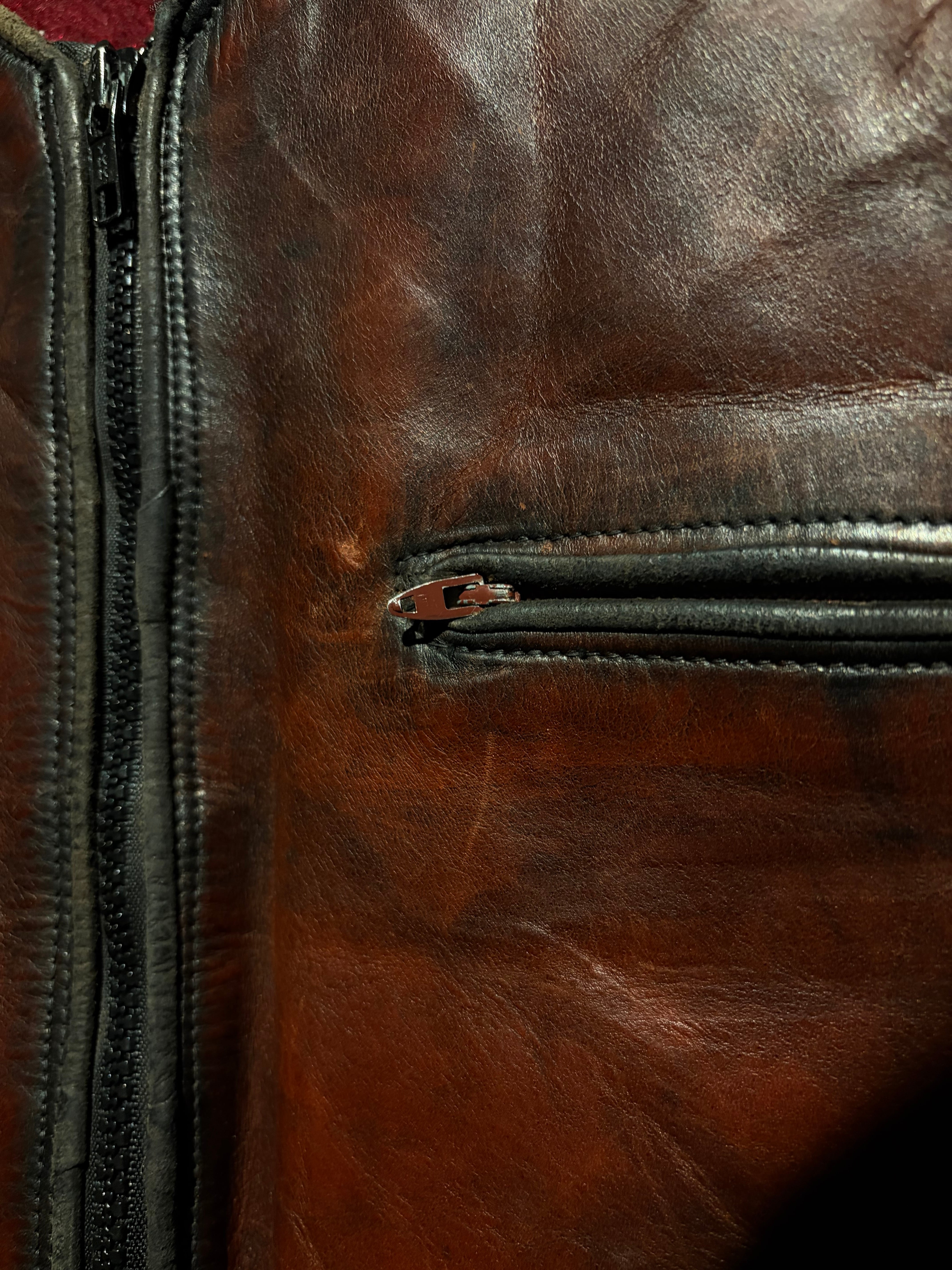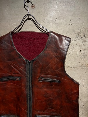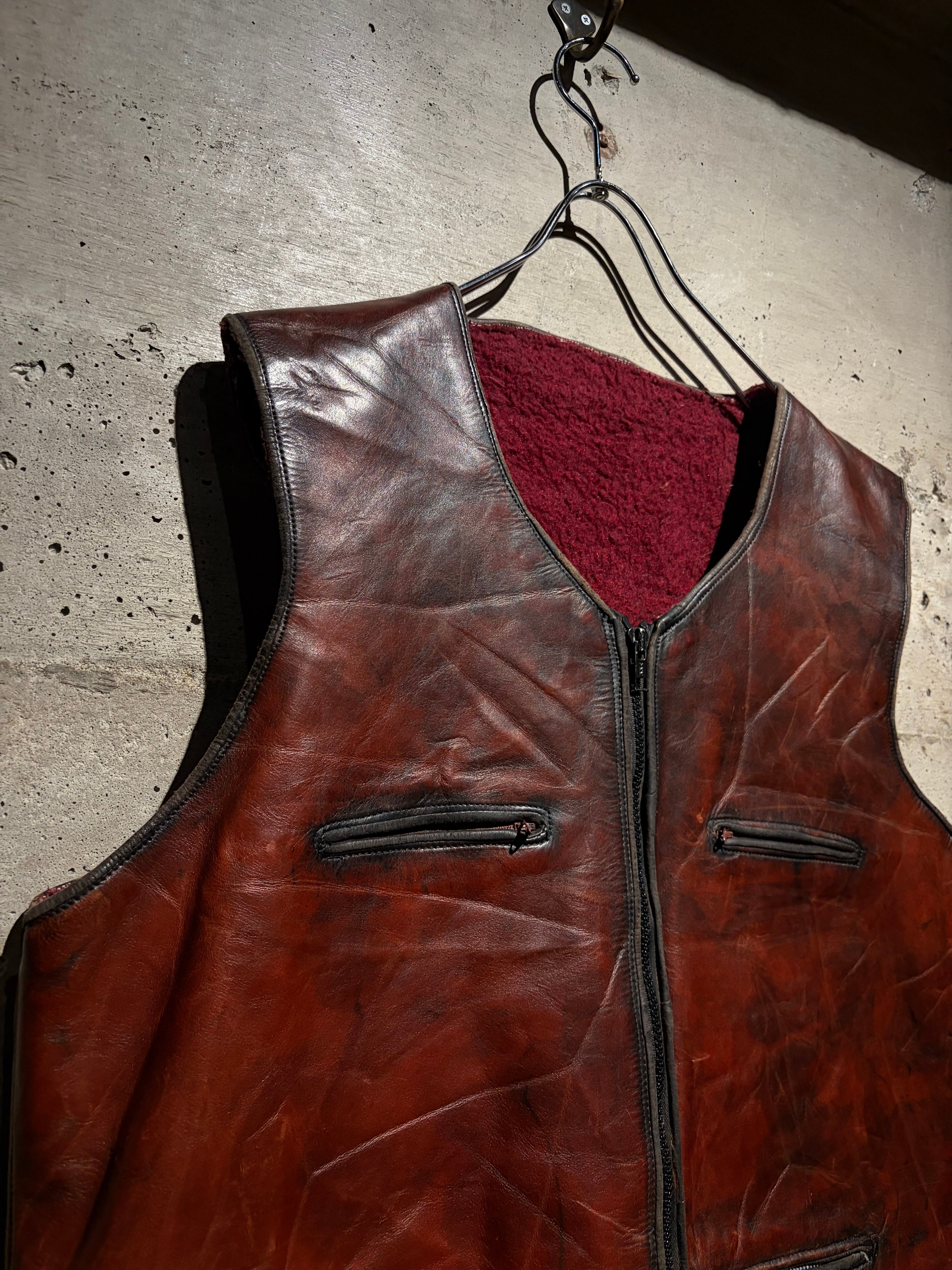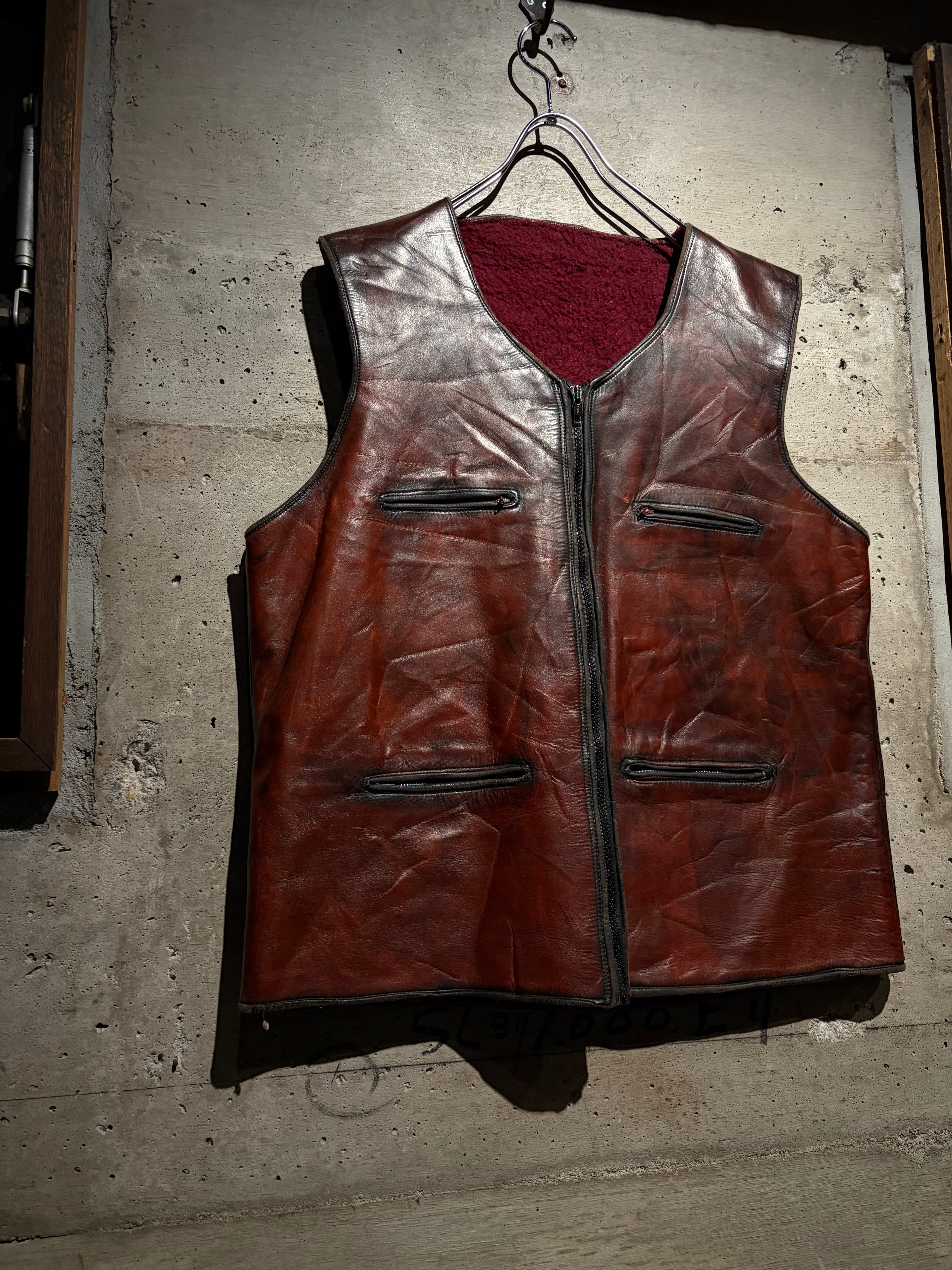 ハリのある艶やかな光沢を帯びた、褐色のレザーを用いた60年代〜70年代のレザーベスト。