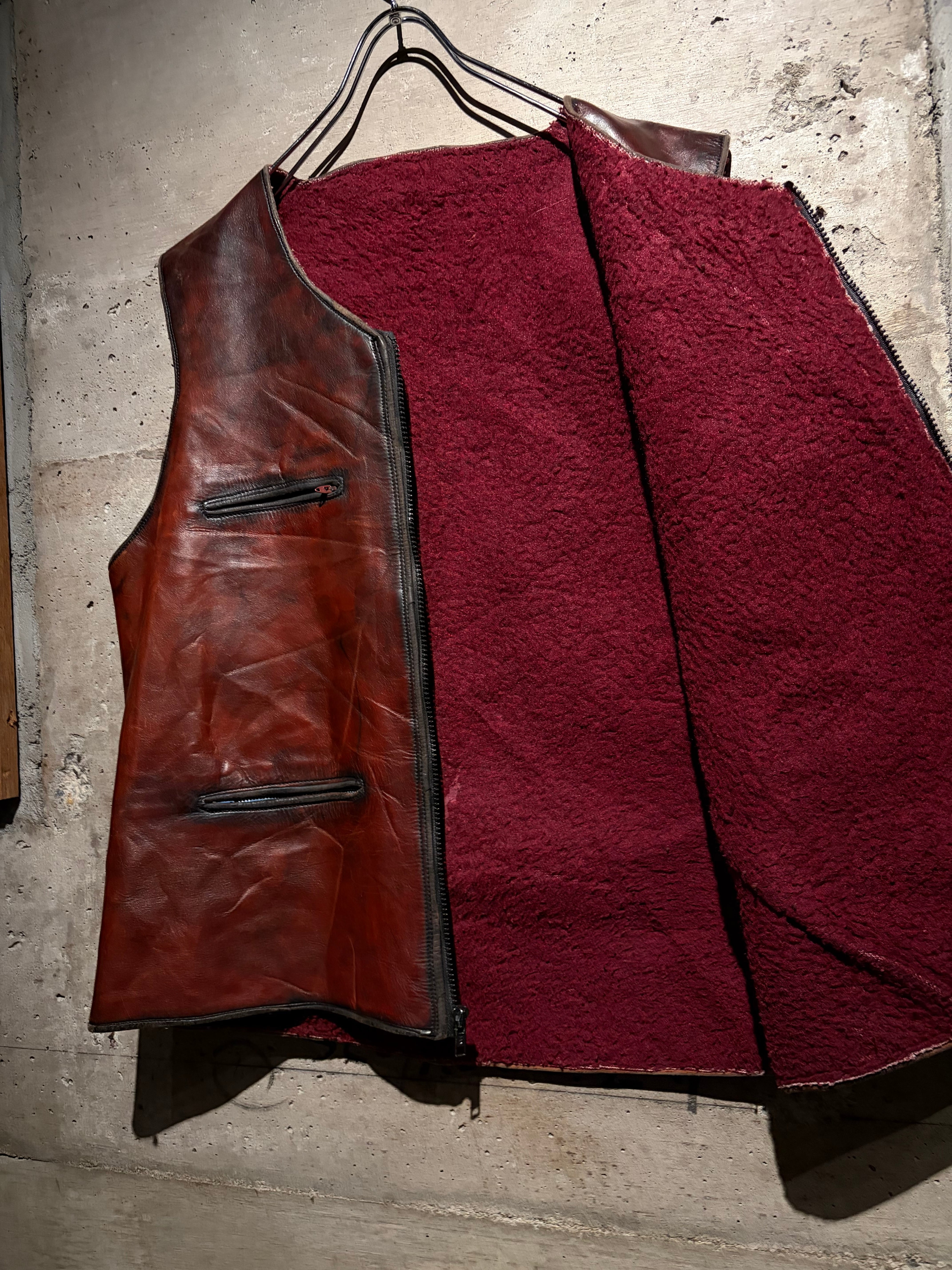 裏地には赤のボアを採用。視覚的なインパクトはもちろん、着用時の保温性も確保されています。レザー×ボアという素材の対比が、このベストならではのキャラクターを明確にしています。